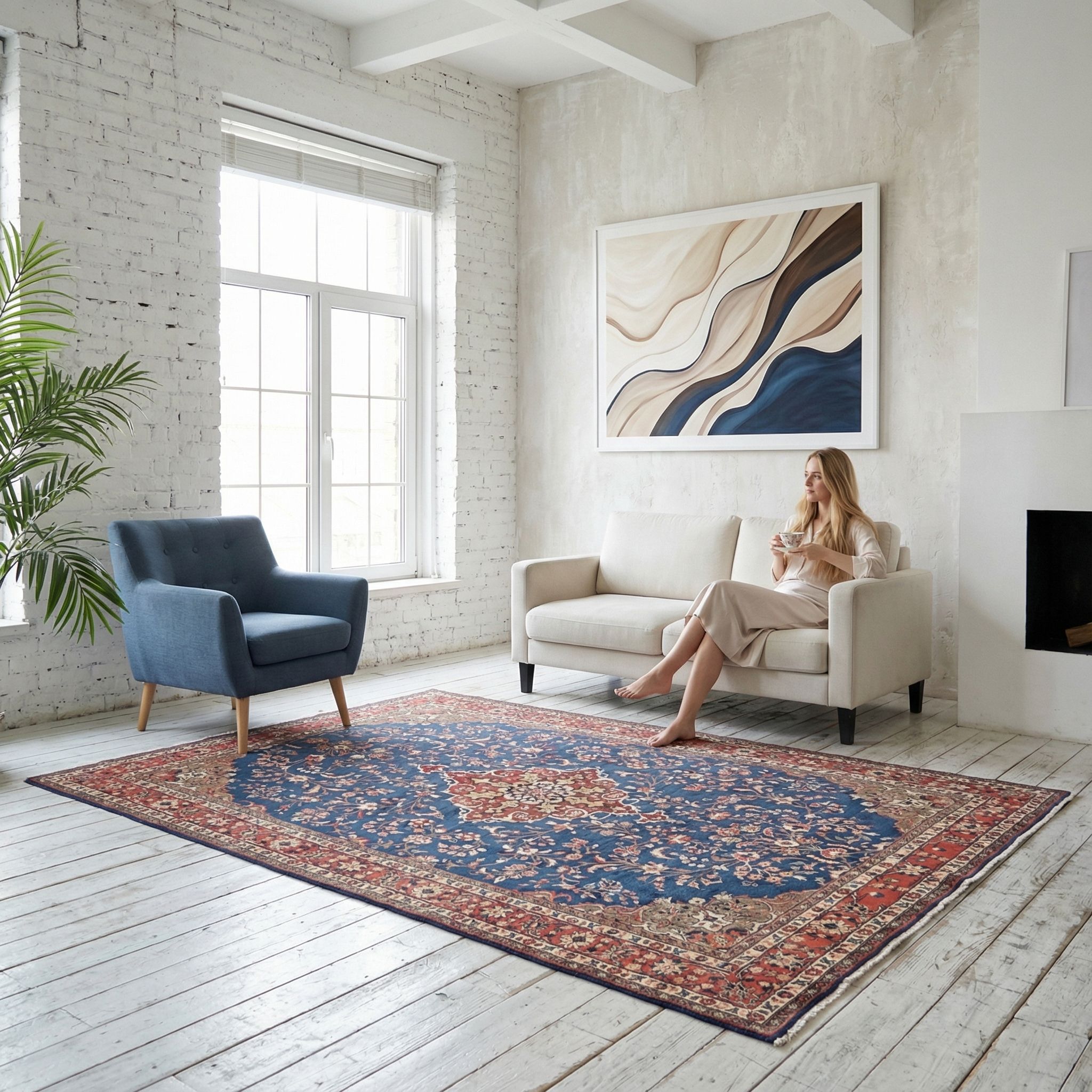 Dieser handgeknüpfte Mehraban-Teppich aus Persien besticht durch seine eindrucksvolle Farbkombination und exquisite Handwerkskunst. Die Hauptfarbe ist ein tiefes Blau, das dem Teppich eine edle und beruhigende Ausstrahlung verleiht. Ergänzt wird dieses Blau durch ein reiches Rubinrot, das vor allem im zentralen Medaillon und den umrahmenden Bordüren zur Geltung kommt. Dezente Beigetöne und erdige Brauntöne vervollständigen die harmonische Farbpalette und heben die floralen und geometrischen Muster elegant hervor.