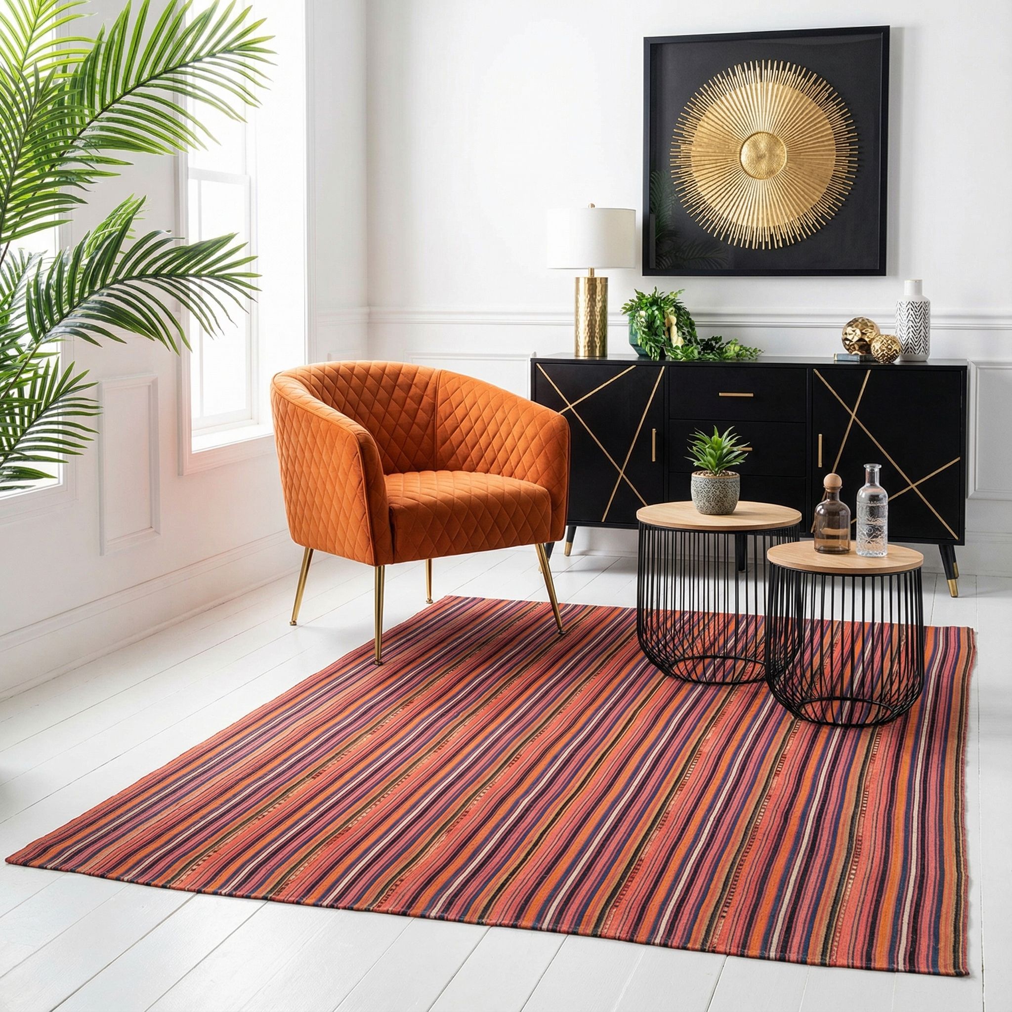 Dieser feine Djidjim Kelim aus Persien, handgewebt um 1940, präsentiert sich in einem harmonischen Farbspiel. Die Hauptfarbe ist ein warmes, lebendiges Rot, das durch tiefblaue und erdige Brauntöne ergänzt wird. Diese Farben verleihen dem Teppich eine einladende und zugleich elegante Ausstrahlung. Das Muster des Kelims ist geprägt von klaren, geometrischen Streifen, die in ihrer Anordnung eine dynamische Bewegung erzeugen. Jeder Streifen erzählt eine Geschichte von traditioneller ...mehr Beschreibung