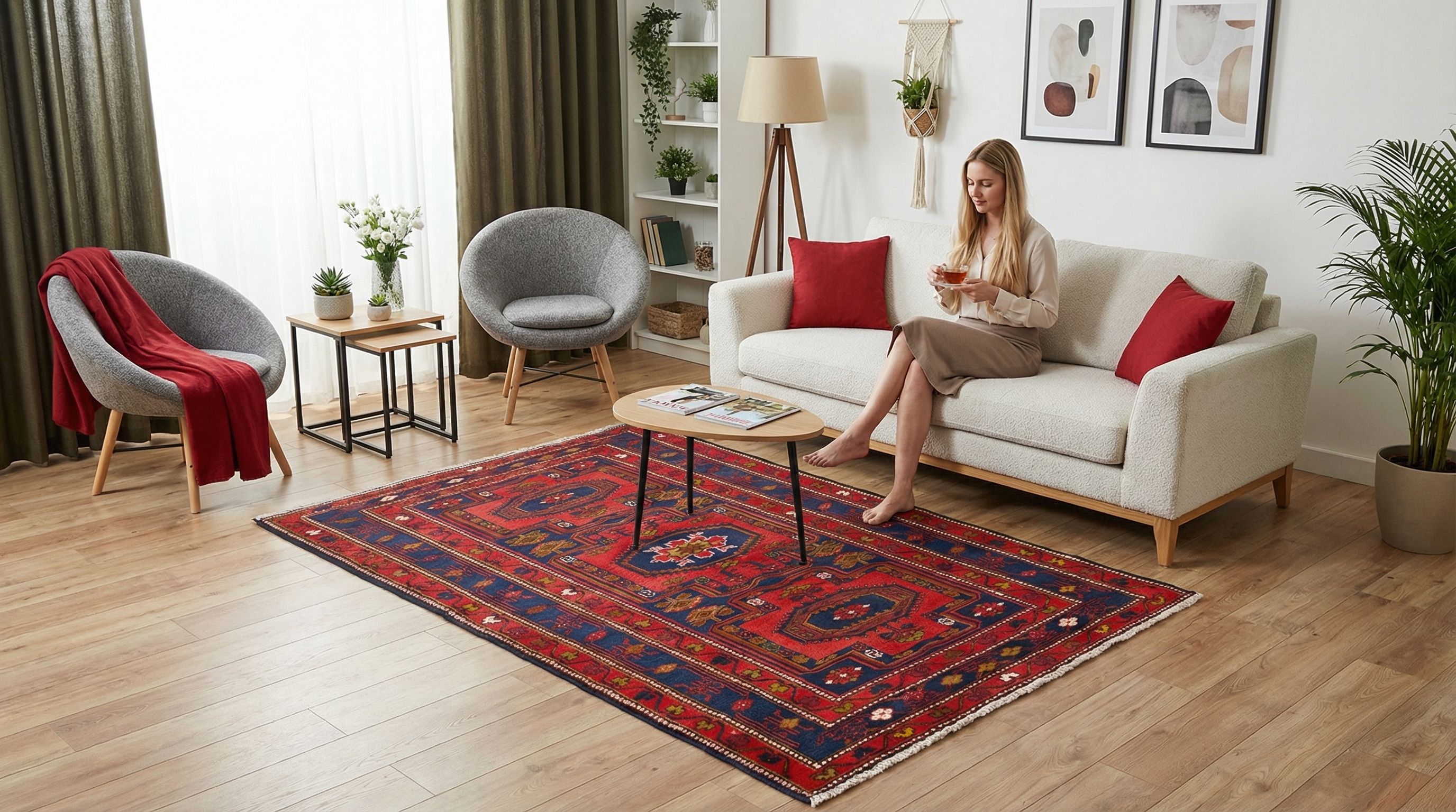 Dieser handgeknüpfte Derbent-Teppich aus Dagestan strahlt in einem kräftigen Rot, das sofort ins Auge fällt. Begleitet wird diese Hauptfarbe von einem tiefen Blau, das dem Design Tiefe und Eleganz verleiht. Dezente Akzente in Olivgrün und Weiß heben die Details des Musters hervor und verleihen dem Teppich eine harmonische Farbkomposition. Die Musterung zeigt das typische großflächige Sternmedaillon im Mittelfeld, umgeben von detailreichen Füllmotiven mit kleinen Vögeln, Hunden und ...mehr Beschreibung
