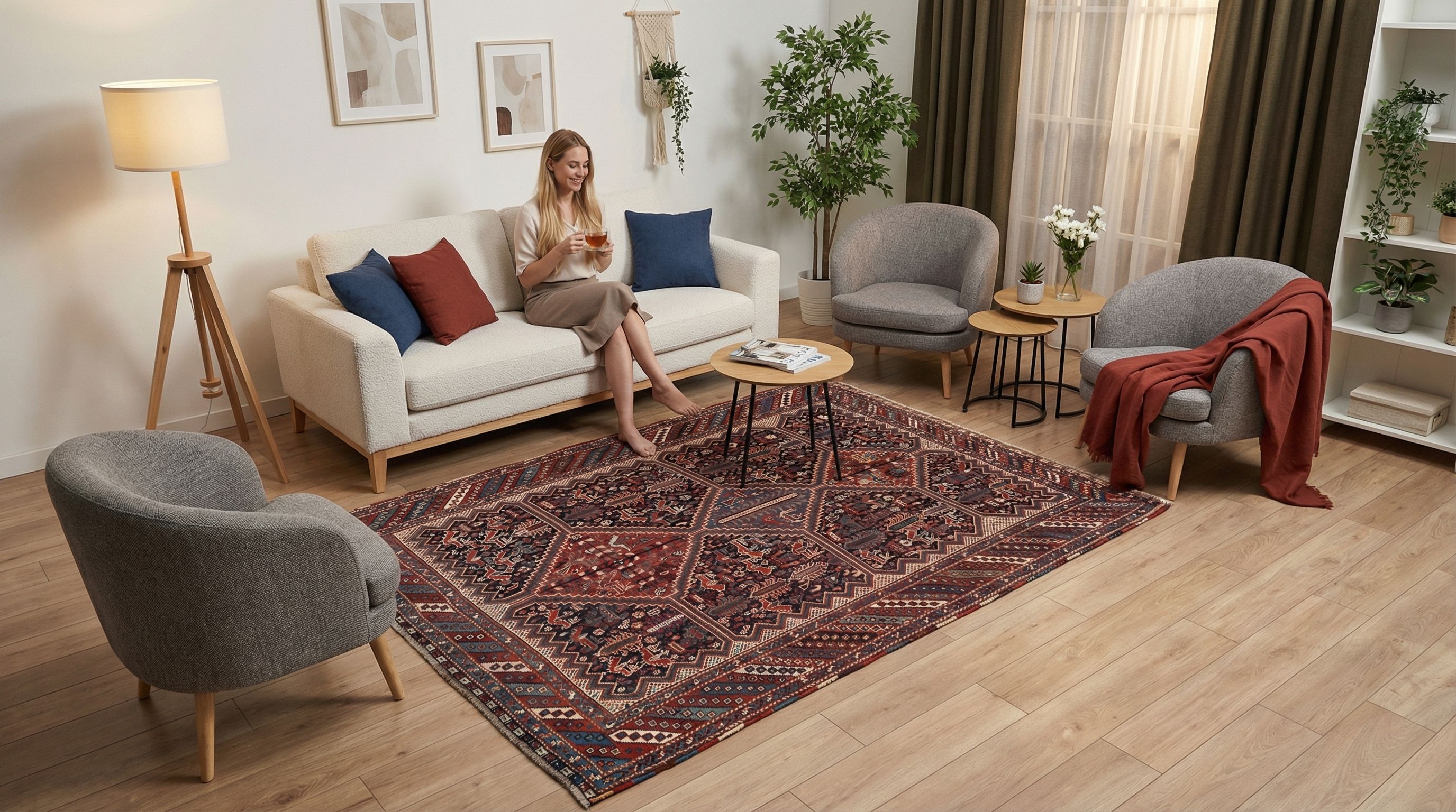Dieser antike Gaschgai-Shekarlu-Teppich aus Persien, um 1880, besticht durch seine außergewöhnliche Handwerkskunst und die Verwendung von natürlichen Materialien. Die Hauptfarbe ist ein intensives Rot, das dem Teppich seine lebendige Ausstrahlung verleiht. Ergänzt wird es durch ein tiefes Blau, das in den Hintergrundmotiven dominiert, sowie durch Akzente in Creme und einem satten Braun. Diese Farben schaffen eine harmonische und dennoch dynamische Komposition.Das Muster des Teppichs ist ...