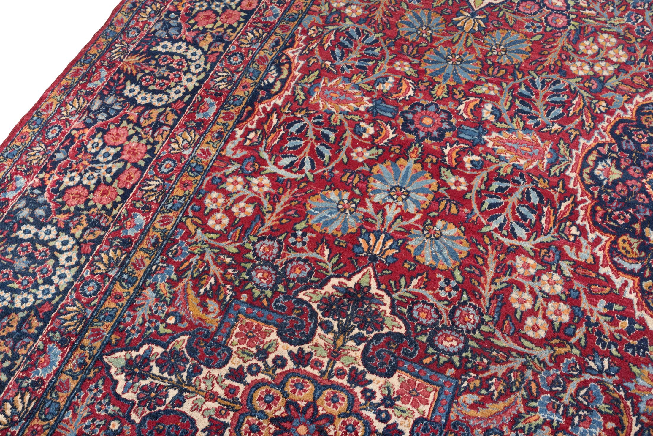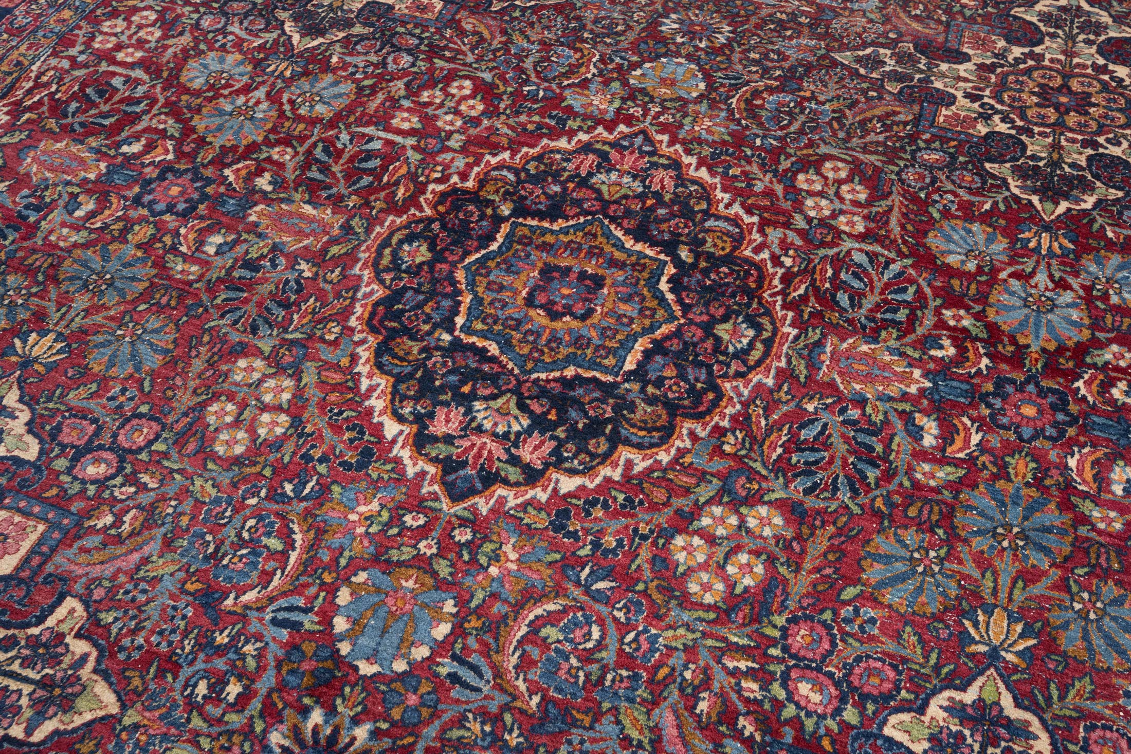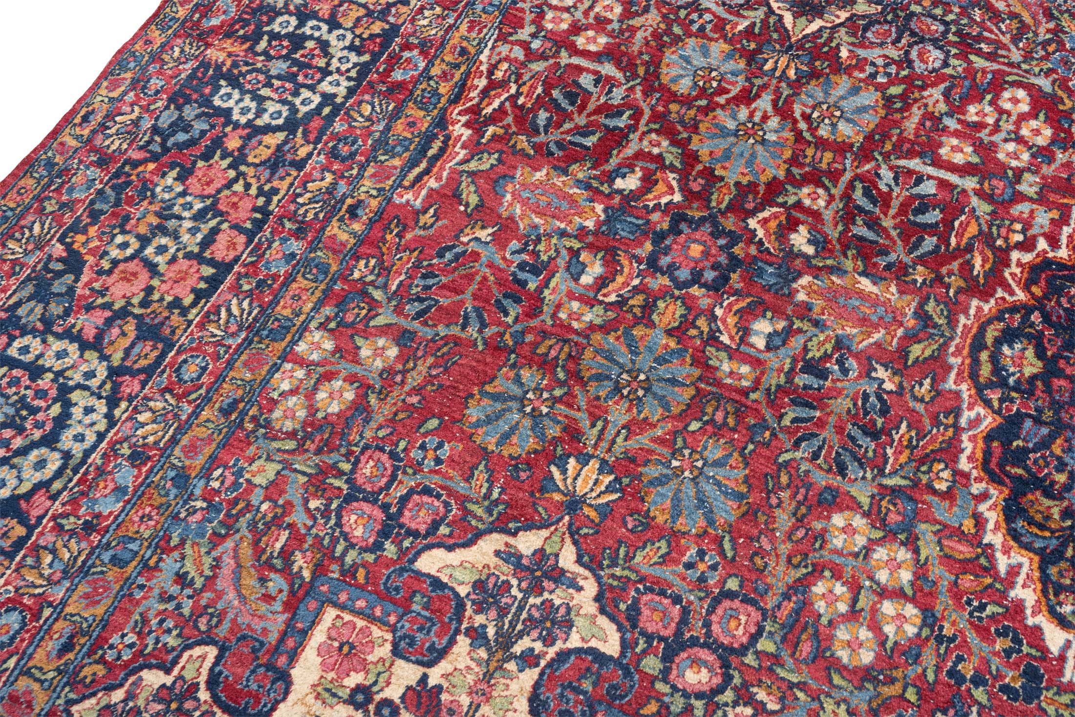 Dieser antike Kirman-Teppich aus Persien, um 1900, besticht durch seine Hauptfarbe Rot, begleitet von faszinierenden Akzenten in Blau und Creme. Die kunstvolle, florale Musterung verleiht ihm eine lebendige Ästhetik, die von der feinen Knüpfung mit beeindruckenden 280.000 Knoten per Quadratmeter zeugt. Das Medaillon-Muster, typisch für Kirman-Teppiche, ist ein herausragendes Merkmal, das in diesem Stück besonders edel zur Geltung kommt. Hergestellt ausschließlich aus natürlichen Materialien und Pflanzenfarben, zeigt der Teppich stellenweise einen dünneren Flor, was seinen mittleren Erhaltungszustand unterstreicht. Trotz der historischen Herausforderungen der Teppichproduktion in dieser Region, steht Kirman bis heute für exquisite Handwerkskunst. Dieser Teppich erzählt die Geschichte einer reichen Tradition und bringt mit seinen fröhlichen Farben und detailreichen Mustern eine einladende Atmosphäre in Ihr Zuhause.