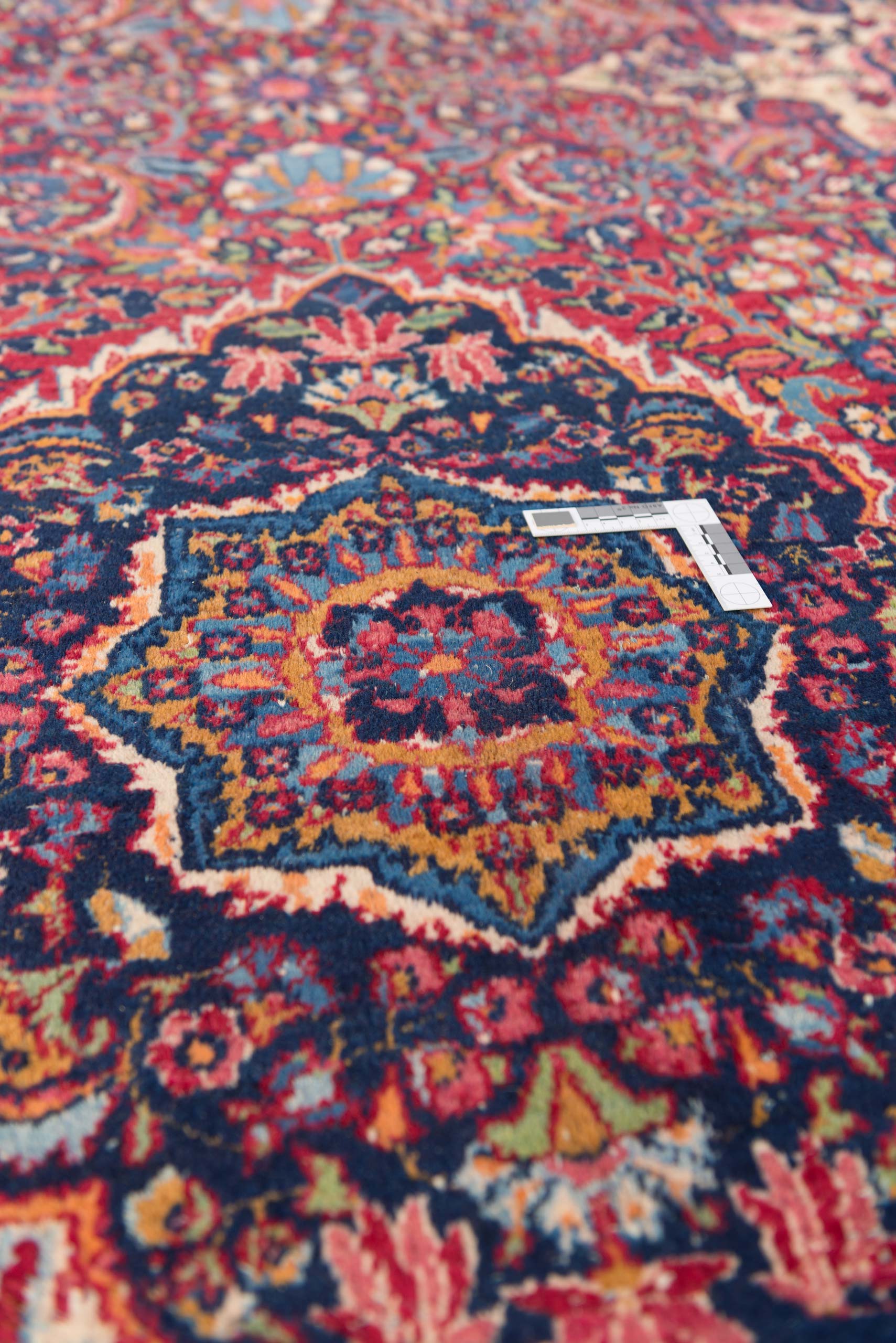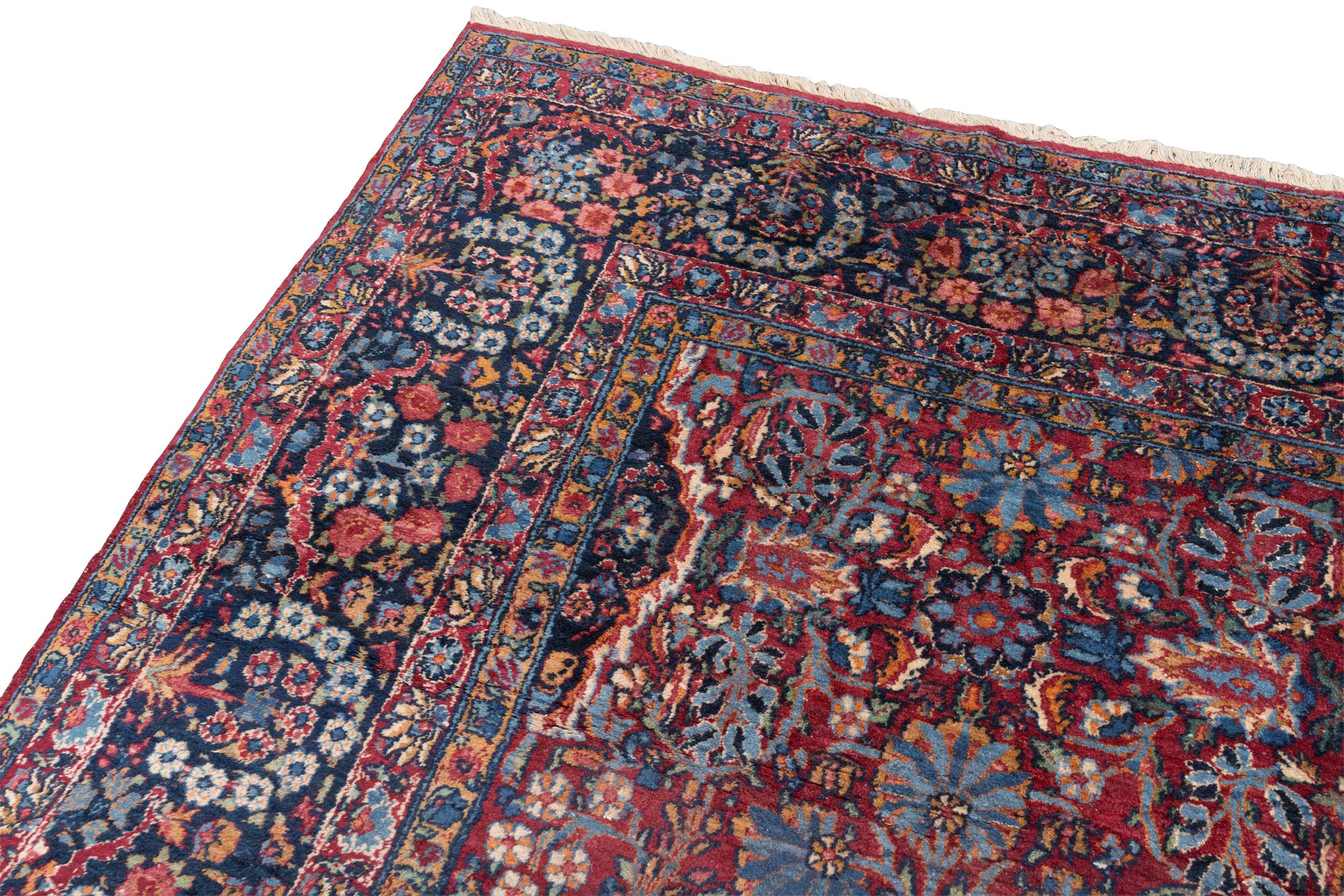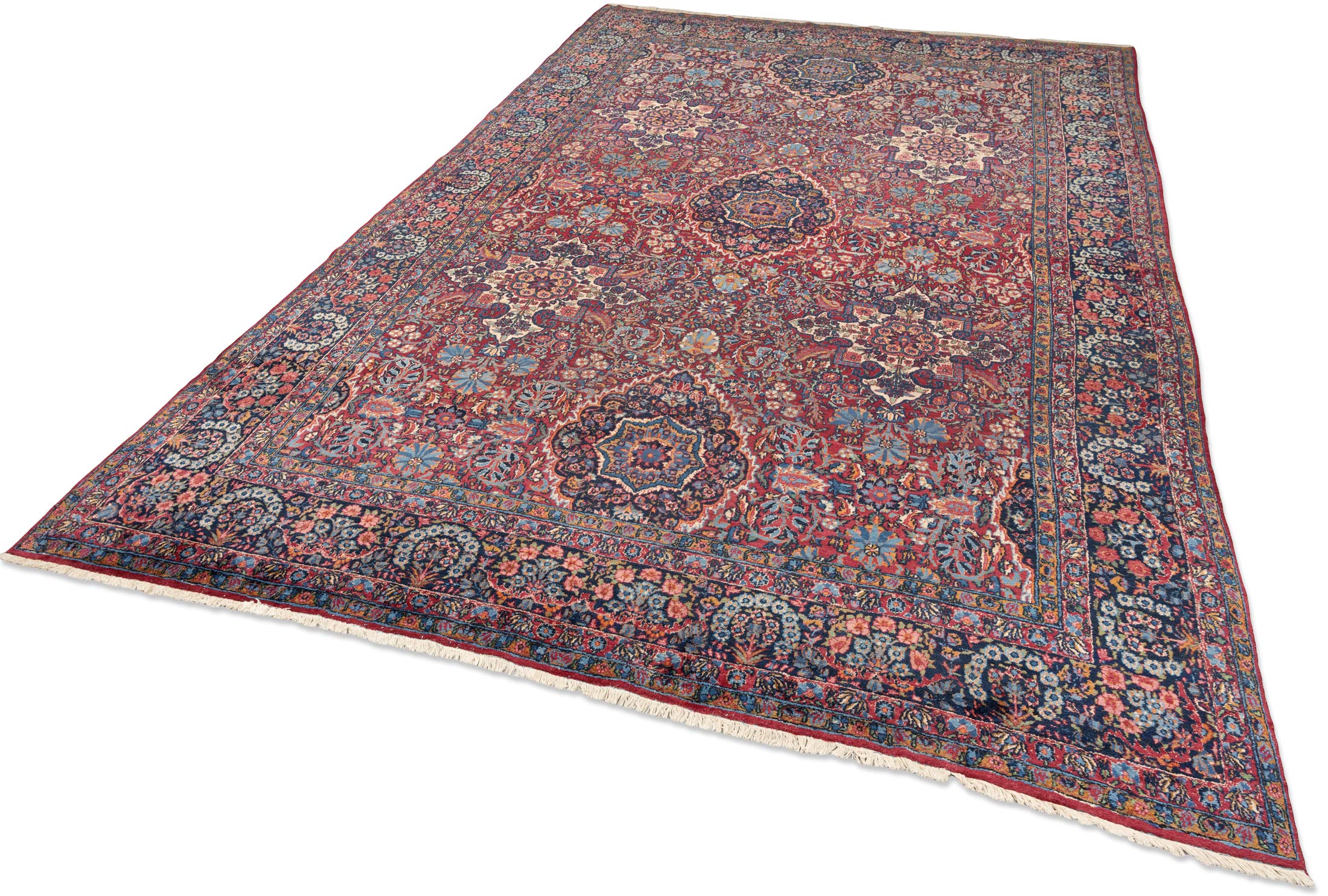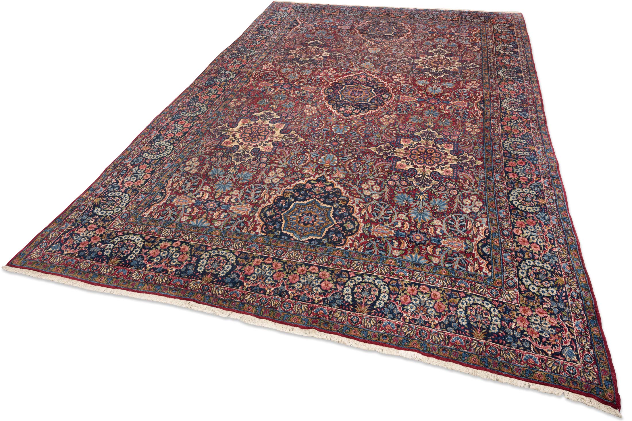 Dieser antike Kirman-Teppich aus Persien, um 1900, besticht durch seine Hauptfarbe Rot, begleitet von faszinierenden Akzenten in Blau und Creme. Die kunstvolle, florale Musterung verleiht ihm eine lebendige Ästhetik, die von der feinen Knüpfung mit beeindruckenden 280.000 Knoten per Quadratmeter zeugt. Das Medaillon-Muster, typisch für Kirman-Teppiche, ist ein herausragendes Merkmal, das in diesem Stück besonders edel zur Geltung kommt. Hergestellt ausschließlich aus natürlichen Materialien und Pflanzenfarben, zeigt der Teppich stellenweise einen dünneren Flor, was seinen mittleren Erhaltungszustand unterstreicht. Trotz der historischen Herausforderungen der Teppichproduktion in dieser Region, steht Kirman bis heute für exquisite Handwerkskunst. Dieser Teppich erzählt die Geschichte einer reichen Tradition und bringt mit seinen fröhlichen Farben und detailreichen Mustern eine einladende Atmosphäre in Ihr Zuhause.