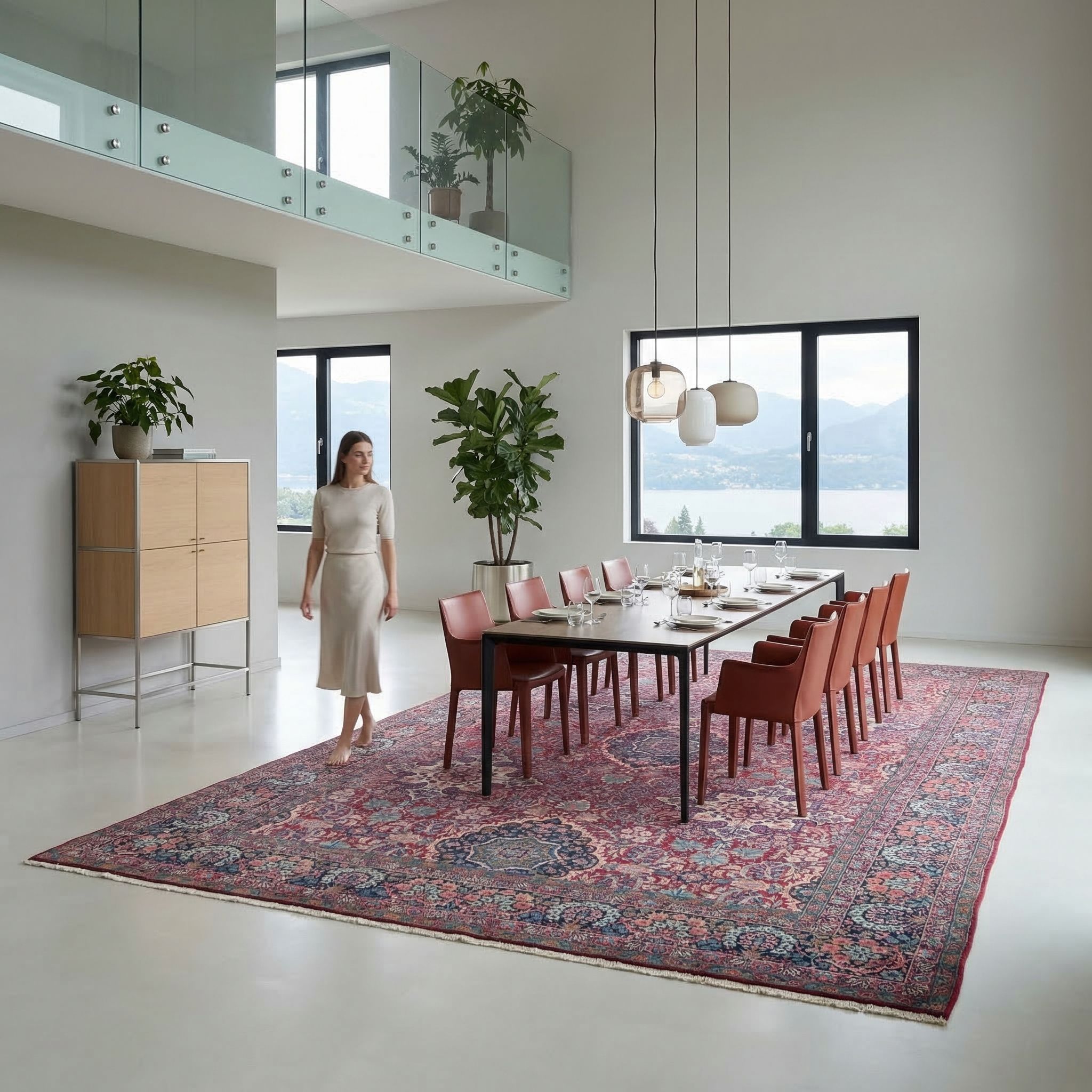 Setzen Sie diesen feinen Kirman als bewussten und spannenden Stilbruch ein, um der kühlen Strenge von Beton, Stahl und unverputzten Wänden entgegenzuwirken. Die filigrane florale Musterung und die warmen Rottöne bilden einen weichen, luxuriösen Kontrast zur rauen Ästhetik des Industrial-Lofts. Gerade der mittlere Erhaltungszustand mit dem stellenweise dünneren Flor passt hervorragend zum unperfekten, ehrlichen Charme alter Fabrikhallen. So wird der antike Teppich zur emotionalen Insel im Raum, die Modernität mit historischer Beständigkeit verbindet.