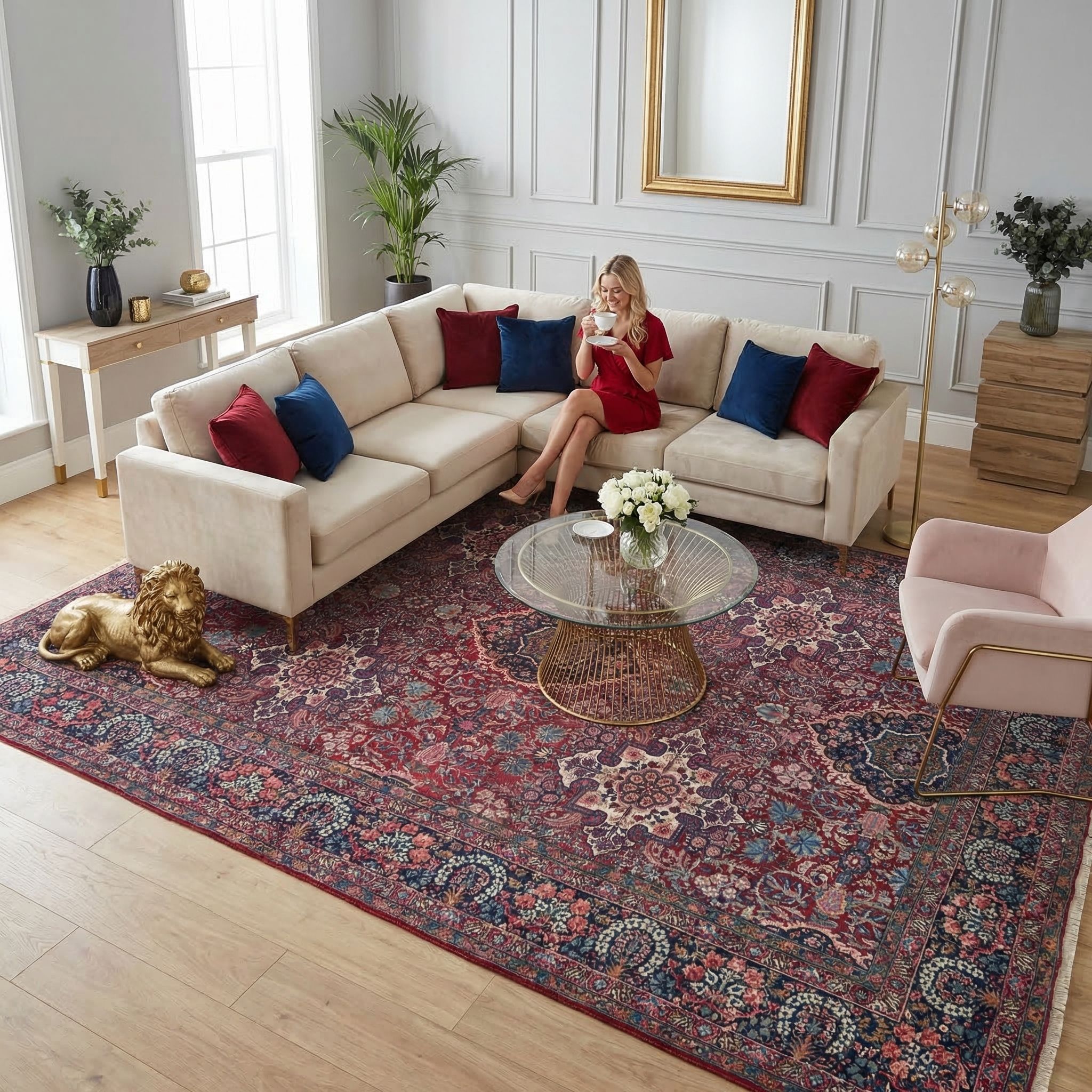 Da Kirman-Teppiche einst auf Weltausstellungen wie in Paris für ihre Pracht gefeiert wurden, ist dieses Exemplar die ideale Basis für den luxuriösen Glam-Style. Die tiefen, satten Farben und das komplexe Medaillon-Muster korrespondieren hervorragend mit Samtsofas, goldenen Akzenten und spiegelnden Oberflächen. Die feine Verarbeitung und das antike Alter strahlen eine Exklusivität aus, die in einem glamourösen Salon unverzichtbar ist. Dieser Teppich ist ein Statement von Reichtum und Geschmack, das Ihrem Interieur eine königliche und dramatische Note verleiht.
