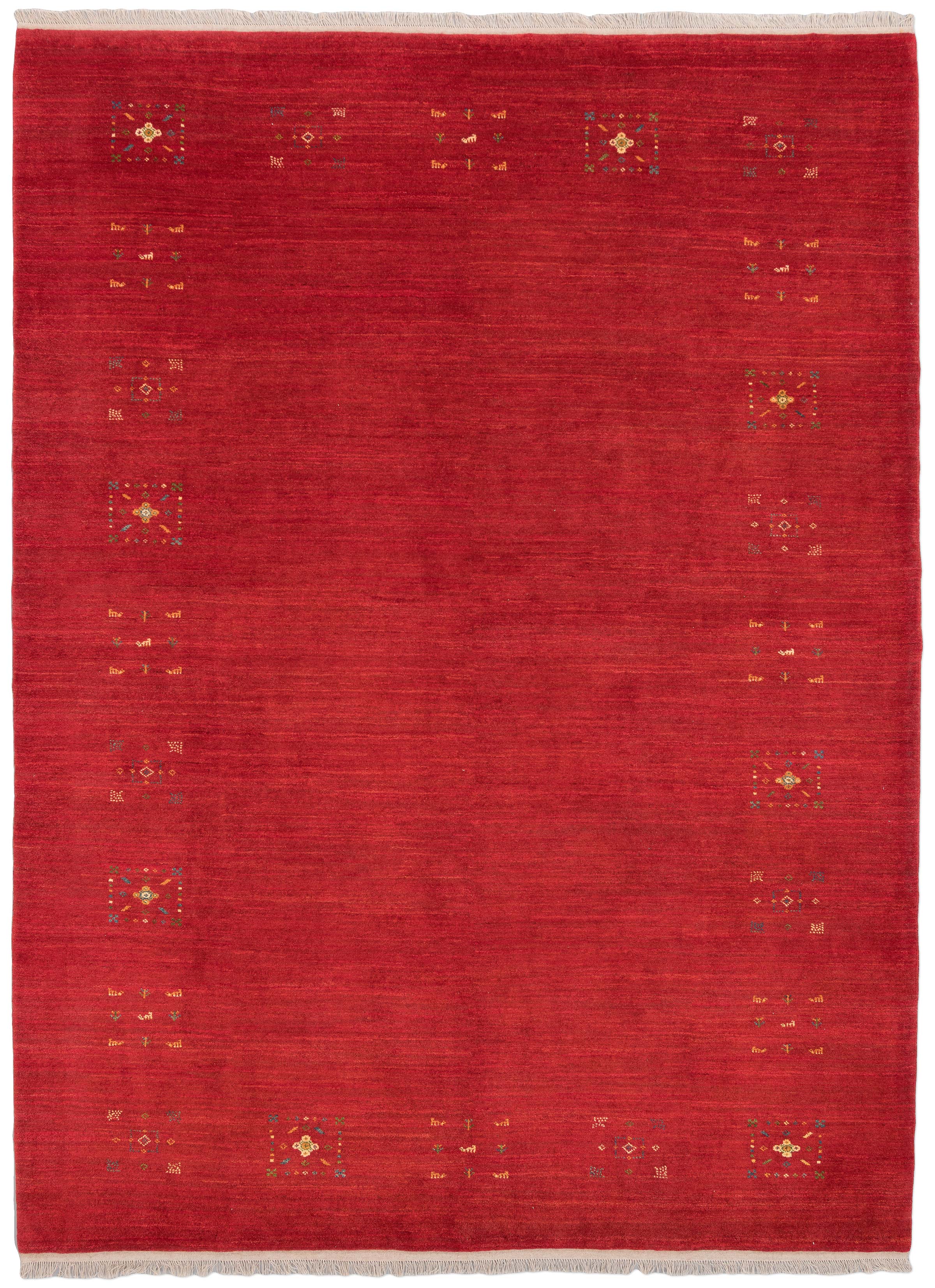 Der echte persische Gabbeh ist ein qualitativ hochwertiger wolliger und eher hochfloriger Nomaden-Teppich aus Südpersien, Provinz Fars. Die Originale werden hauptsächlich in der Umgebung von Shiraz von Ghashgai-Nomaden und Halbnomaden geknüpft. Der mystische Musterschatz alter Nomadenvölker ist so arrangiert, dass eine sehr moderne Bildwirkung entsteht.