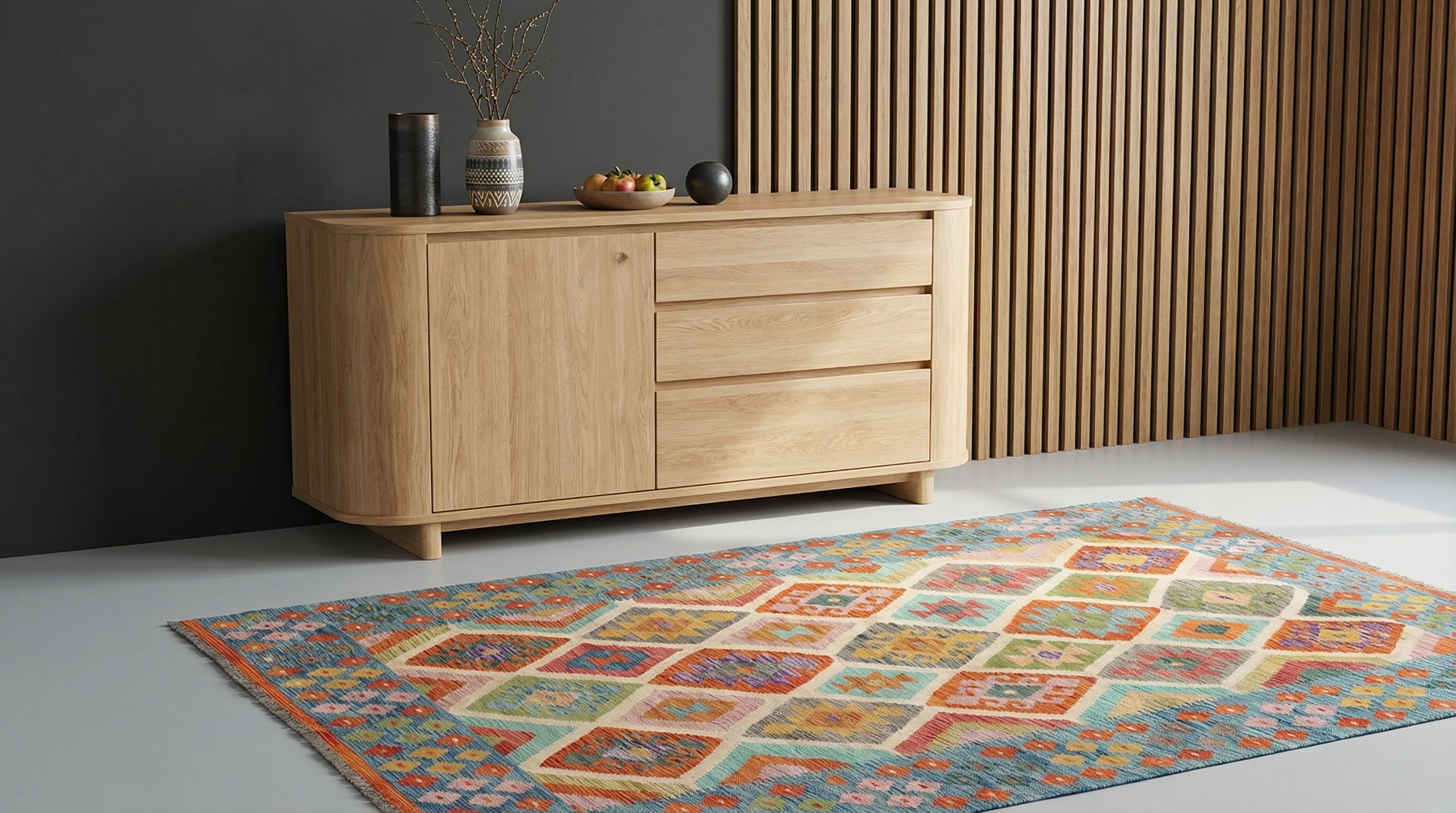 Hier präsentieren wir Ihnen einen exquisiten handgewebten Kelim aus Afghanistan, der mit seinem lebendigen Farbspiel und traditionellen Mustern beeindruckt. Die Hauptfarbe dieses Teppichs ist ein warmes Orange, das für eine einladende Atmosphäre sorgt. Begleitet wird es von einem kräftigen Blau und einem erdigen Olivgrün, die dem Design Tiefe und Charakter verleihen. Ein Hauch von sanftem Rosa ergänzt die Farbpalette harmonisch. Diese Kombination aus Naturfarben bringt die ...mehr Beschreibung