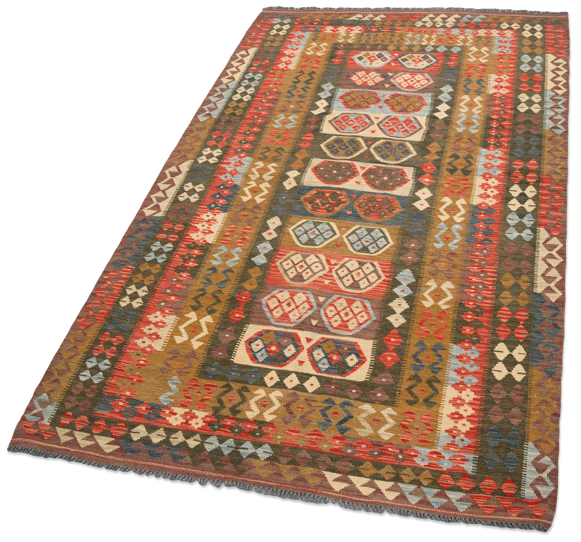 Hier präsentieren wir einen faszinierenden handgewebten Ghazghar Kelim aus Afghanistan, der mit seiner warmen und einladenden Farbpalette jeden Raum bereichert. Die Hauptfarbe dieses einzigartigen Teppichs ist ein erdiges Olivgrün, das durch kräftige Akzente in Rot und Himmelblau zum Leben erweckt wird. Cremefarbene Elemente verleihen dem Design eine harmonische Balance. Die Musterung ist typisch für Nomadenkulturen, mit geometrischen Formen und traditionellen Symbolen, die eine Geschichte von Handwerkskunst und Tradition erzählen.