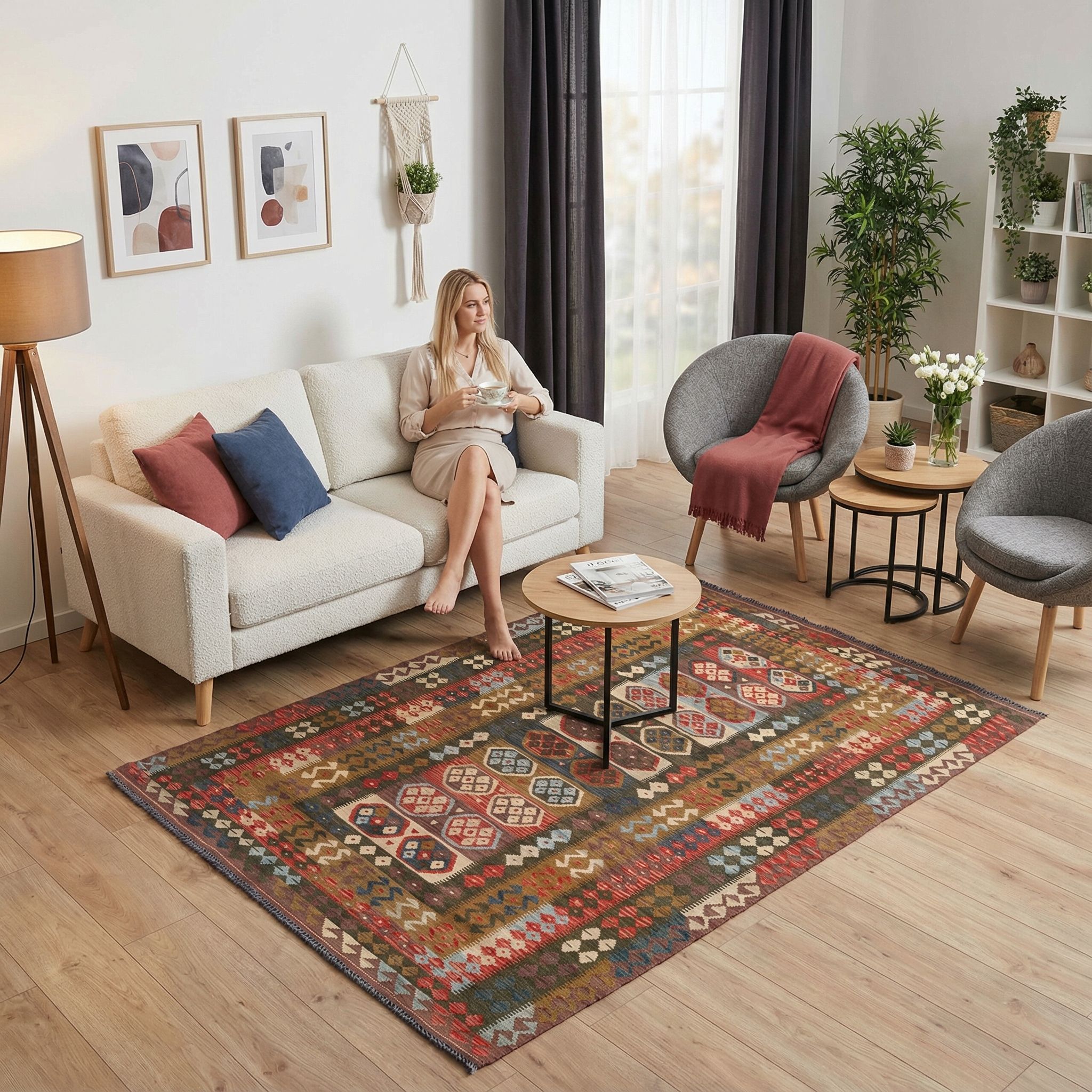 Hier präsentieren wir einen faszinierenden handgewebten Ghazghar Kelim aus Afghanistan, der mit seiner warmen und einladenden Farbpalette jeden Raum bereichert. Die Hauptfarbe dieses einzigartigen Teppichs ist ein erdiges Olivgrün, das durch kräftige Akzente in Rot und Himmelblau zum Leben erweckt wird. Cremefarbene Elemente verleihen dem Design eine harmonische Balance. Die Musterung ist typisch für Nomadenkulturen, mit geometrischen Formen und traditionellen Symbolen, die eine Geschichte ...mehr Beschreibung