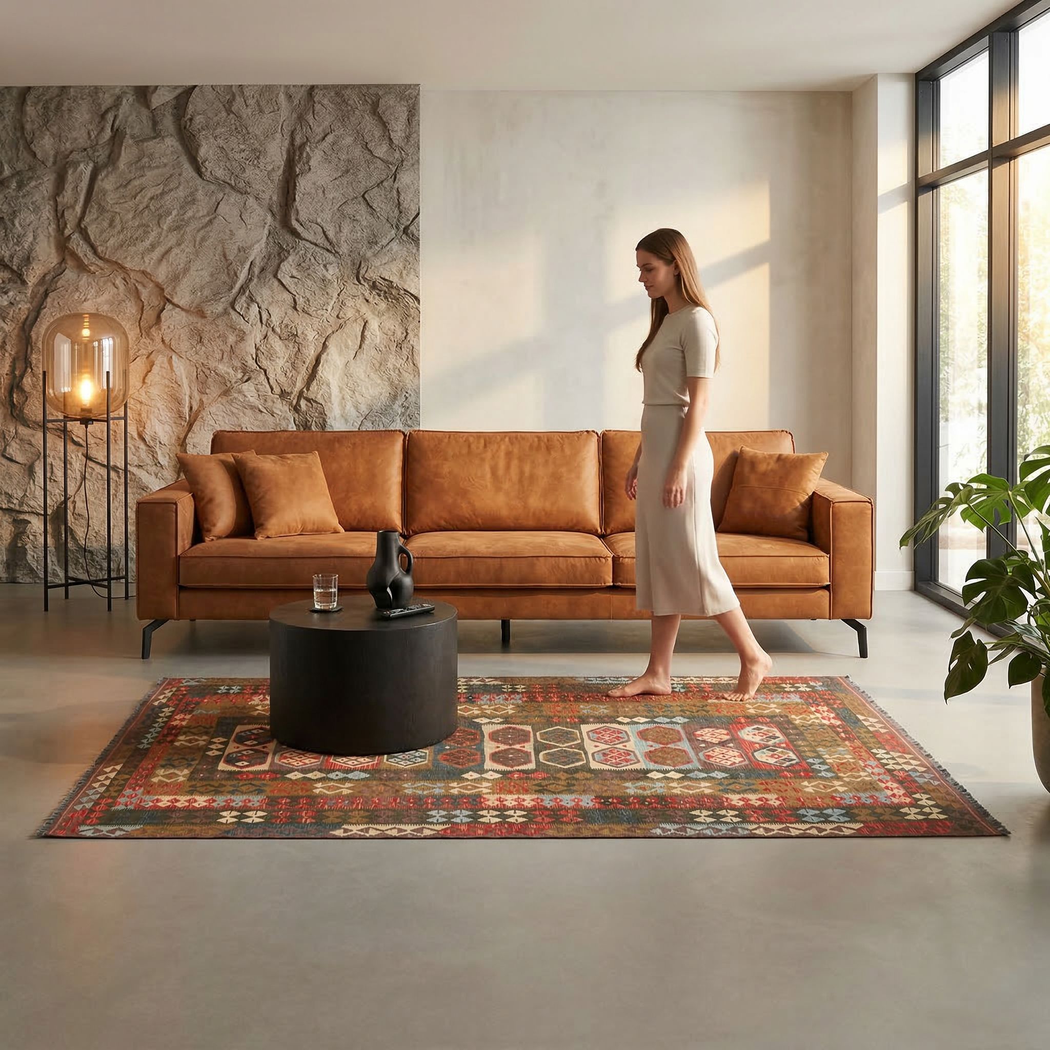 Der natürliche Charme der handversponnenen Schafwolle und die warme, erdige Farbgebung machen diesen Kelim zum harmonischen Begleiter für den gemütlichen New-Country-Style. Seine rustikale Textur und der bodenständige Charakter ergänzen helle Holzmöbel, Leinenstoffe und die entspannte Atmosphäre eines modernen Landhauses auf ideale Weise. Die traditionelle Herstellung im Hausfleiß unterstreicht die Wertschätzung für nachhaltige und langlebige Materialien, die diesem Wohnkonzept zugrunde liegt. Mit seiner behaglichen Ausstrahlung verwandelt der Teppich jeden Raum in eine Wohlfühloase, die Geborgenheit und natürliche Eleganz ausstrahlt.