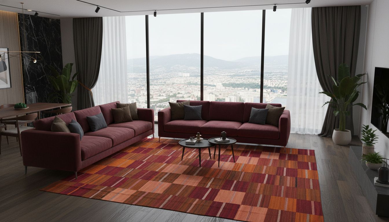 Dieser handgewebte Kelim aus Afghanistan, bekannt als Tavis, beeindruckt durch seine harmonische Farbgebung und das moderne Design. Die Hauptfarbe ist ein reiches Bordeauxrot, das dem Teppich eine warme und einladende Ausstrahlung verleiht. Ergänzt wird diese durch ein lebhaftes Orange und ein erdiges Braun, die zusammen ein lebendiges und dennoch ausgewogenes Farbschema schaffen. Die Musterung des Kelims besteht aus geometrischen, rechteckigen Formen, die an das künstlerische Erbe von ...mehr Beschreibung
