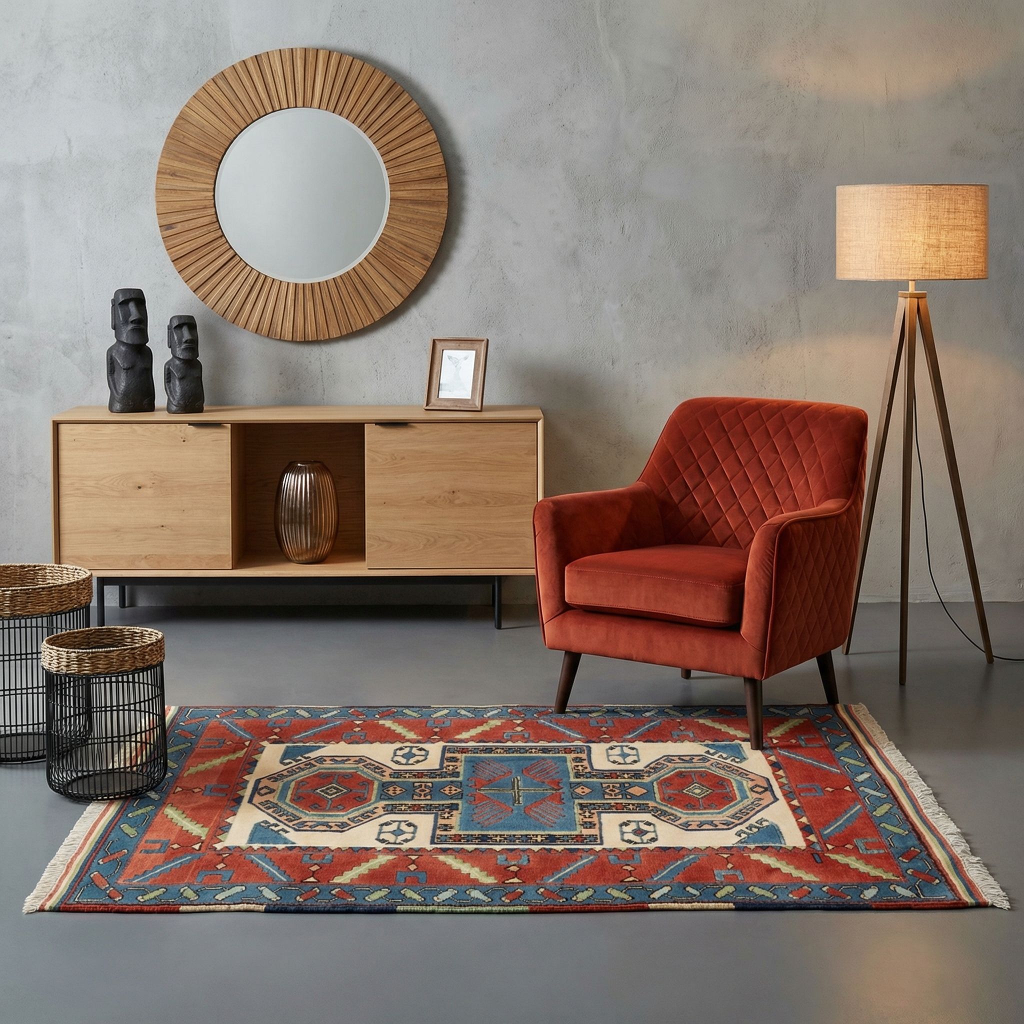 Dieser Teppich ist wie geschaffen für den Ethno-Style, da er mit seinen antiken Motiven und den geometrischen Mustern genau die kulturelle Vielfalt widerspiegelt, die diesen Wohnstil ausmacht. Die Verwendung von reiner Schafwolle und Naturfarben unterstreicht die Liebe zum ursprünglichen Handwerk und zu authentischen Materialien aus aller Welt. Durch die kräftigen Rot- und Blautöne wird der Teppich zum zentralen Blickfang, der Geschichten von nomadischen Traditionen in den Wohnraum bringt. Er harmoniert perfekt mit dunklen Hölzern, Leder und Dekorationsobjekten aus verschiedenen Kulturen.