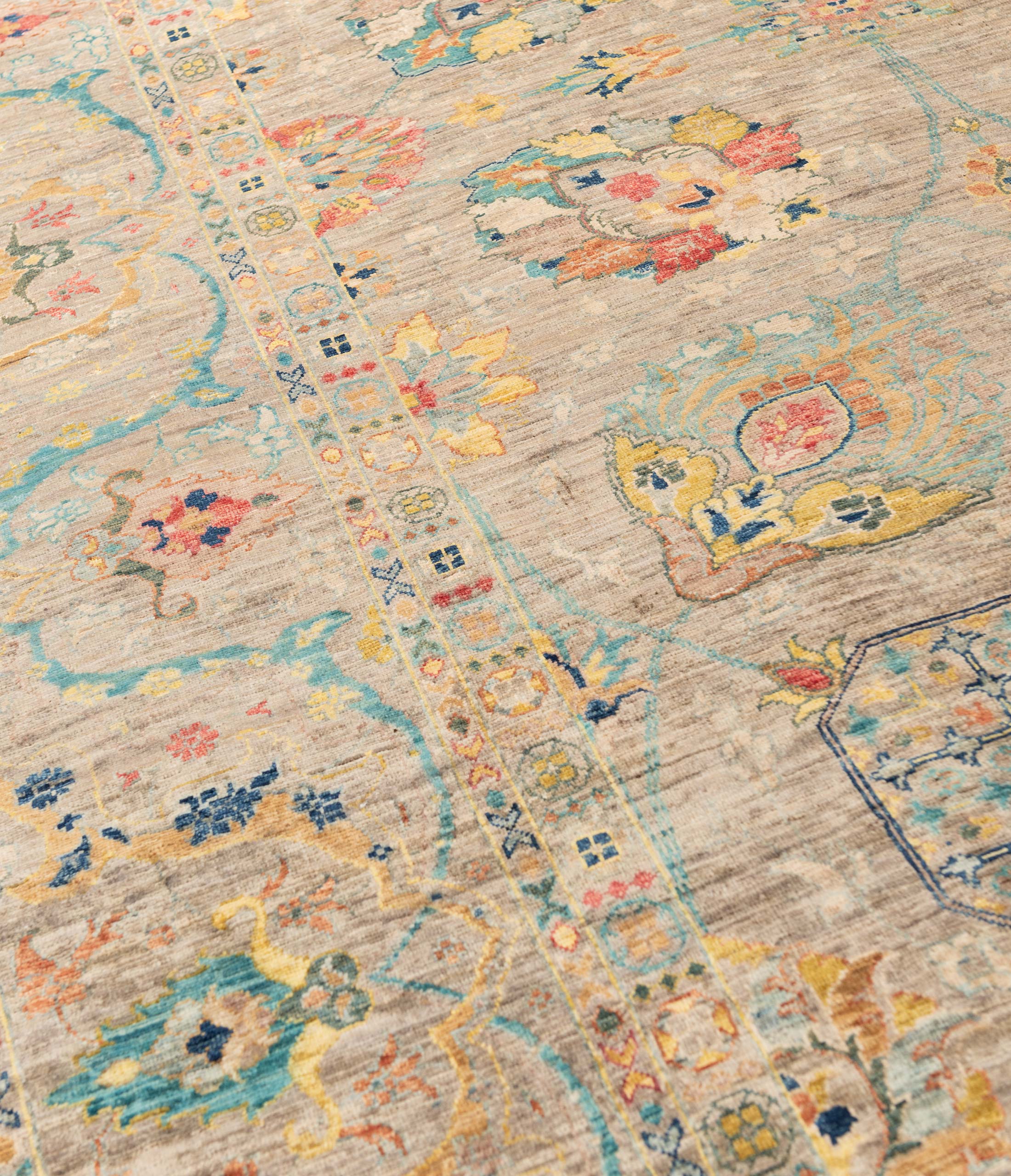Dieser handgeknüpfte Ferahan-Novum Teppich aus Afghanistan präsentiert sich in einem harmonischen Farbspektrum, das von einem warmen Beigebraun als Hauptfarbe dominiert wird. Ergänzt wird diese durch lebendige Akzente in Rot und Blau, die dem Teppich ein fröhliches und einladendes Erscheinungsbild verleihen. Die Musterung ist kunstvoll und verspielt, mit floralen und geometrischen Elementen, die dem Teppich eine zeitlose Eleganz verleihen. Mit einer beeindruckenden Knotendichte von ca. ...mehr Beschreibung