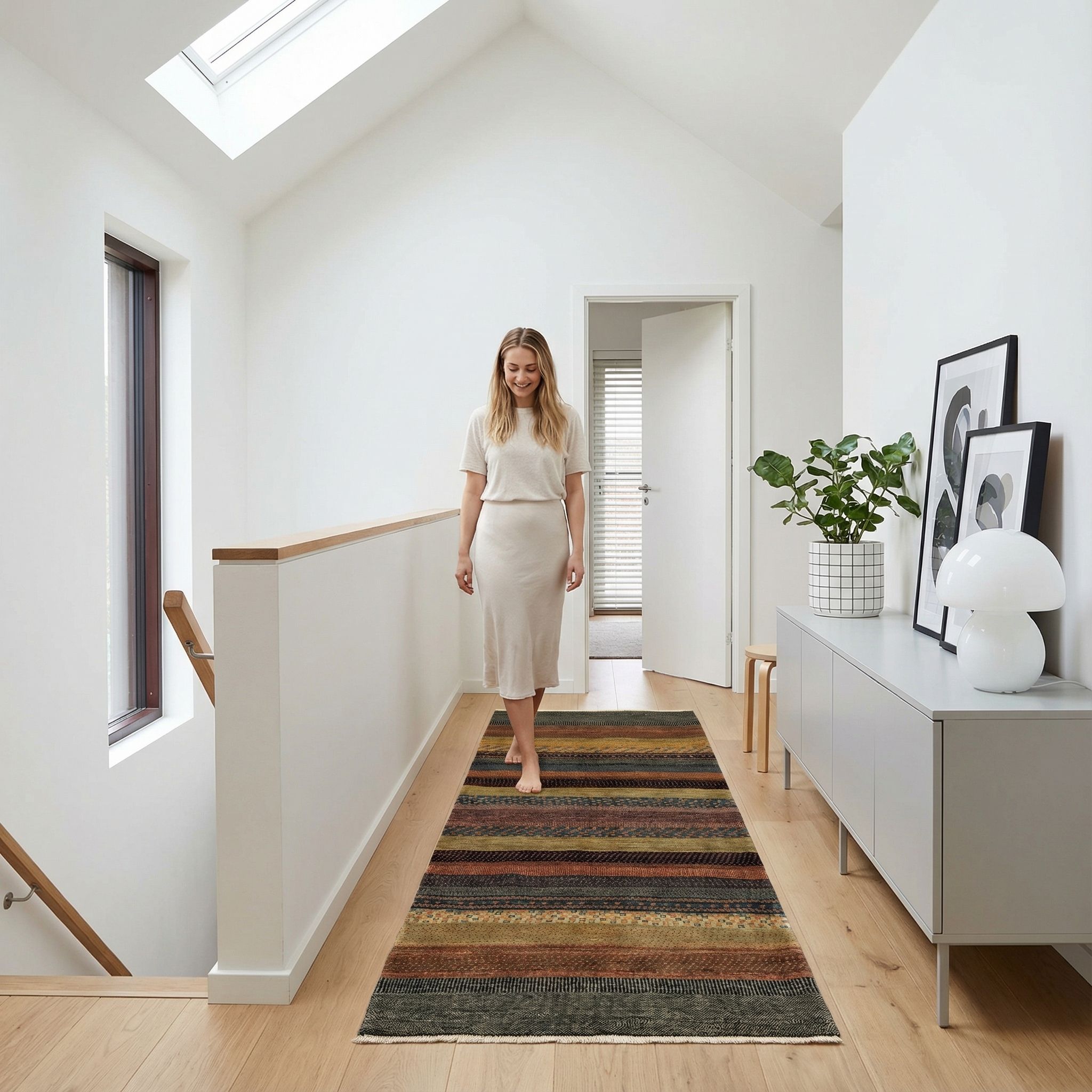 Dieser handgeknüpfte Bidjar-Novum Teppich aus Persien besticht durch seine harmonische Farbkombination und hochwertige Materialien. Die Hauptfarbe ist ein intensives Dunkelblau, das durch warme Ockertöne und tiefes Rostrot ergänzt wird. Diese Farbpalette verleiht dem Teppich eine behagliche und zugleich elegante Ausstrahlung. Die Musterung ist geprägt von horizontalen Streifen, die durch geometrische und abstrakte Muster aufgelockert werden, was dem Teppich eine moderne und dennoch ...mehr Beschreibung