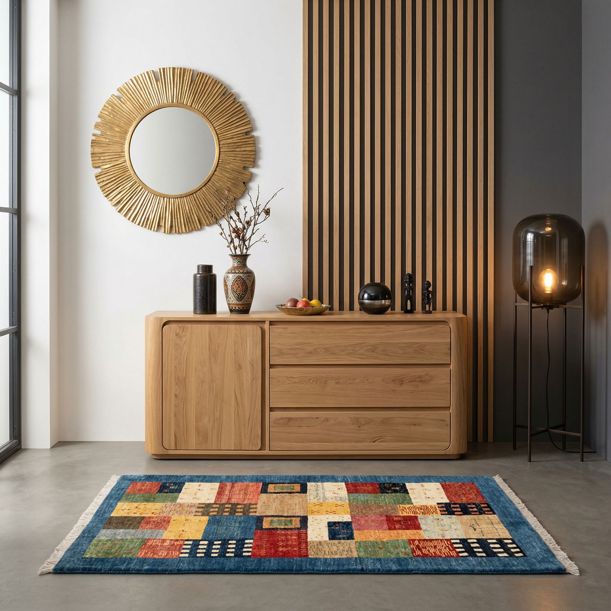 Dieser Teppich ist das ideale Herzstück für den Ethno-Style, da er durch seine Herkunft aus der persischen Provinz Kurdistan und die traditionelle Handwerkskunst ein authentisches Kulturgut darstellt. Der im Text beschriebene "mystische Musterschatz alter, persischer Nomadenstämme" bringt die Geschichte ferner Völker und eine globale Ästhetik direkt in Ihren Wohnraum. Durch die Verwendung von handversponnener Schafwolle und Naturfarben strahlt das Unikat genau jene Natürlichkeit und Ursprünglichkeit aus, die diesen Einrichtungsstil definiert. Die sichtbaren Unterschiede in Farbe und Struktur unterstreichen den handgemachten Charakter und machen den Teppich zu einem echten, weltgewandten Original.
