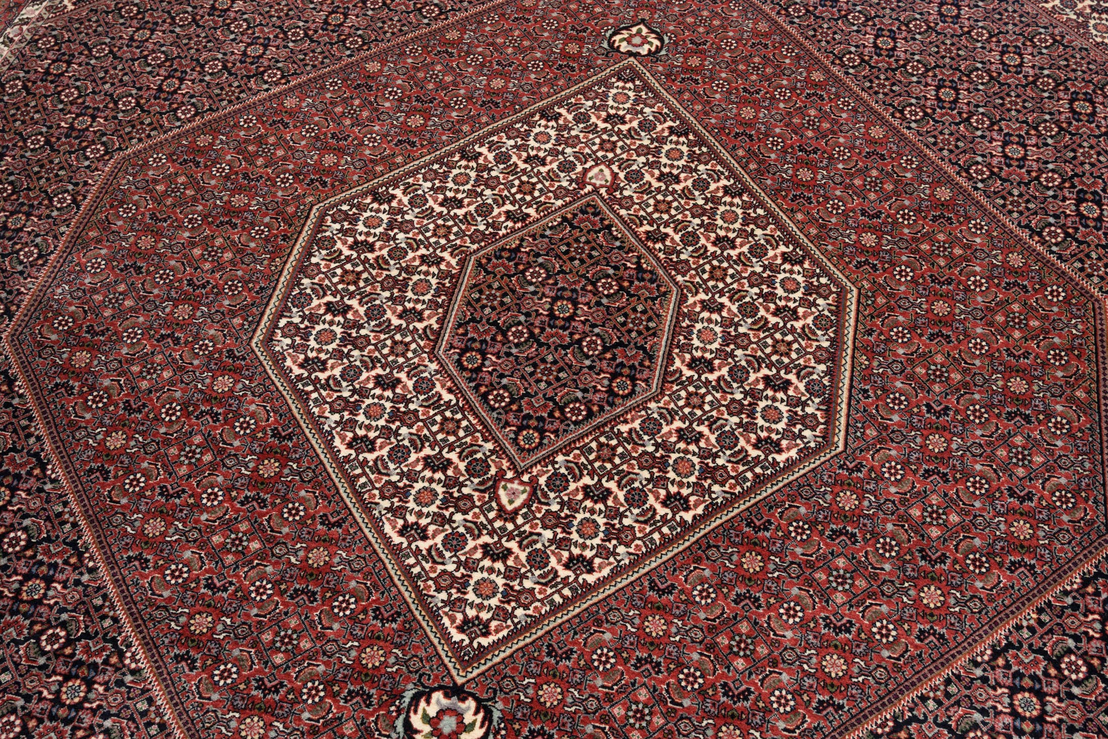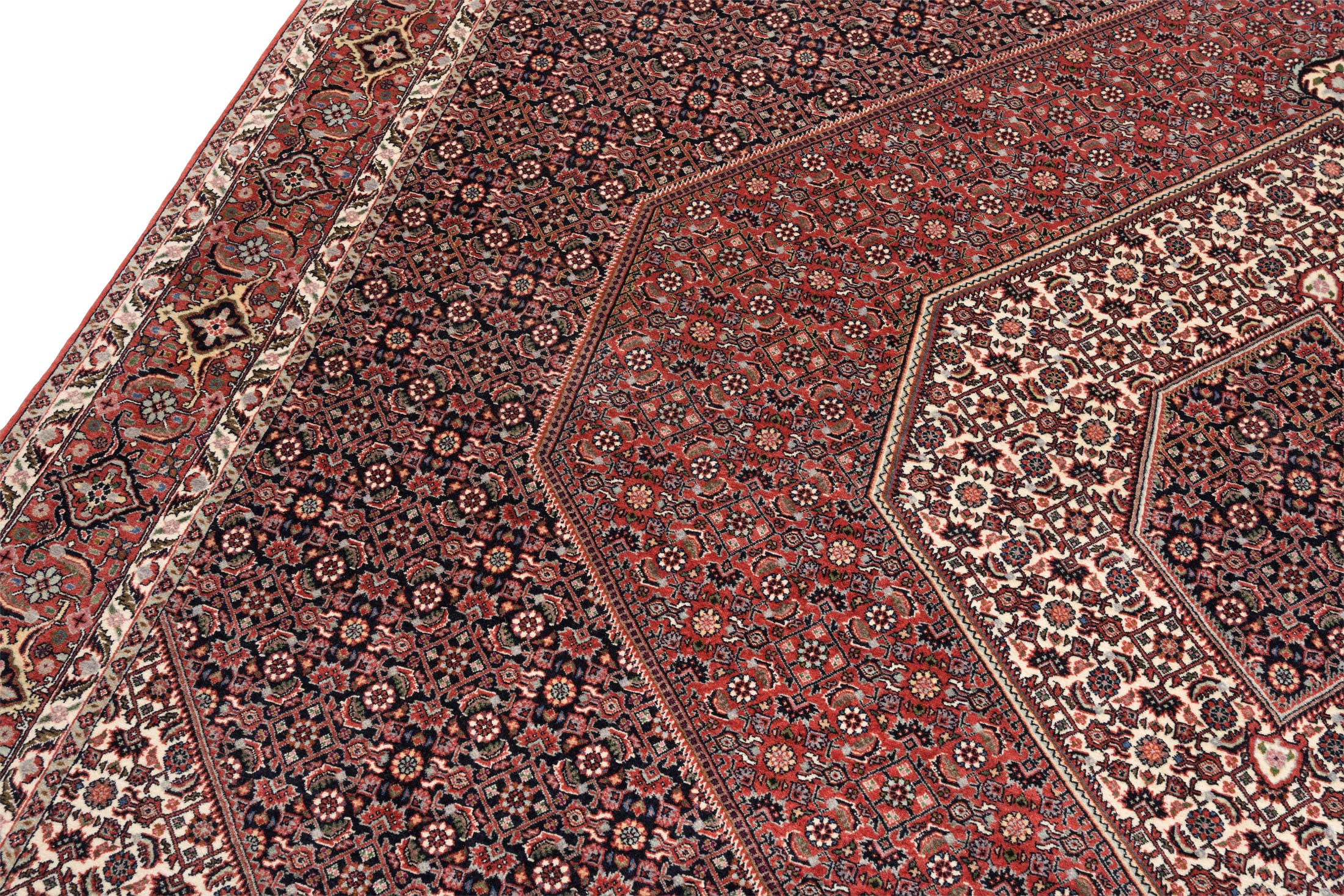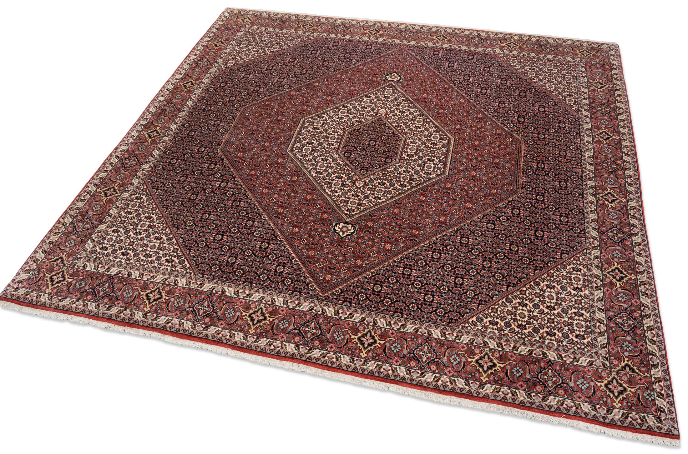 Dieser handgeknüpfte Bidjar-Teppich aus dem persischen Kurdistan präsentiert sich in einem warmen Rostrot als Hauptfarbe, die dem Teppich eine einladende und elegante Ausstrahlung verleiht. Ergänzt wird diese durch satte Dunkelblau- und Cremetöne, die das klassische Herati-Muster hervorheben. Dieses Muster, auch als Fischmuster bekannt, umrahmt ein zentrales Medaillon und schafft eine harmonische Balance zwischen Tradition und Kunstfertigkeit. Dank der Verwendung feinster Korkwolle und der ...mehr Beschreibung