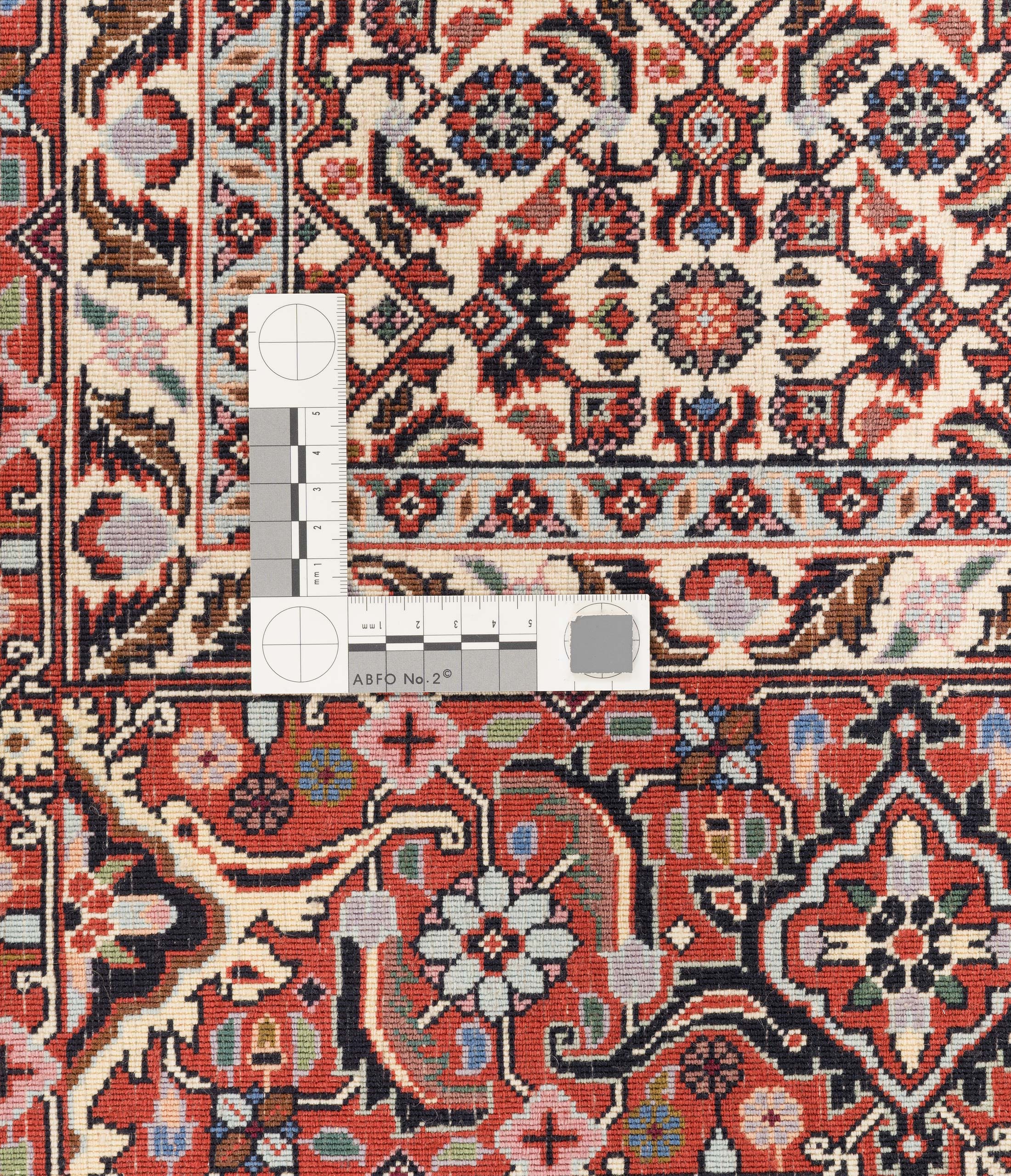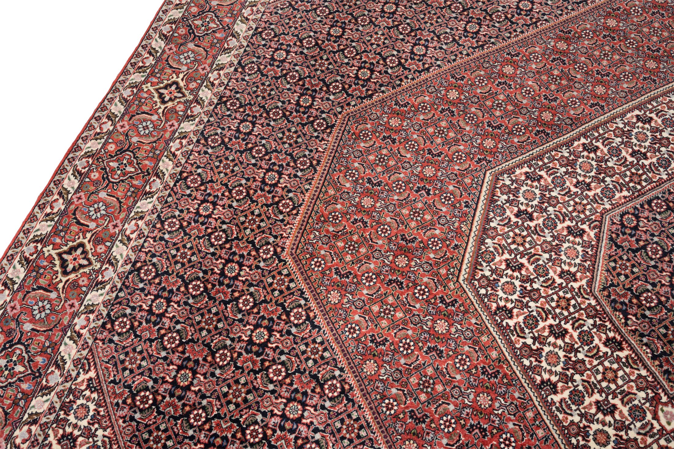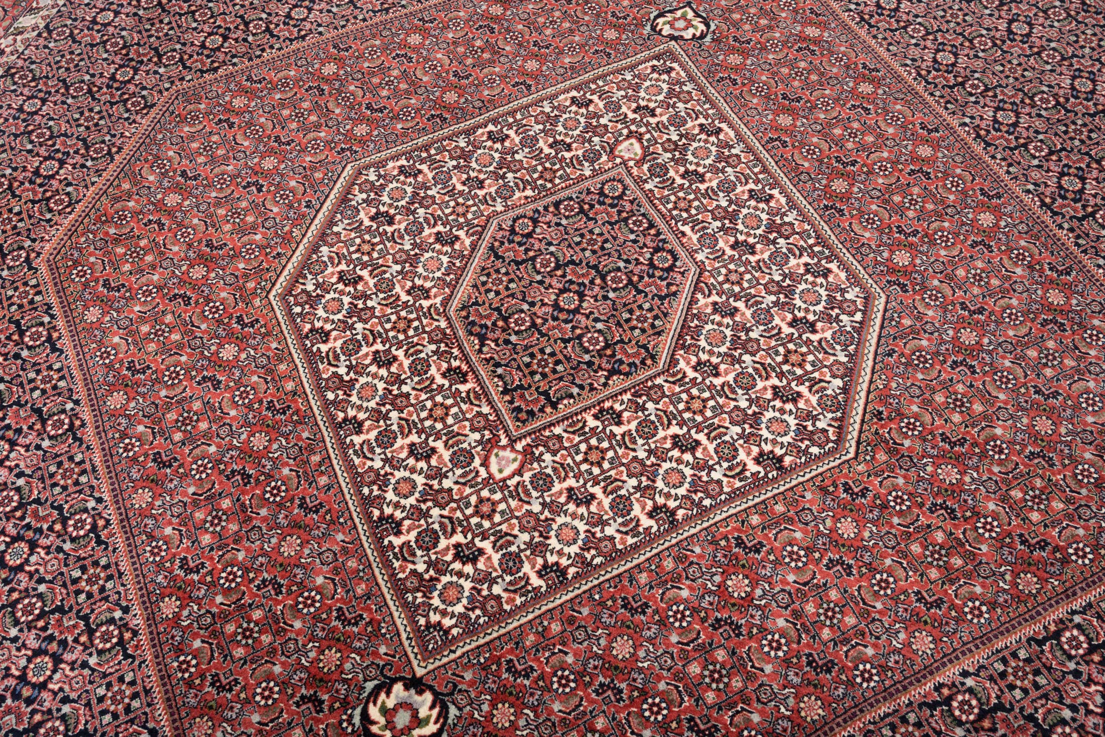 Dieser handgeknüpfte Bidjar-Teppich aus dem persischen Kurdistan präsentiert sich in einem warmen Rostrot als Hauptfarbe, die dem Teppich eine einladende und elegante Ausstrahlung verleiht. Ergänzt wird diese durch satte Dunkelblau- und Cremetöne, die das klassische Herati-Muster hervorheben. Dieses Muster, auch als Fischmuster bekannt, umrahmt ein zentrales Medaillon und schafft eine harmonische Balance zwischen Tradition und Kunstfertigkeit. Dank der Verwendung feinster Korkwolle und der ...mehr Beschreibung