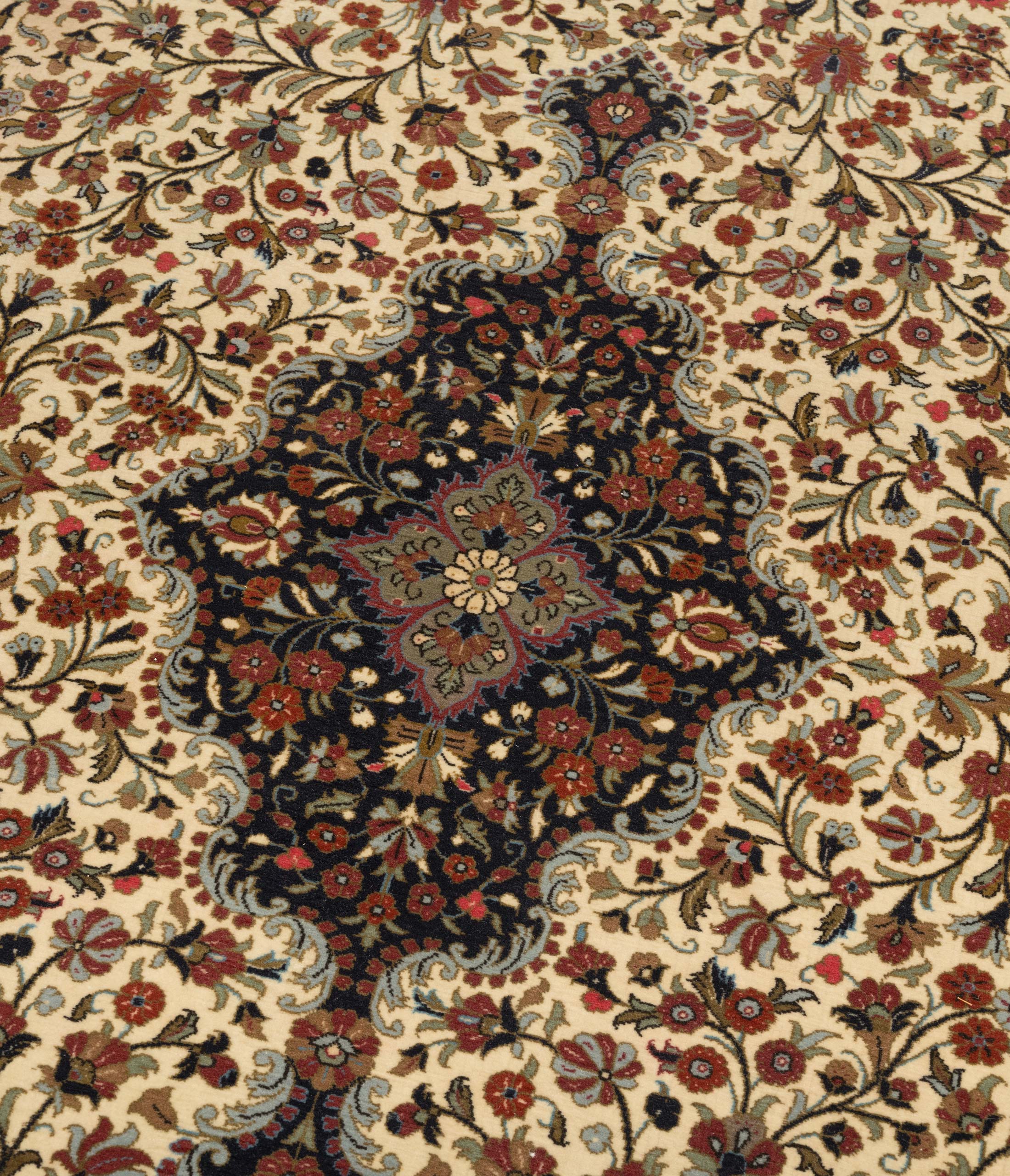 Hier präsentieren wir einen exquisiten handgeknüpften Ghom-Teppich aus Persien, der durch seine feine Verarbeitung und beeindruckende Farbgebung besticht. Die Hauptfarbe dieses Meisterwerks ist ein elegantes Elfenbein, das einen harmonischen Kontrast zu den weiteren Tönen bildet. Ein tiefes Rot, das an rubinfarben erinnert, zieht sich durch das kunstvolle Muster und verleiht dem Teppich eine warme Ausstrahlung. Ein sattes Schwarz sorgt für Tiefe und Struktur, während Akzente in Hellgrün ...mehr Beschreibung