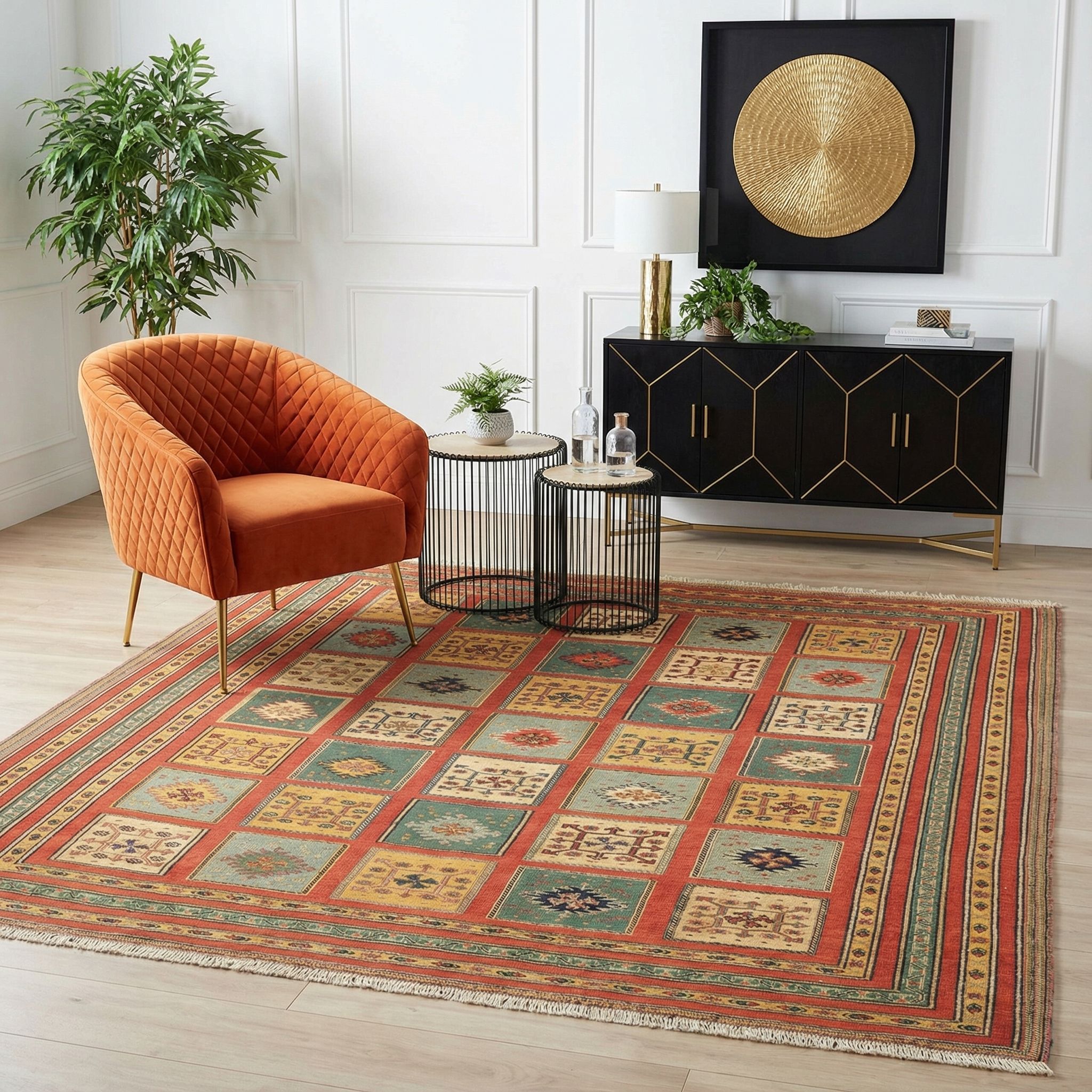 In einem modernen, reduzierten Ambiente fungiert dieser edle Kelim als bewusster und spannender Stilbruch, der dem Raum sofort Wärme und Charakter verleiht. Das klare, kassettenartige Rastermuster korrespondiert hervorragend mit der geradlinigen Formensprache des Contemporary-Styles, während die lebendige Oberflächenstruktur die Strenge glatter Flächen aufbricht. Die hochwertige Verarbeitung und die feine Wolle zeugen von einem Qualitätsbewusstsein, das perfekt zum Anspruch an exklusives, zeitgenössisches Design passt. So wird der Afschar-Tabii zum kunstvollen Ankerpunkt, der moderne Ästhetik mit traditioneller Handwerkskunst verbindet.