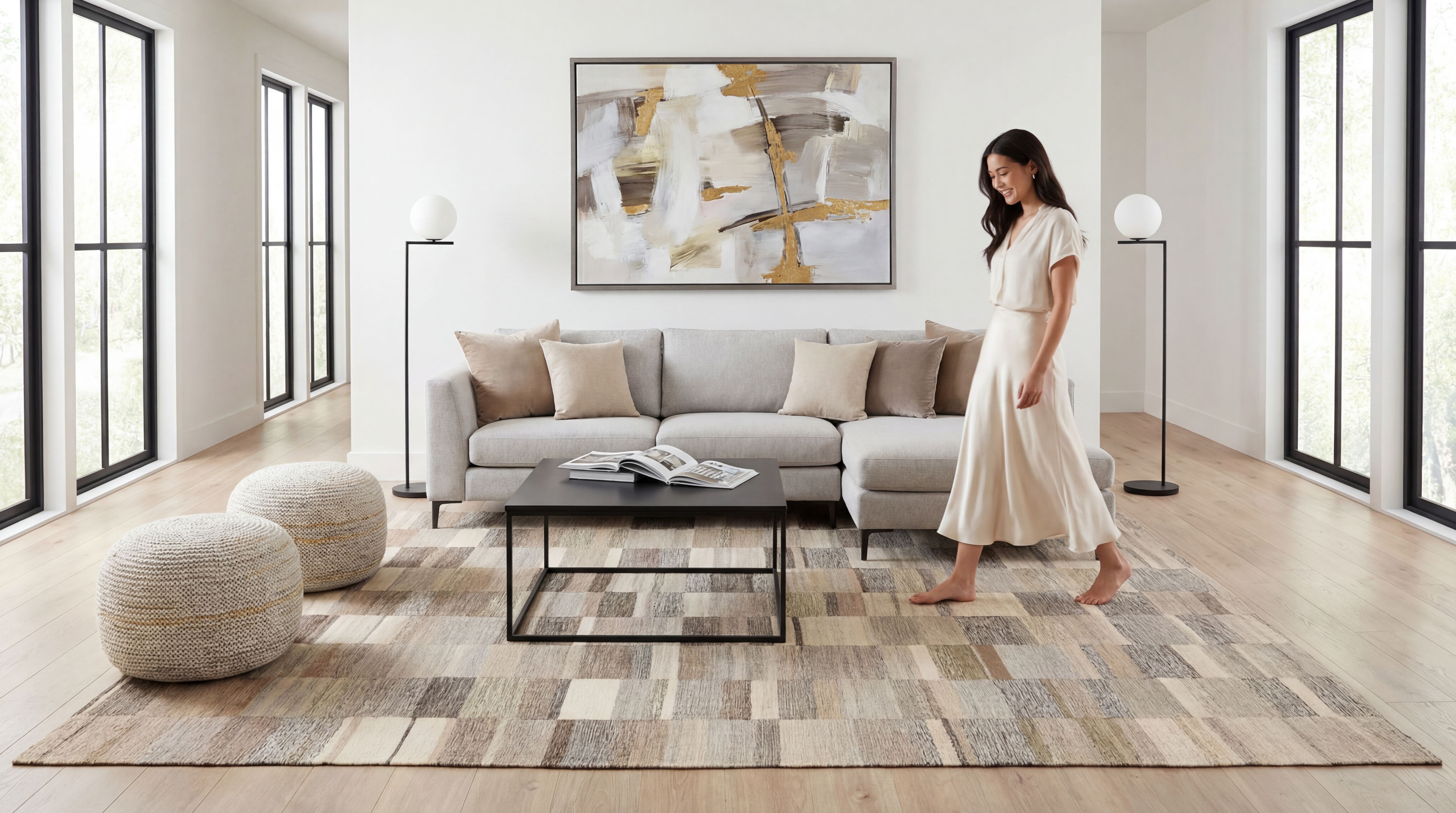 Dieser handgewebte Kelim aus Afghanistan, bekannt als Ghara, besticht durch seine harmonische Farbpalette. Die Hauptfarbe ist ein dezentes Beige, das von warmen Brauntönen und sanften Grautönen ergänzt wird. Diese drei Farben schaffen ein einladendes, ausgewogenes Gesamtbild, das sowohl modern als auch zeitlos wirkt. Die fein strukturierte Musterung des Teppichs, bestehend aus rechteckigen Blöcken, verleiht ihm eine elegante Schlichtheit und unterstreicht die Kunstfertigkeit der Handarbeit. ...mehr Beschreibung