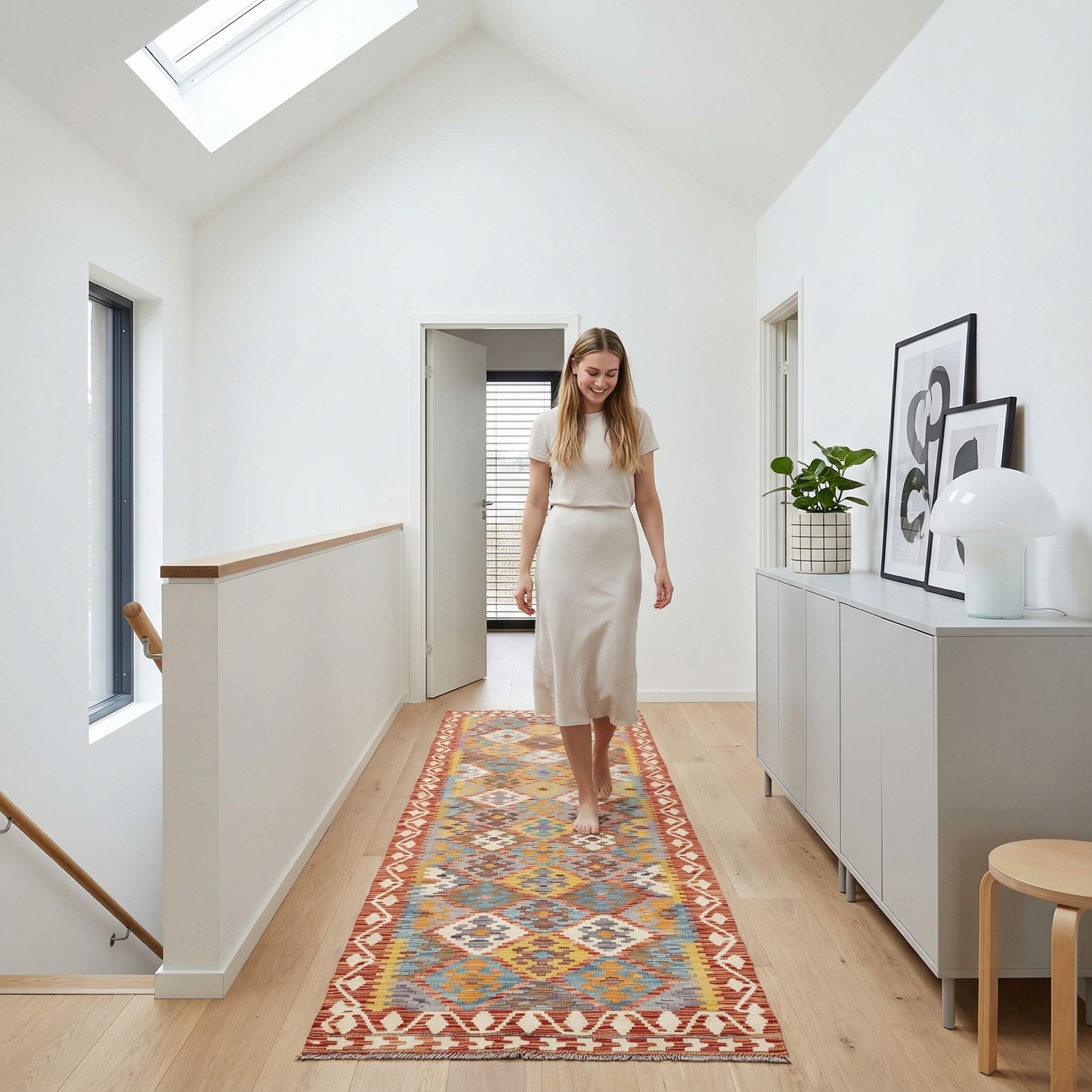 Hier präsentieren wir einen faszinierenden Ghazghar-Kelim aus Afghanistan, der mit seinen warmen und erdigen Farbtönen besticht. Die Hauptfarbe dieses handgewebten Kunstwerks ist ein reiches Ziegelrot, das von einem subtilen Ockergelb und einem tiefen Azurblau begleitet wird. Diese harmonische Kombination wird durch Akzente in Cremeweiß vervollständigt, die dem Teppich eine lebendige, doch zugleich bodenständige Ausstrahlung verleihen.Das Muster zeigt traditionelle geometrische ...