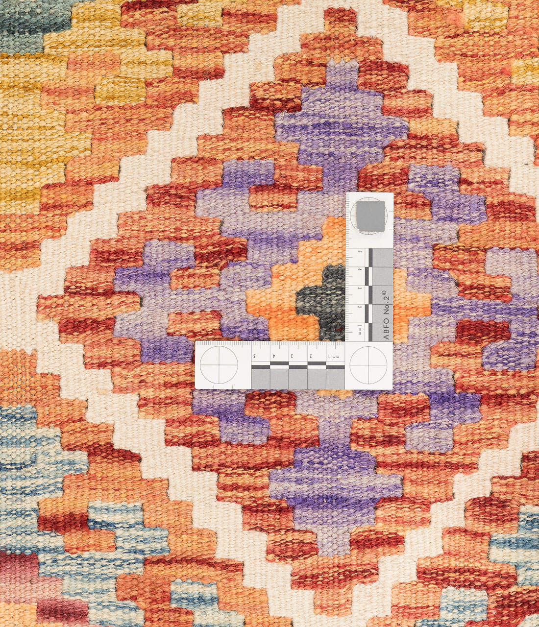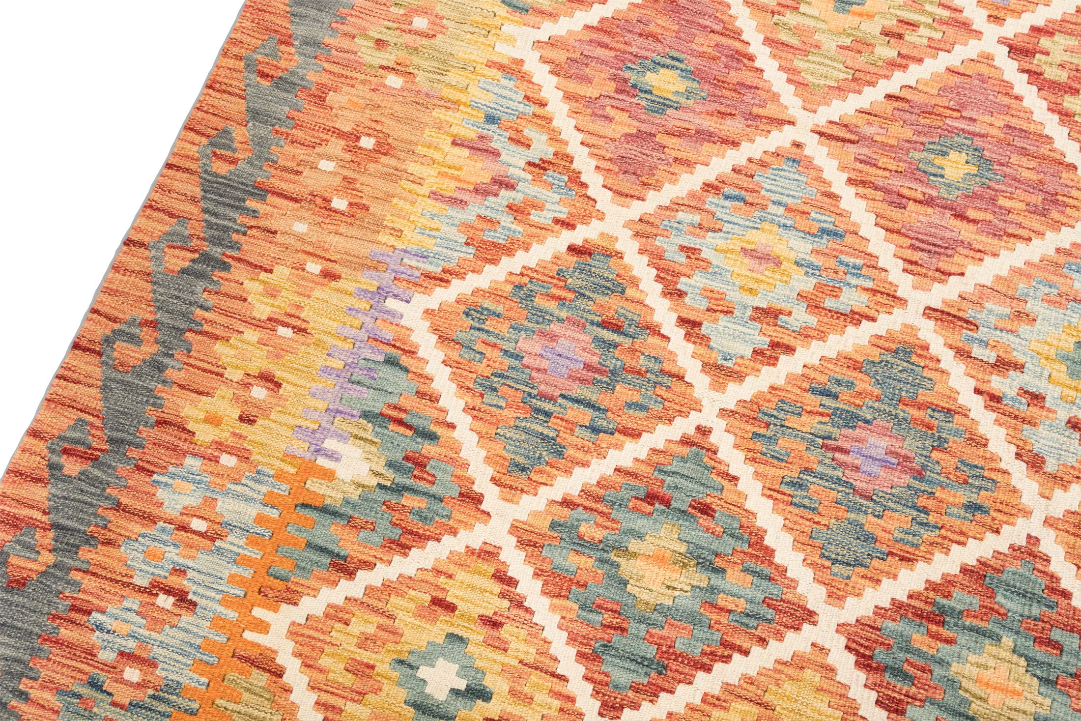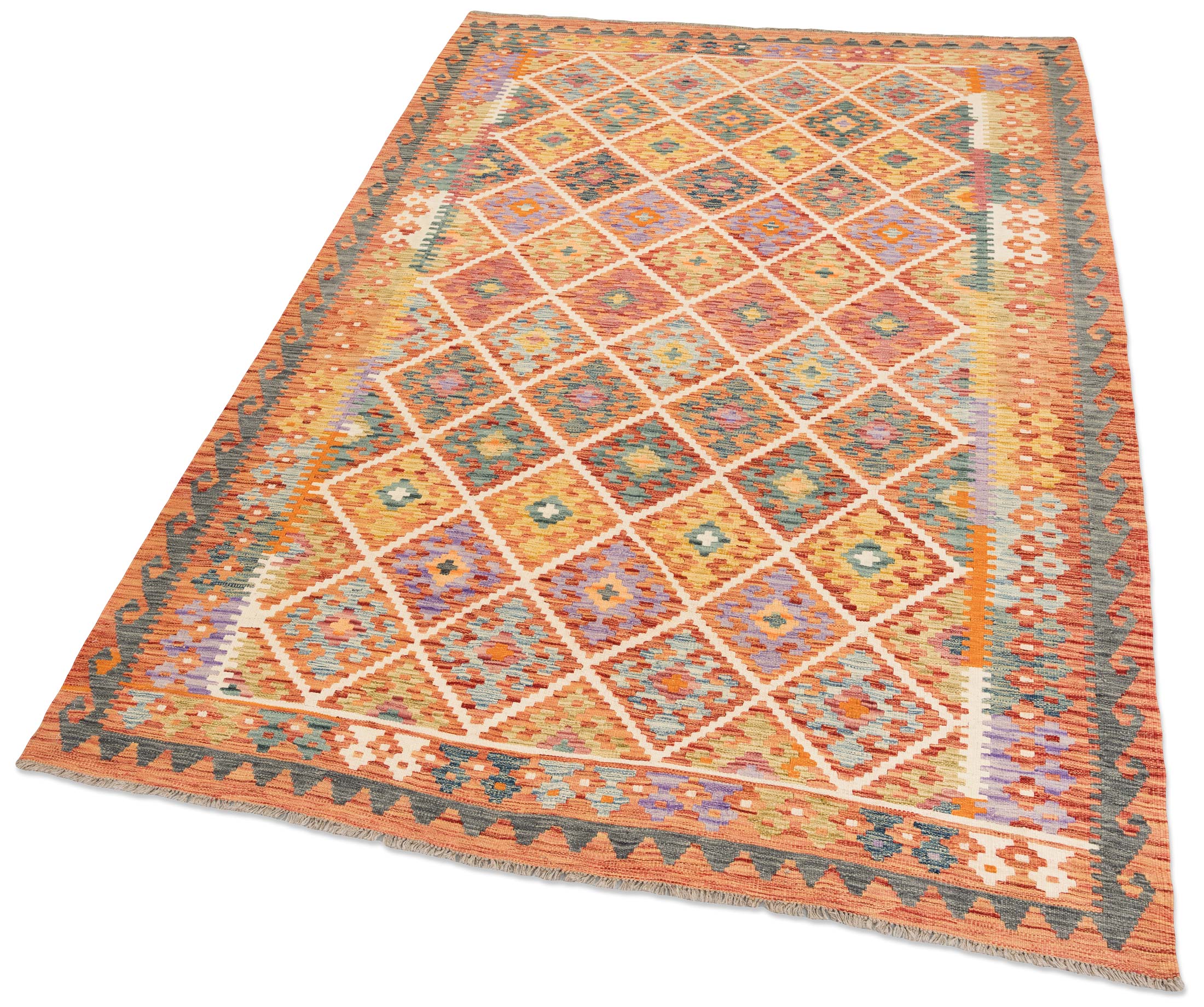 Entdecken Sie den faszinierenden handgewebten Ghazghar-Kelim aus Afghanistan, der mit seinen warmen, erdigen Farbtönen ein einladendes Ambiente schafft. Die Hauptfarbe ist ein lebendiges Orange, ergänzt durch harmonisch abgestimmte Rot- und Blautöne. Dieser Kelim zeigt traditionelle Nomadenmuster in einem farbenfrohen und fröhlichen Design, das jedem Raum Charakter verleiht.