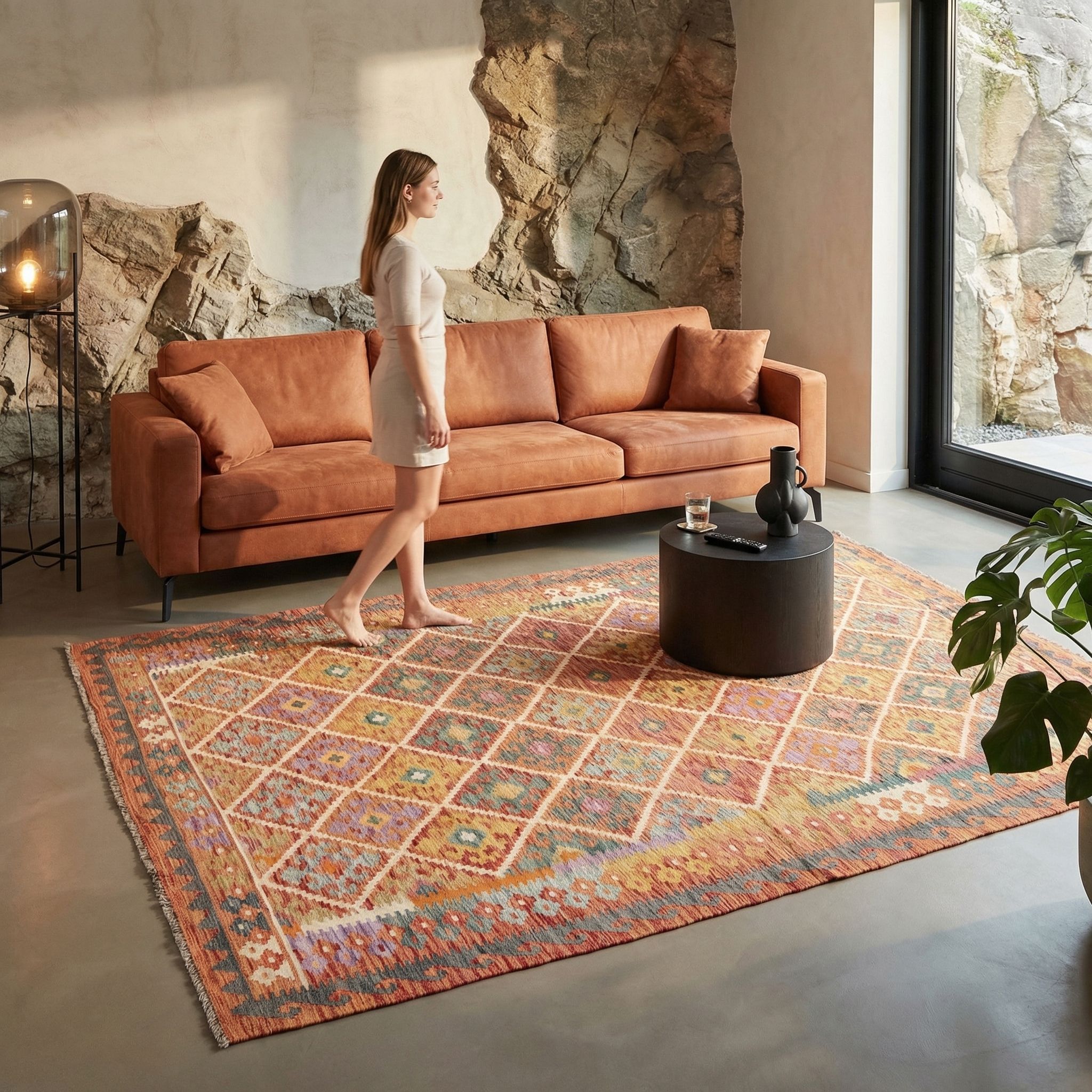 In der reduzierten nordischen Ästhetik sorgt dieser farbenfrohe Kelim für die nötige Portion „Hygge“ und dient als warmer Ankerpunkt in einem sonst schlichten Raum. Die Verwendung von reinen Naturmaterialien entspricht der skandinavischen Philosophie der Nachhaltigkeit und Wertigkeit, während die geometrischen Muster Klarheit bewahren. Als belebender Kontrast zu weißen Wänden und hellem Holz bringt das erdige Colorit eine einladende Gemütlichkeit, ohne den Stil zu überladen. So verbindet sich nordische Zurückhaltung harmonisch mit der orientalischen Wärme dieses handwerklichen Meisterwerks.