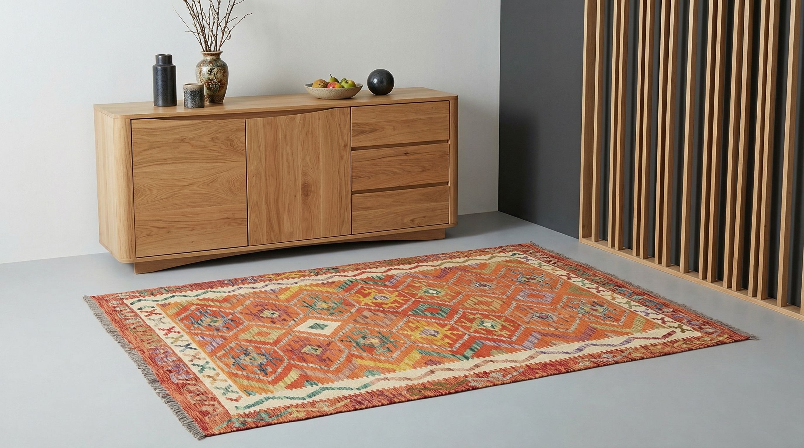Hier präsentieren wir Ihnen einen handgewebten Kelim aus Afghanistan, der mit seiner warmen, erdigen Farbpalette besticht. Die Hauptfarbe dieses einzigartigen Teppichs ist ein lebhaftes Orange, das sofort eine behagliche Atmosphäre schafft. Begleitet wird es von einem tiefen Rotton, der für eine harmonische Balance sorgt. Dazu gesellen sich ein frisches Grün und ein zartes Violett, die dem Teppich eine fröhliche und lebendige Note verleihen. Das Design zeigt klassische Nomadenmuster, die ...mehr Beschreibung