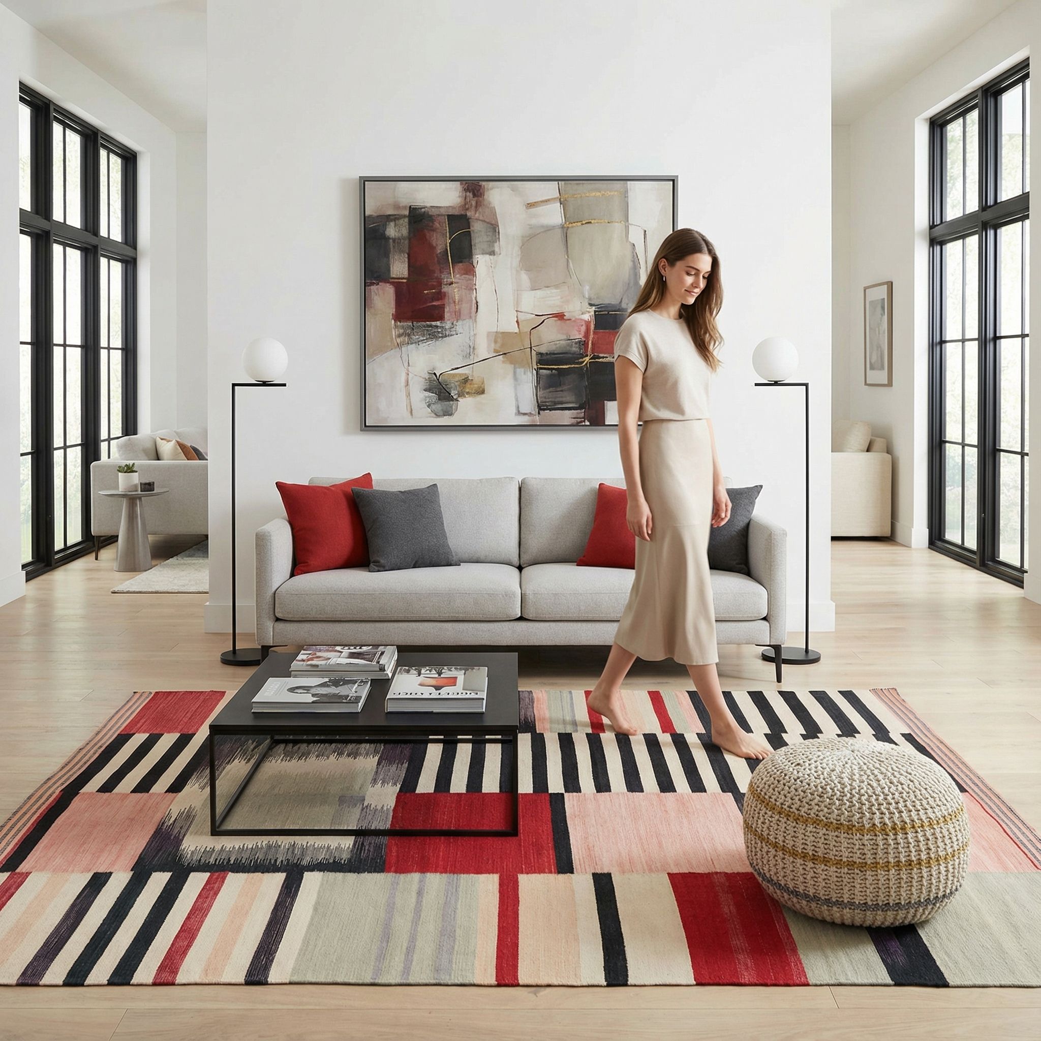 Tavis: Man könnte meinen Piet Mondrian oder Victor Vasarely standen Pate für diese modernen handgemachten Kelims. Auch das Bauhaus der 1920er könnte man darin finden. Taviskelims - Einmalig schöne und hochmoderne Webkelims aus Afghanistan. Aber tatsächlich sind die Vorlagen für diese traumhaft schönen Kelims meist alte Mazanderanmotive aus Persien. Auf glatten Böden (Hartböden) empfehlen wir unsere rutschfeste Teppichunterlage.Sie haben Fragen?