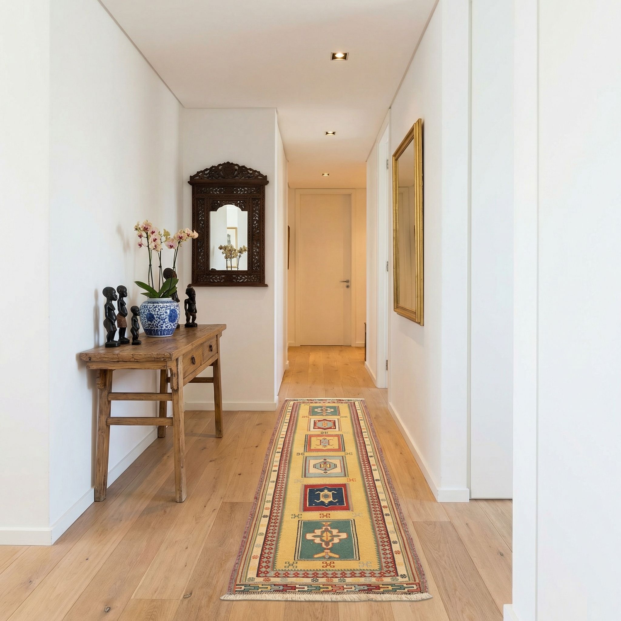 Die sonnigen Grundtöne und die natürliche Haptik der handversponnenen Wolle machen diesen Kelim zum idealen Begleiter für den frischen New-Country-Style. Er untermalt die Gemütlichkeit von hellen Holzmöbeln und Leinenstoffen, setzt dabei aber einen qualitätsvollen, farblichen Akzent, der den Raum zum Strahlen bringt. Die außerordentliche Robustheit des Afschar-Tabii garantiert, dass er dem lebendigen Landhaus-Alltag standhält und dabei stets seine rustikale Eleganz bewahrt. Er ist das fehlende Puzzlestück, das ländlichen Charme mit künstlerischem Anspruch verbindet und für ein einladendes Wohngefühl sorgt.