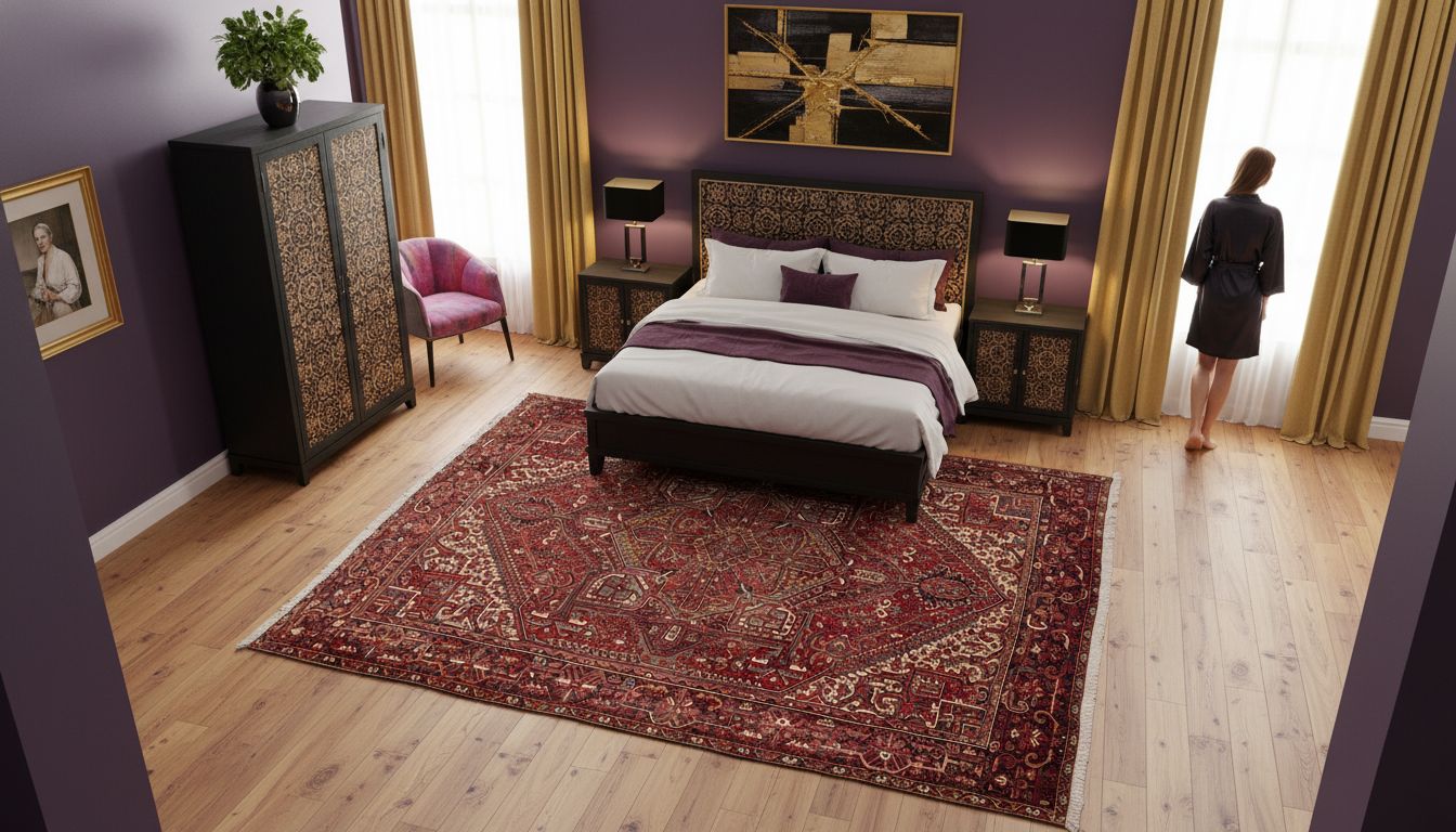 Hier präsentieren wir einen beeindruckenden Heriz-Teppich aus Persien, dessen Hauptfarbe ein tiefes, reiches Rot ist, das Wärme und Eleganz ausstrahlt. Begleitet wird diese dominante Farbe von Akzenten in Creme und Marineblau, die dem Teppich ein harmonisches und gleichzeitig kontrastreiches Erscheinungsbild verleihen. Diese Farben werden durch feine Details in Schwarz und Braun ergänzt, die das Gesamtbild abrunden. Der Teppich zeichnet sich durch ein klassisches geometrisches Design aus, ...mehr Beschreibung