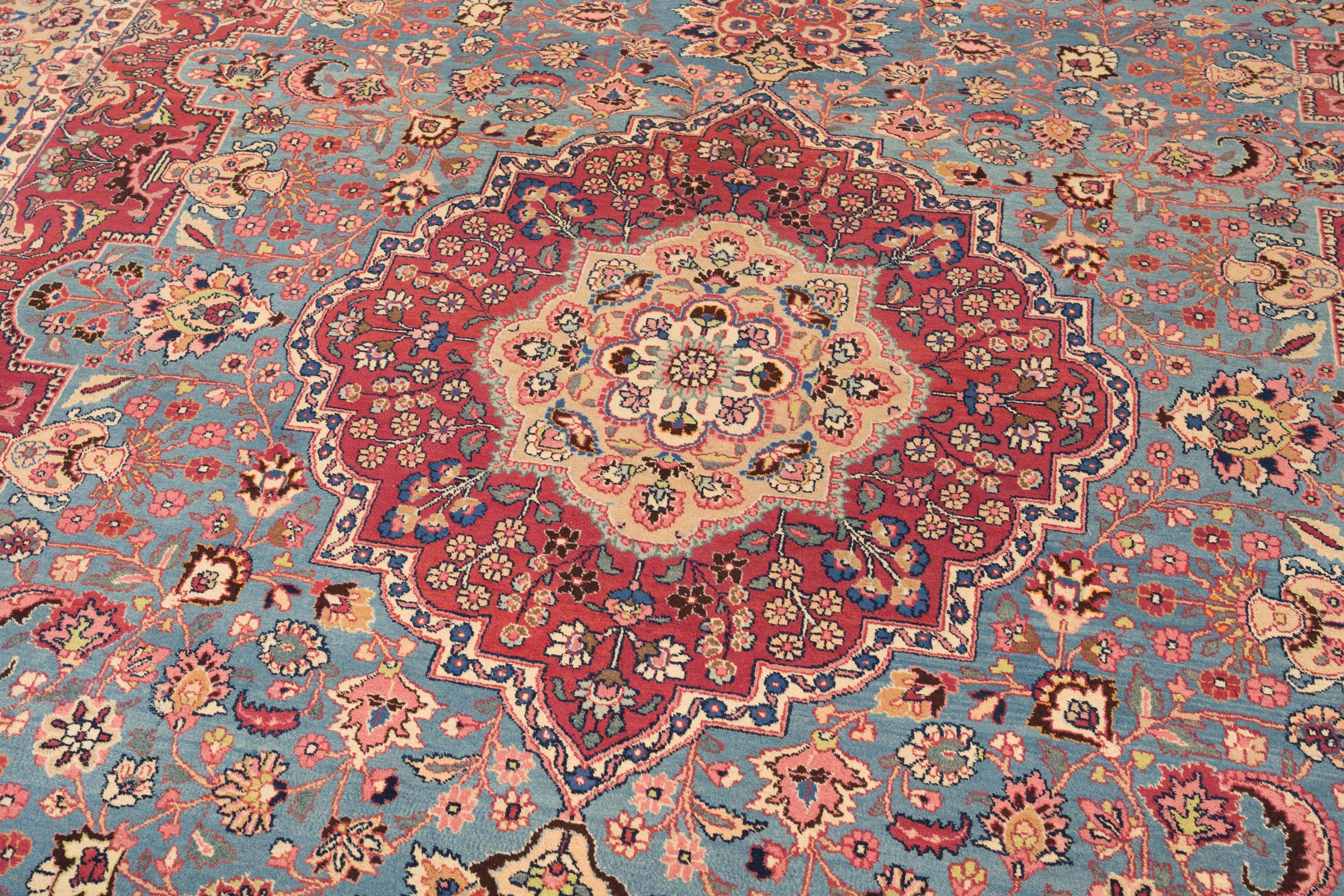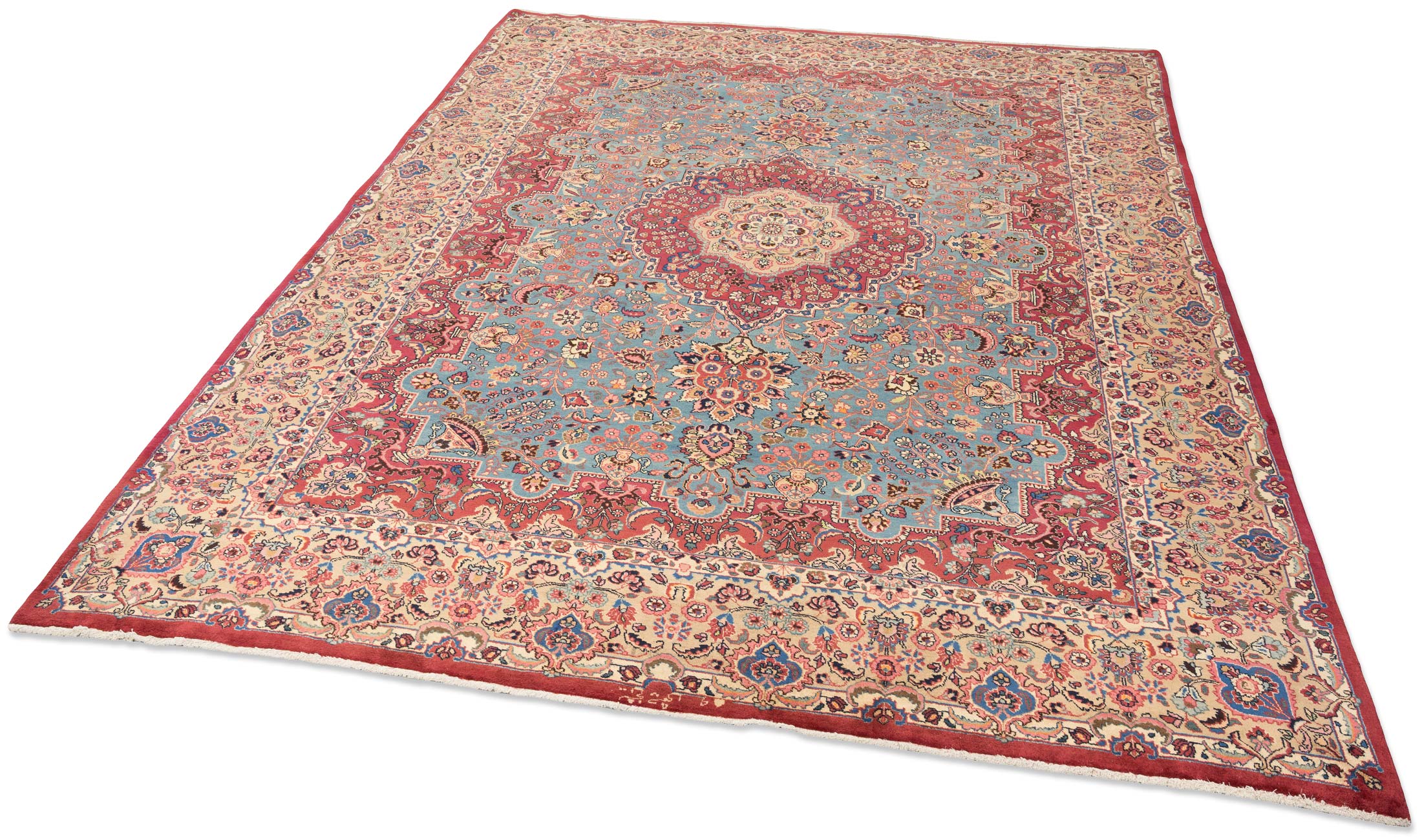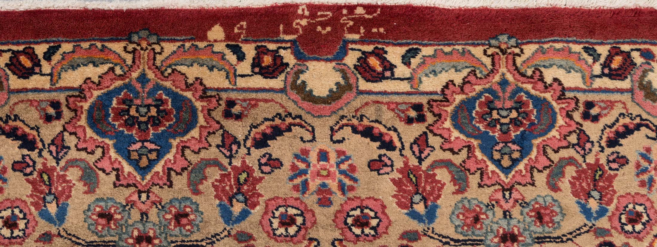 Hergestellt um 1960, ist dieser Teppich in neuwertigem Zustand und zeichnet sich durch seine hervorragende Qualität und feine Knüpfung mit ca. 300.000 Knoten pro Quadratmeter aus. Die Verwendung natürlicher Materialien und die Signatur des Teppichs unterstreichen seine Einzigartigkeit und den hohen Wert. Die Farben haben im Laufe der Jahre eine warme Patina entwickelt, die nur ältere, aber unbenutzte Teppiche aufweisen. Dieser Sabsewar-Teppich ist ein zeitloses Kunstwerk, das jedem Raum eine edle Note verleiht.