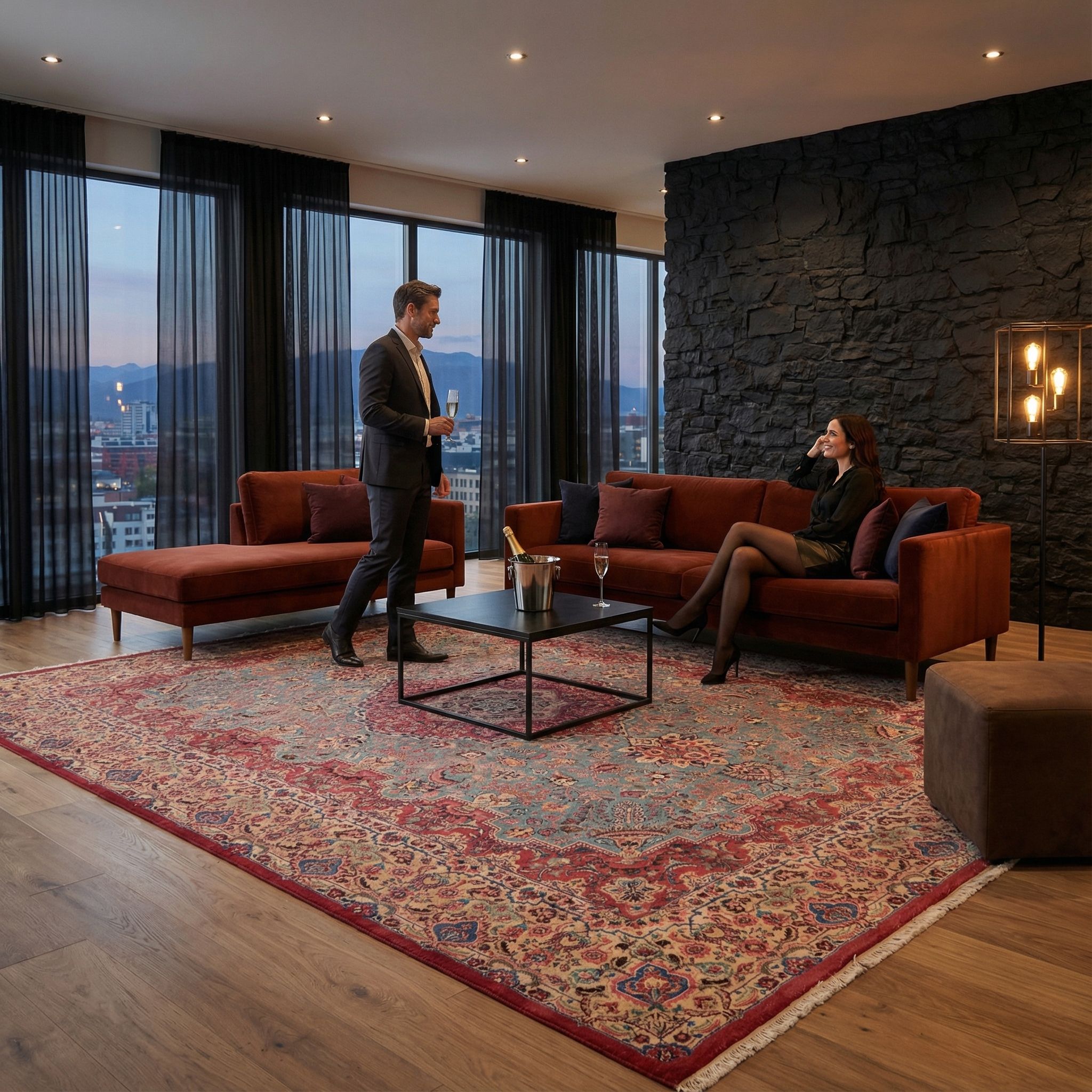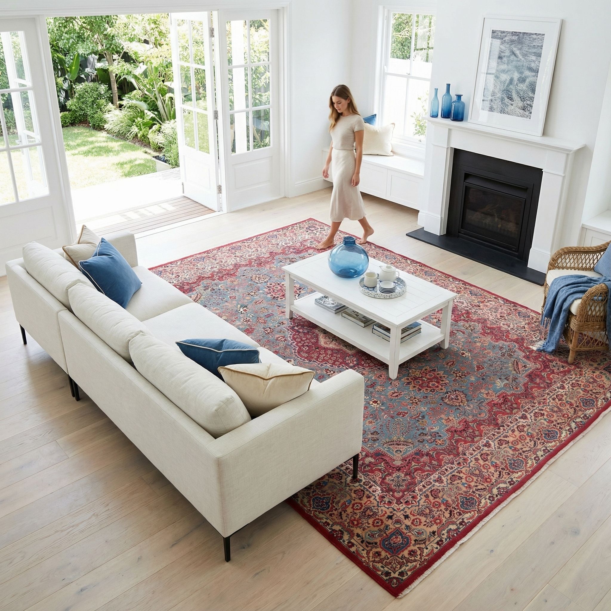 In einer modernen, geradlinigen Einrichtung fungiert dieser hochwertige Teppich als exklusives Kunstwerk am Boden, das dem Raum Tiefe und Charakter verleiht. Der bewusste Stilbruch zwischen schlichten, minimalistischen Designermöbeln und dem detailreichen, klassischen Muster erzeugt eine spannende und sehr aktuelle Atmosphäre. Die neuwertige Erhaltung und die feine Qualität unterstreichen den luxuriösen Anspruch eines zeitgenössischen Wohnkonzepts, ohne dass es altbacken wirkt. Durch die klare Farbgebung lässt er sich hervorragend als farblicher Fokus auf einem ansonsten neutralen Bodenbelag wie hellem Parkett oder Sichtestrich inszenieren.
