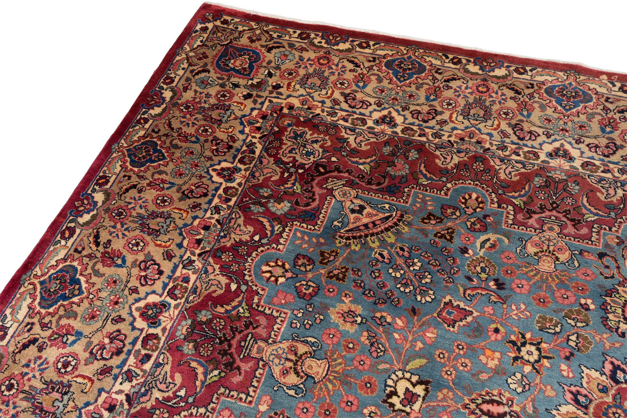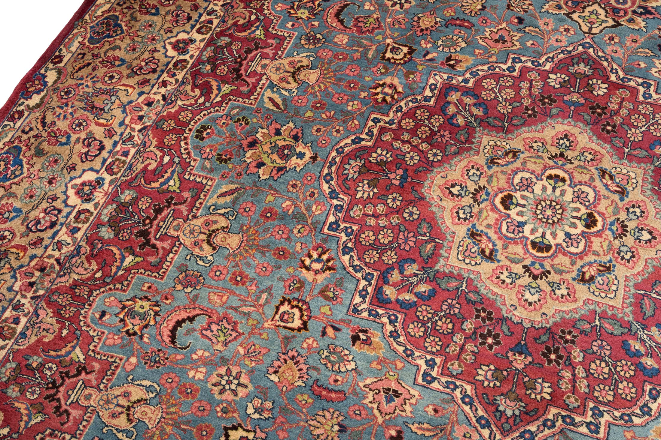 Dieser handgeknüpfte Sabsewar-Teppich aus Persien besticht durch seine eindrucksvolle Hauptfarbe in einem sanften Blau, das dem Stück eine ruhige Eleganz verleiht. Umrahmt wird das Blau von einem kräftigen Rotton, der an Burgunder erinnert, und durch ein harmonisches Creme ergänzt wird, das die Details der Musterung hervorhebt. Dezente Akzente in Schwarz und Gold verleihen dem Teppich zusätzliche Tiefe und Raffinesse. Die floralen und geometrischen Muster, die den Teppich zieren, sind fein ausgearbeitet und zeugen von meisterhafter Handwerkskunst.
