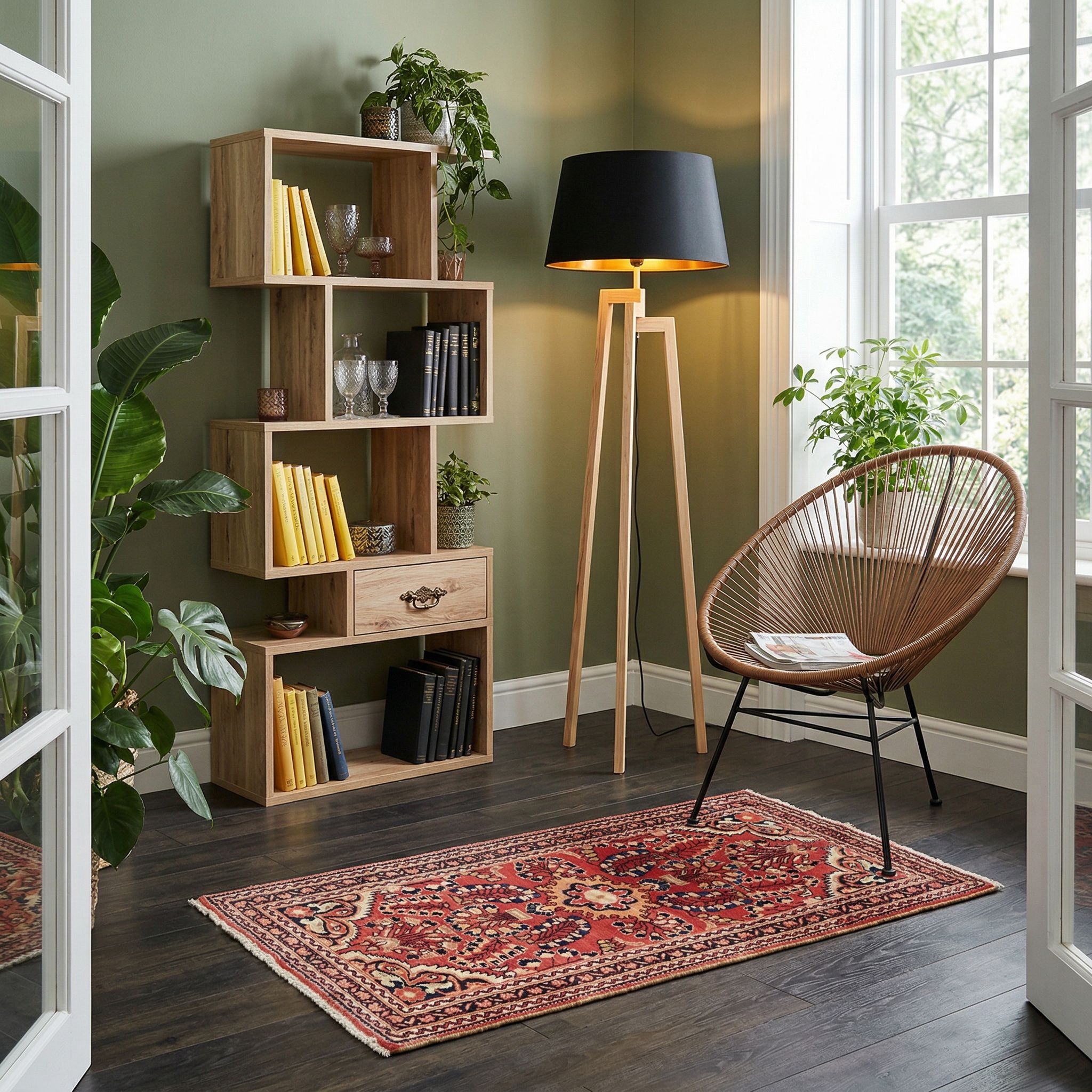 Da der Ethno-Style auf traditionellem Handwerk und kulturellen Einflüssen aus aller Welt basiert, fügt sich dieser vermutlich handgeknüpfte Orientteppich nahtlos in das Konzept ein. Seine filigranen Ornamente und die klassischen Naturfarben spiegeln die handwerkliche Kunstfertigkeit wider, die in diesem Einrichtungsstil so sehr geschätzt wird. Er harmoniert hervorragend mit dunklen Hölzern, geflochtenen Körben und Souvenirs aus fernen Ländern, da er den Raum optisch erdet und thematisch verbindet. So wird der Teppich zum authentischen Statement-Piece, das dem Raum eine warme, kulturell geprägte Tiefe verleiht.