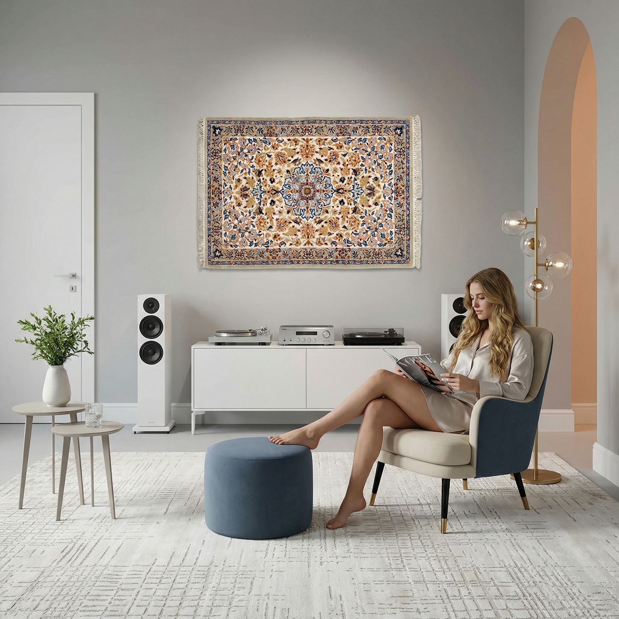 In einem zeitgenössischen, oft geradlinigen Ambiente fungiert dieser klassische Isfahan als bewusster Stilbruch, der dem Raum Seele und Geschichte verleiht. Die Kombination aus diesem meisterhaften Traditionshandwerk und modernen Designmöbeln erzeugt eine spannende, kuratierte Optik, die oft in gehobenen Design-Magazinen zu finden ist. Durch seine feine Zeichnung wirkt der Teppich fast wie ein Gemälde am Boden und nimmt der modernen Einrichtung die kühle Strenge. Er dient als "Anker", der moderne Glaselemente oder schlichte Sofalandschaften mit Wärme und kultureller Tiefe verbindet.