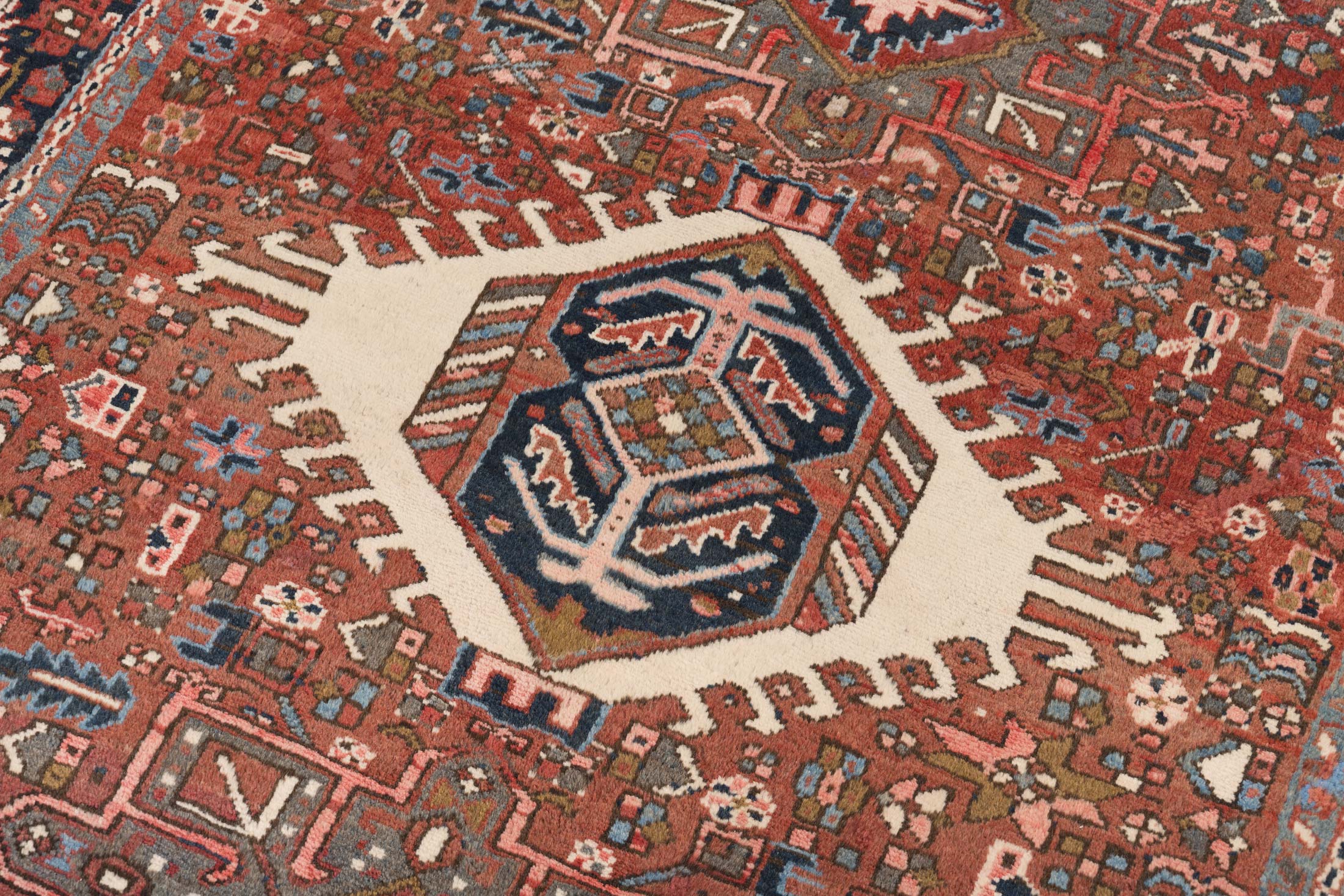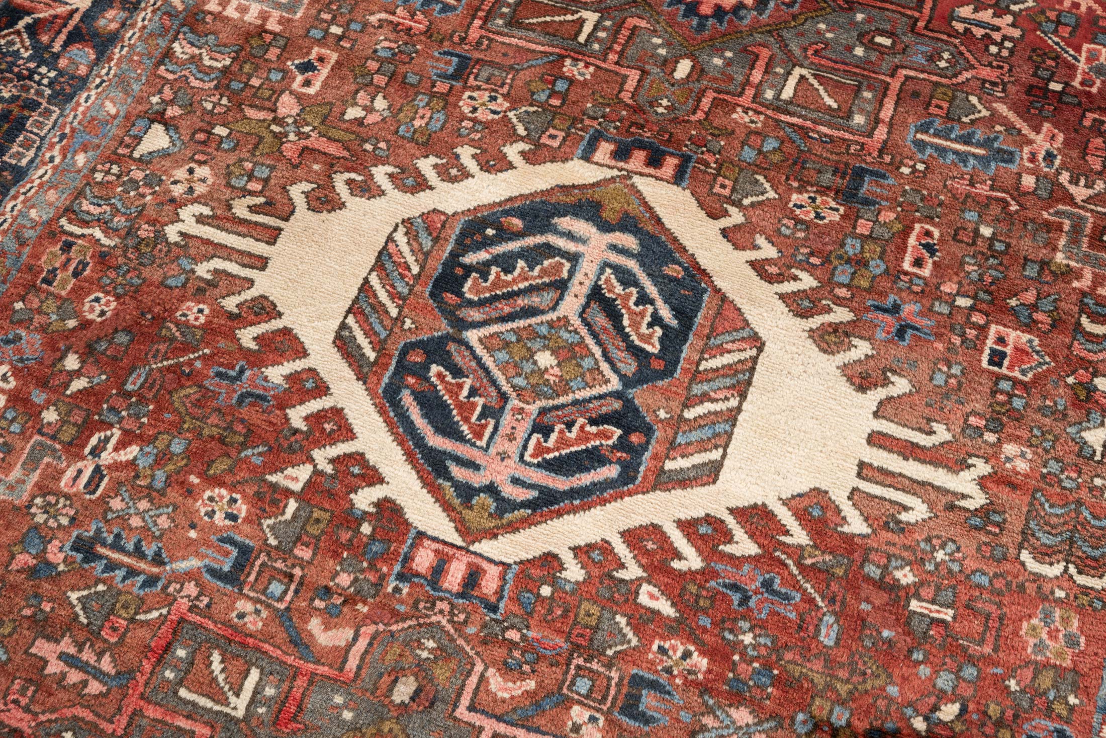 Hier präsentieren wir einen handgeknüpften Garadje-Teppich aus Persien, der um 1940 gefertigt wurde. Die Hauptfarbe dieses prächtigen Stücks ist ein tiefes Rot, das die Basis für das kunstvolle Design bildet. Ergänzt wird es durch ein dunkles Blau, das in den Bordüren und Akzenten erscheint, sowie einem warmen Cremeweiß, das im zentralen Hexagon-Muster hervorsticht. Dezente Nuancen von Braun und Rosa fügen dem Teppich eine zusätzliche Tiefe hinzu und verleihen ihm eine harmonische, ...mehr Beschreibung