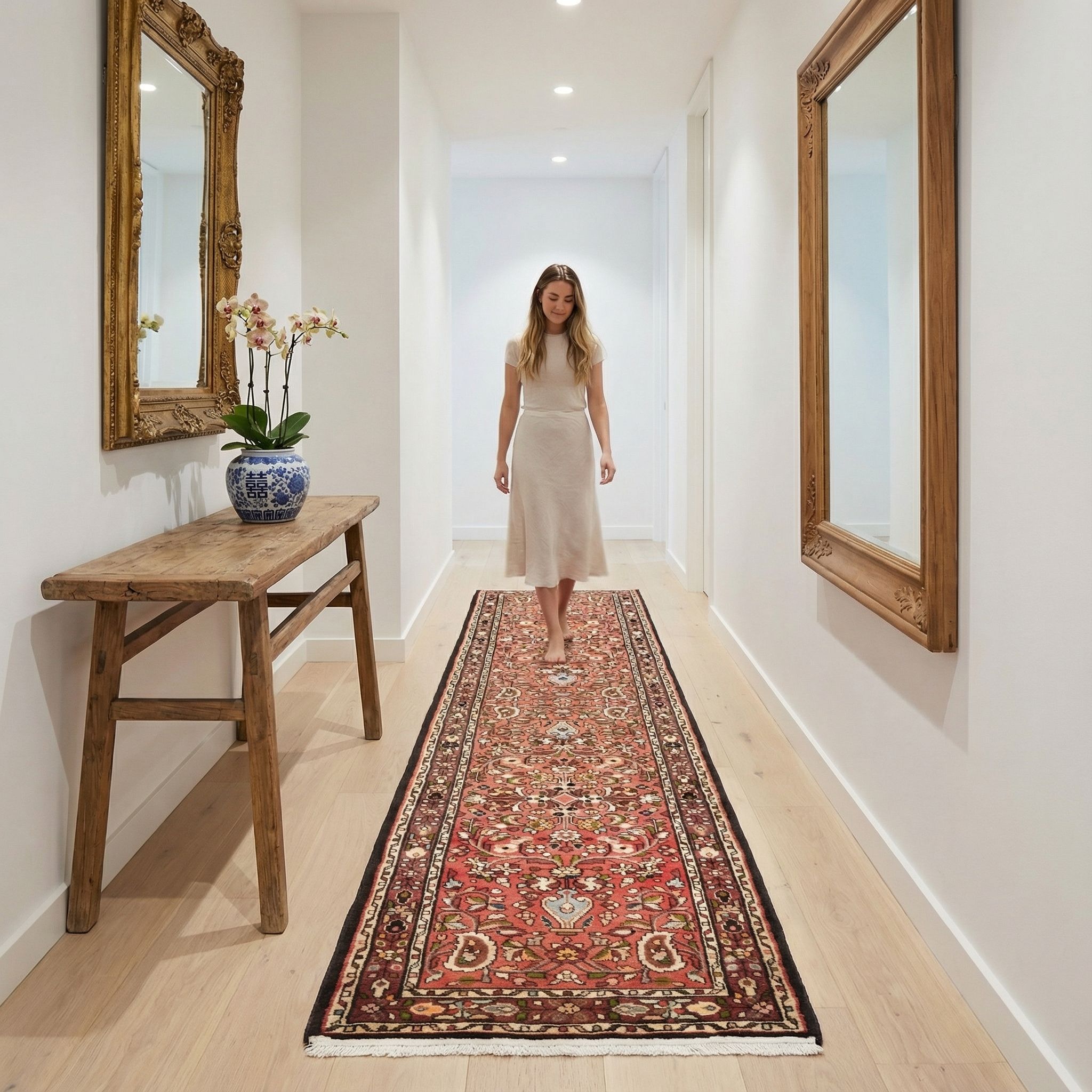 Im New-Country-Style, der für Natürlichkeit und ländliche Gemütlichkeit steht, setzt dieser Läufer einen warmen und farbenfrohen Akzent. Die floralen Elemente und die erdigen Grundtöne des Teppichs harmonieren perfekt mit hellen Holzmöbeln, Leinenstoffen und weiß lackierten Oberflächen oder Dielenböden. Er verleiht dem Raum eine gewisse Bodenständigkeit und Nostalgie, ohne dabei altbacken zu wirken, was für die moderne Interpretation des Landhausstils entscheidend ist. So schafft der Teppich eine einladende Verbindung zwischen rustikalem Charme und eleganter Wohnlichkeit.