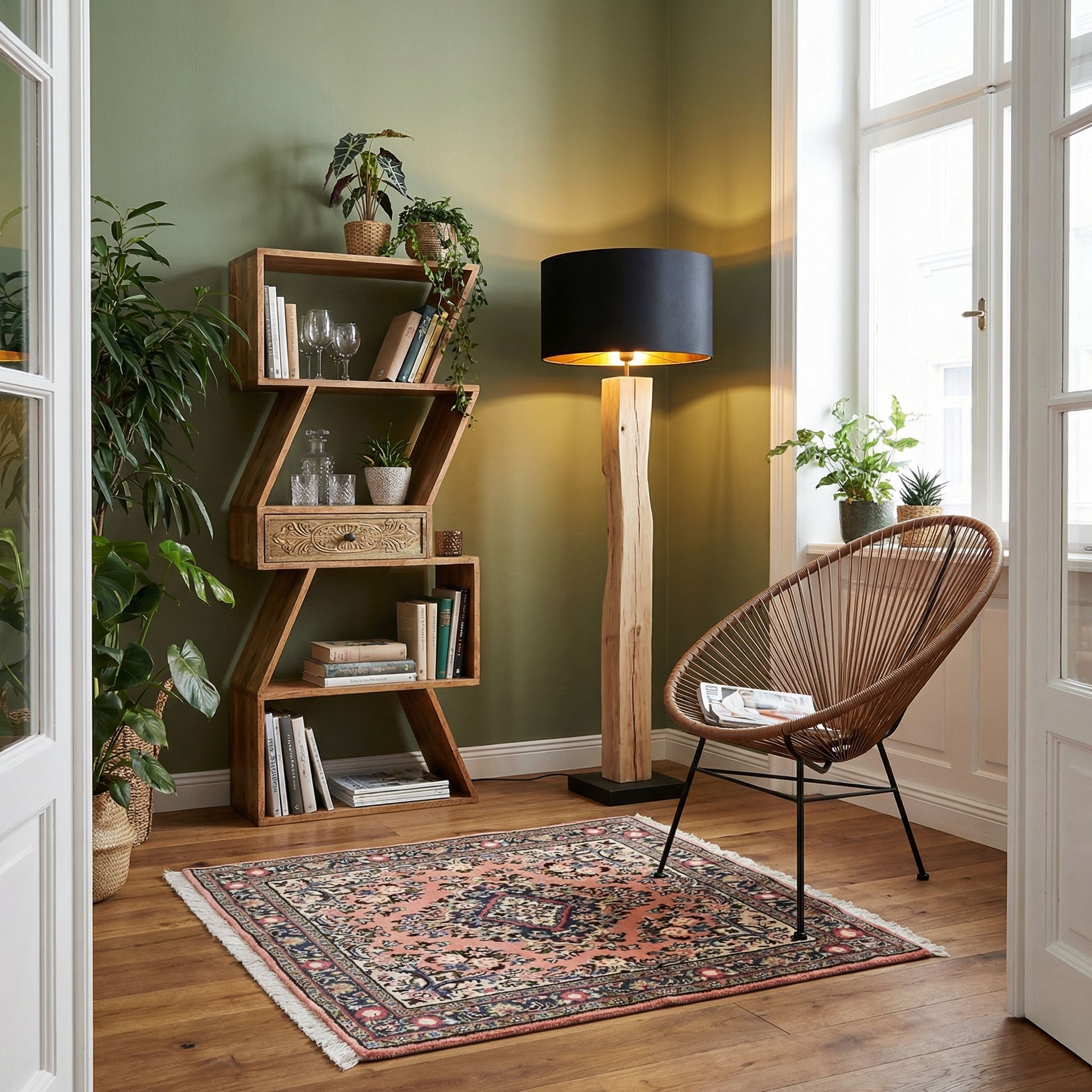 Da der Ethno-Style den Fokus auf authentisches Handwerk und kulturelle Artefakte aus aller Welt legt, ist dieser handgeknüpfte Teppich aus der Provinz Arak das ideale Herzstück. Die feine Knüpfung und die traditionellen Ornamente erzählen eine Geschichte von Herkunft und Handwerkskunst, die in diesem Einrichtungsstil zentral ist. Die warmen Erd- und Gewürztöne des Teppichs lassen sich hervorragend mit dunklen Hölzern, geflochtenen Körben und Masken oder Skulpturen kombinieren. Er fungiert hier nicht nur als Bodenbelag, sondern als echtes Kulturgut, das dem Raum Tiefe und globalen Charakter verleiht.