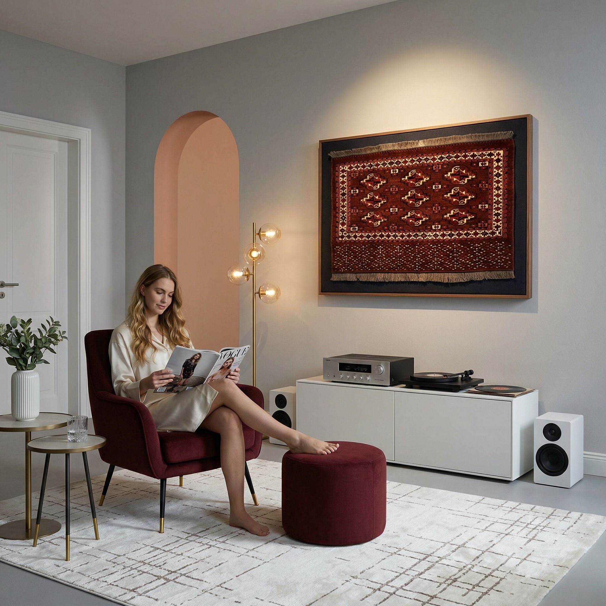 Im BOHO-Style entfaltet dieser Jomuth-Teppich seinen vollen Charme, indem er dem Raum eine Ebene von lebendiger Geschichte und entspannter Eleganz verleiht. Die komplexen geometrischen Rautenmuster und die satten Bordeaux-Nuancen harmonieren wunderbar mit der Lässigkeit von Makramee, üppigen Grünpflanzen und Vintage-Möbeln. Seine Herkunft als funktionales Nomaden-Objekt gibt ihm genau jenen „unperfekten“, handgemachten Charakter, der für den individuellen Bohemian-Look essenziell ist. Dieser textile Schatz fungiert als einladender Ankerpunkt, der den Raum sofort gemütlich, kunstvoll und kuratiert wirken lässt.