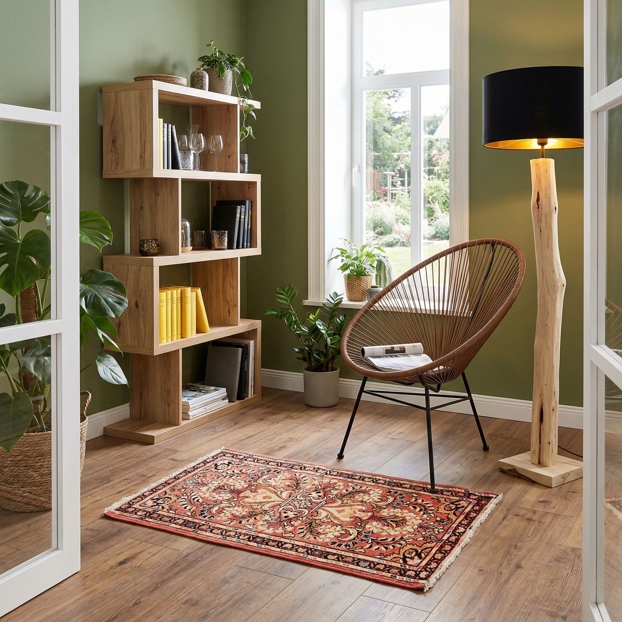 Der individuelle und unkonventionelle Boho-Style lebt von einem gekonnten Mix aus Vintage-Fundstücken und farbenfrohen Textilien, weshalb dieser Teppich hier perfekt hineinpasst. Die warmen Pflanzenfarben und das verspielte florale Muster harmonieren wunderbar mit Rattanmöbeln, vielen Pflanzen und Kissen in unterschiedlichen Texturen. Durch das Alter von ca. 1940 bringt der Teppich genau jene Geschichte und Seele mit, die für den "Bohemian"-Look essenziell sind, um eine zwanglose Atmosphäre zu schaffen. Zudem unterstreicht die glanzvolle Schafwolle die gemütliche und entspannte Stimmung, die diesen Wohnstil ausmacht.