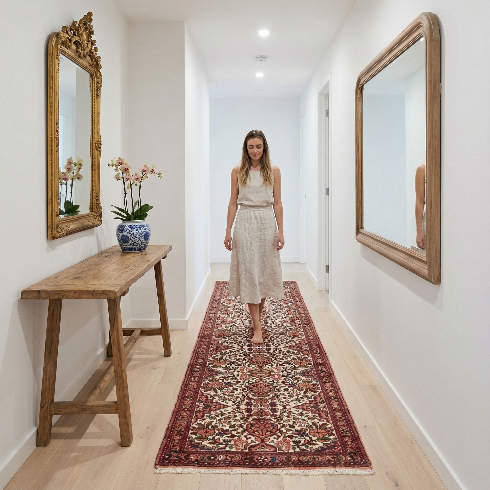 Dieser Teppich passt hervorragend zum New-Country-Style, da er durch seine helle Grundfarbe und die feinen Muster eine gemütliche und zugleich frische ländliche Eleganz ausstrahlt. Die Kombination aus cremefarbenen Nuancen und den warmen Farbakzenten harmoniert wunderbar mit hellen Holzböden, Leinenstoffen und weißen Möbeln, die für diesen modernen Landhausstil typisch sind. Die strapazierfähige Schafwolle sorgt für jene rustikale Bodenständigkeit und Wärme, die ein Zuhause im Country-Look so einladend und „bewohnt“ wirken lässt. Er wirkt nicht überladen, sondern setzt als klassischer Läufer einen stilvollen, traditionellen Akzent in einem ansonsten modern interpretierten Landhaus-Interieur.