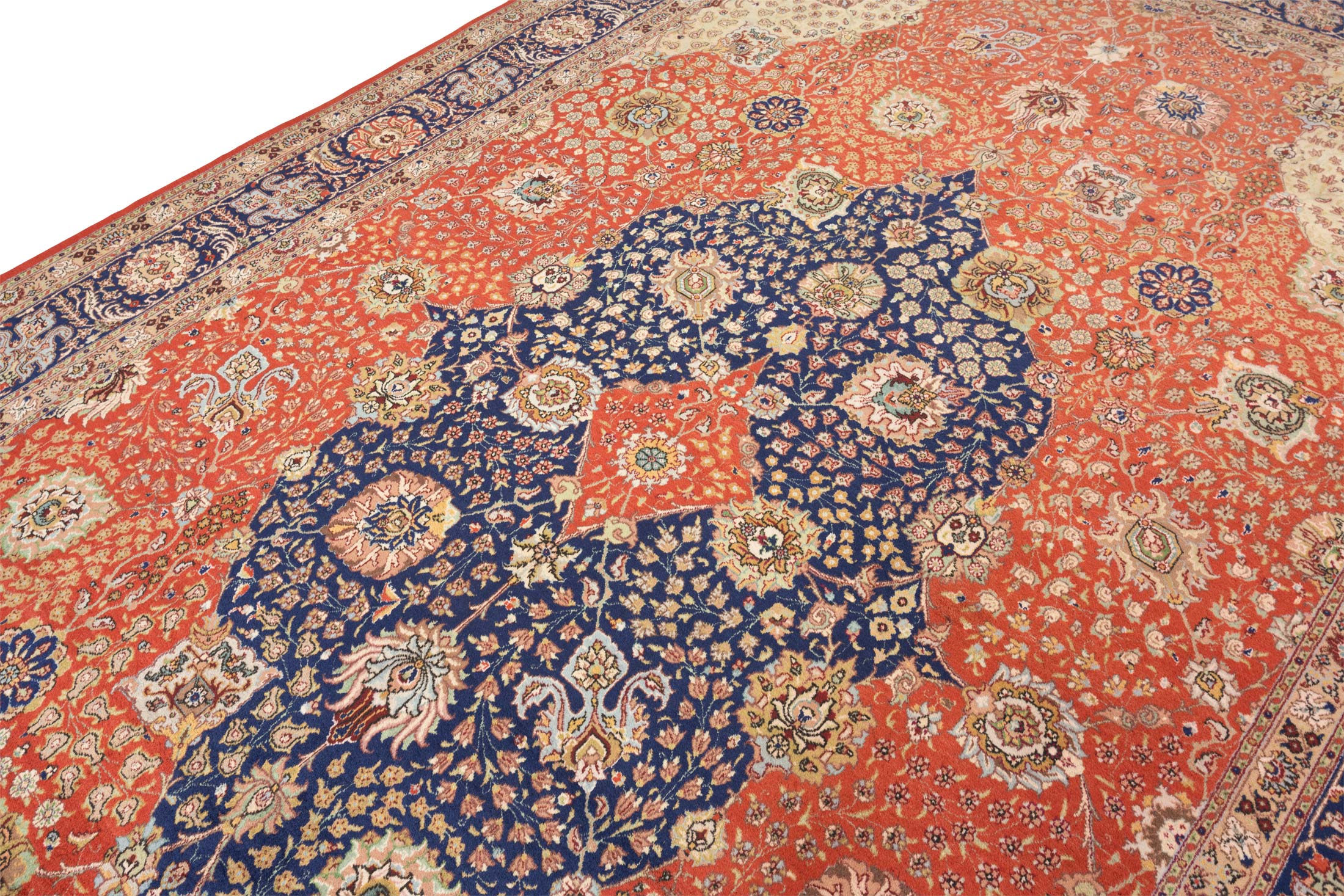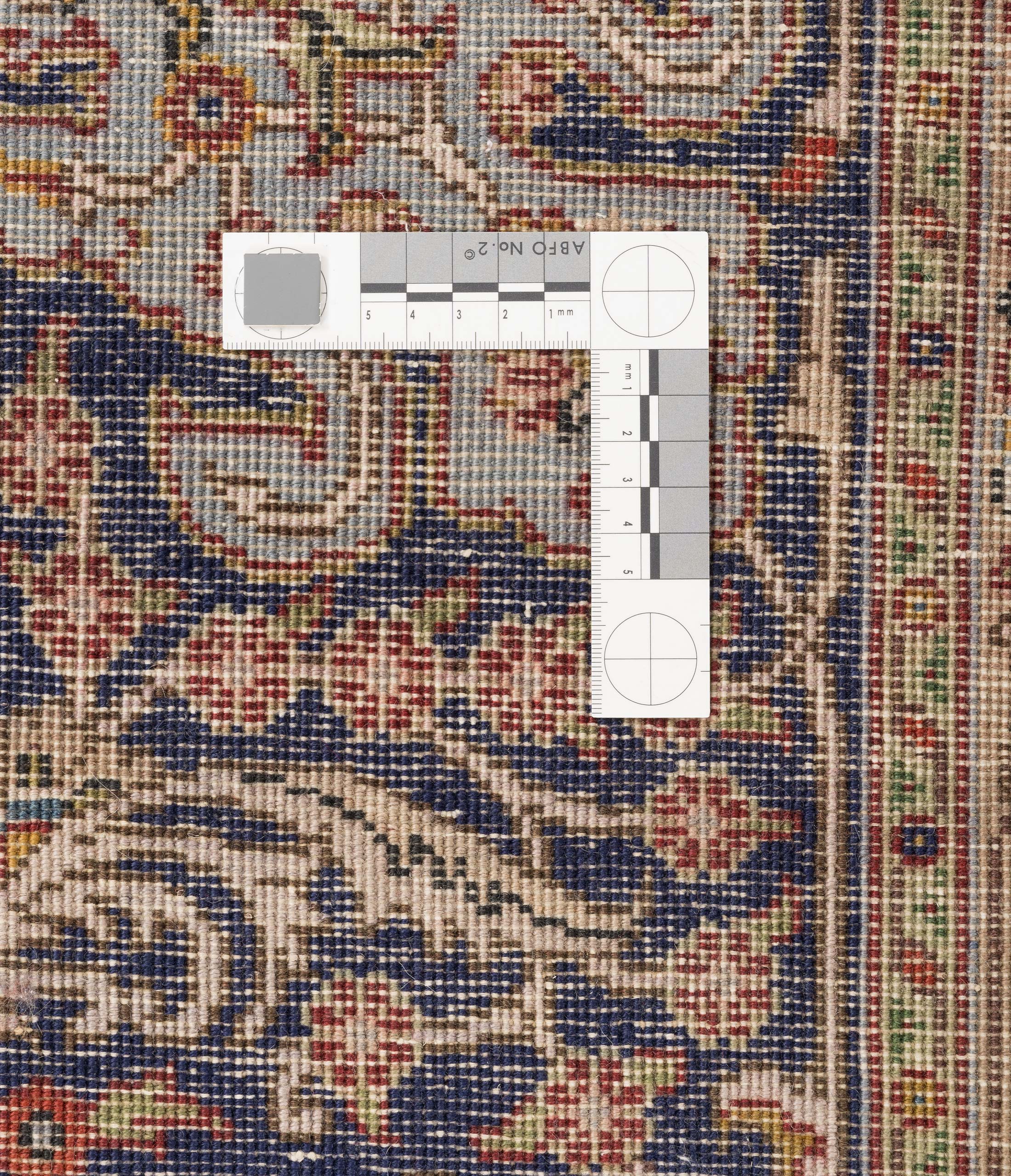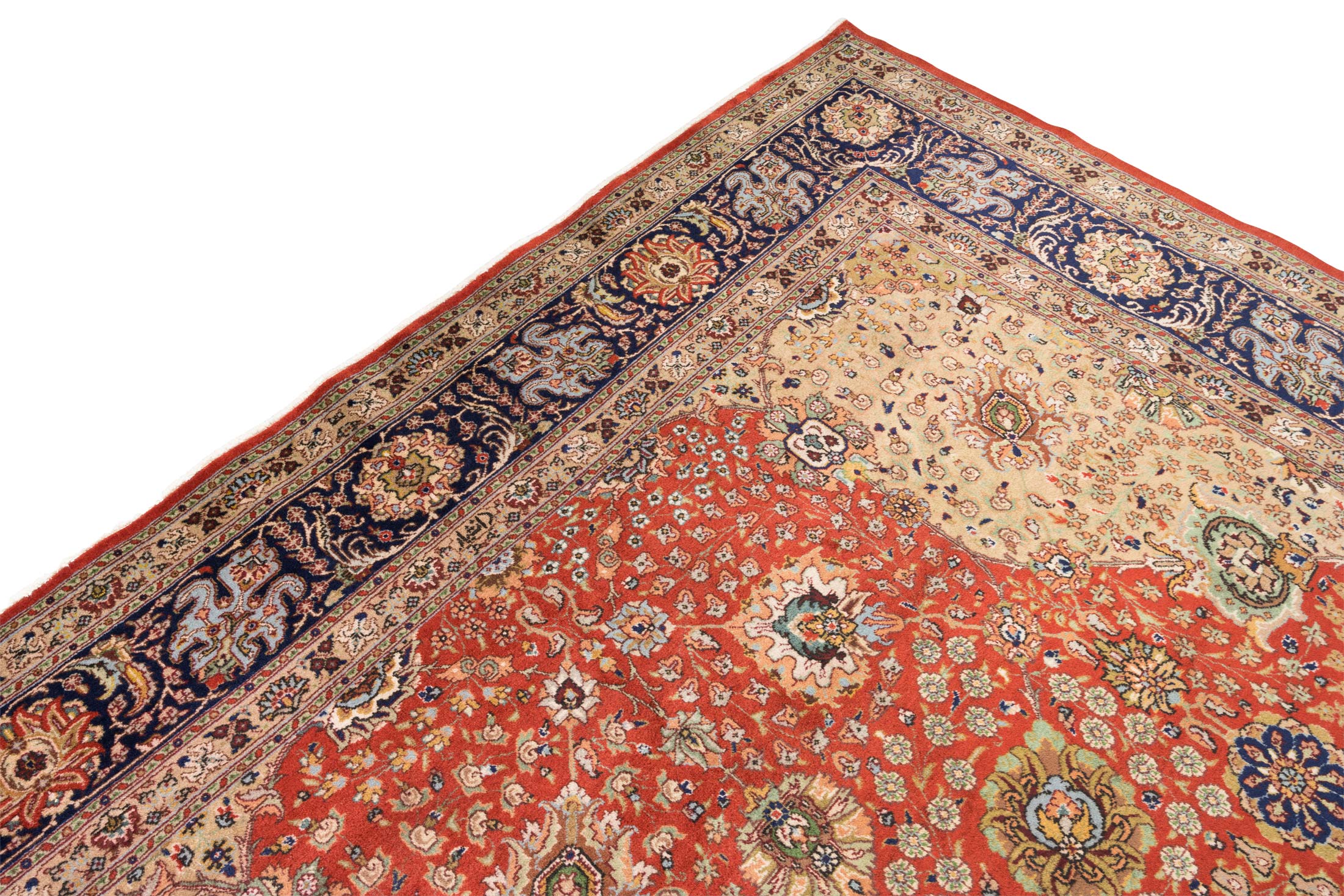 Dieser handgeknüpfte Teppich aus Täbriz zeigt sich in einer beeindruckenden Kombination aus kräftigem Rot als Hauptfarbe, ergänzt durch tiefes Blau und elegante Beigetöne. Sein florales Muster ist dicht und detailreich, typisch für die hochwertigen Täbriz-Teppiche. Mit einer beeindruckenden Knüpfdichte von ca. 240.000 Knoten pro Quadratmeter weist er eine feine Struktur auf, die für seine Langlebigkeit und Strapazierfähigkeit sorgt. Der Teppich, hergestellt um 1950, befindet sich in ...mehr Beschreibung