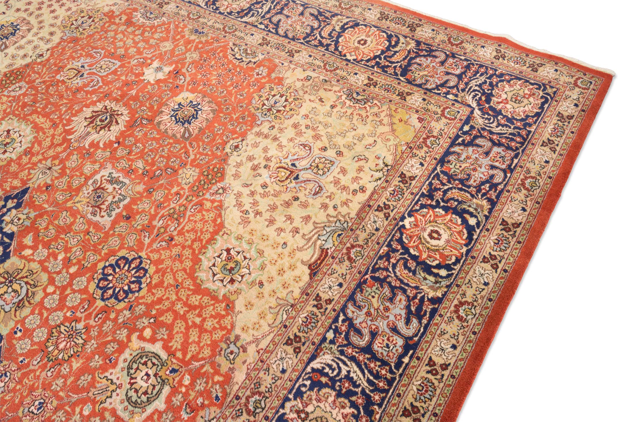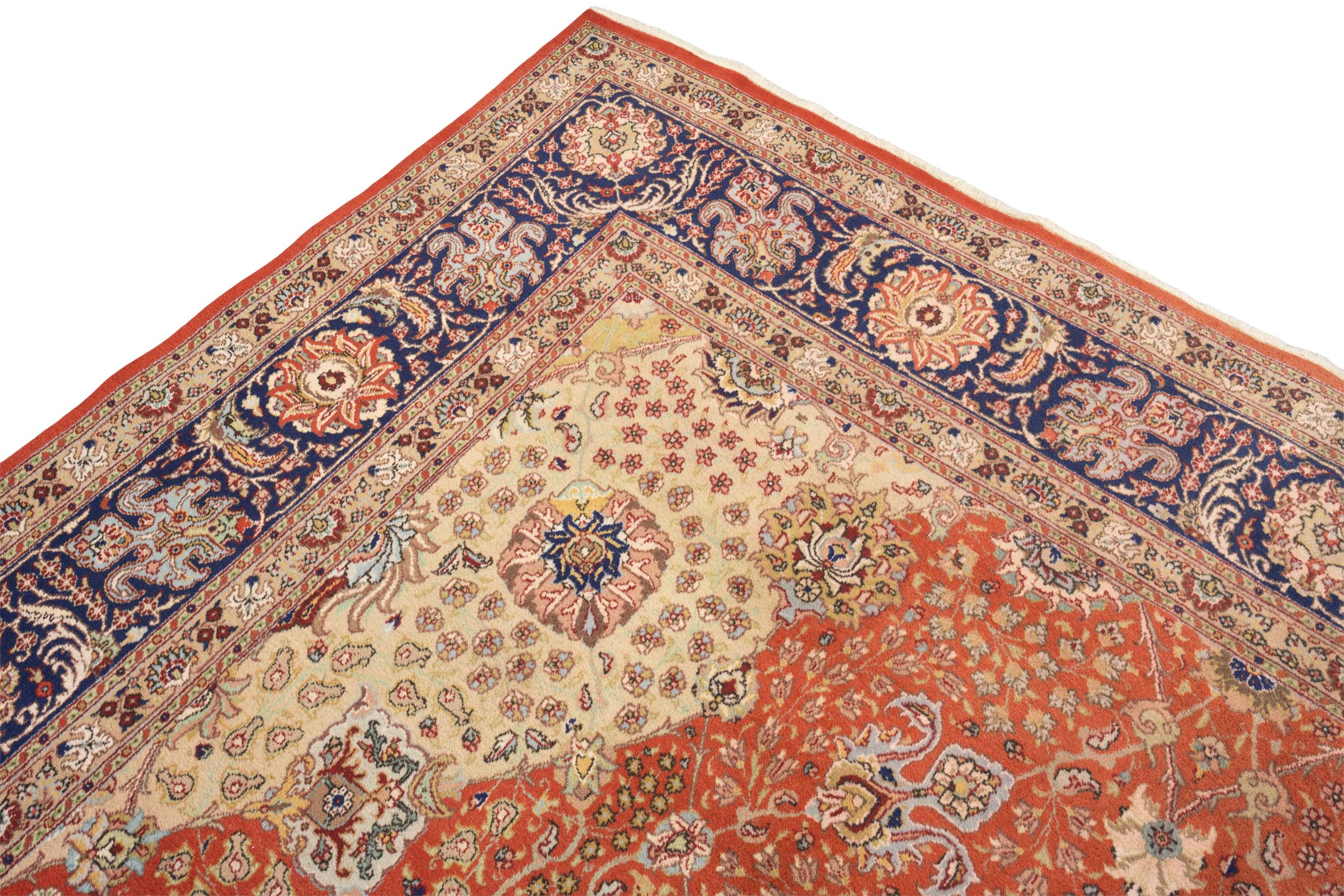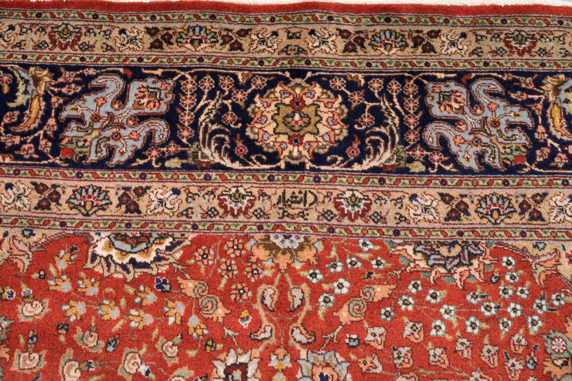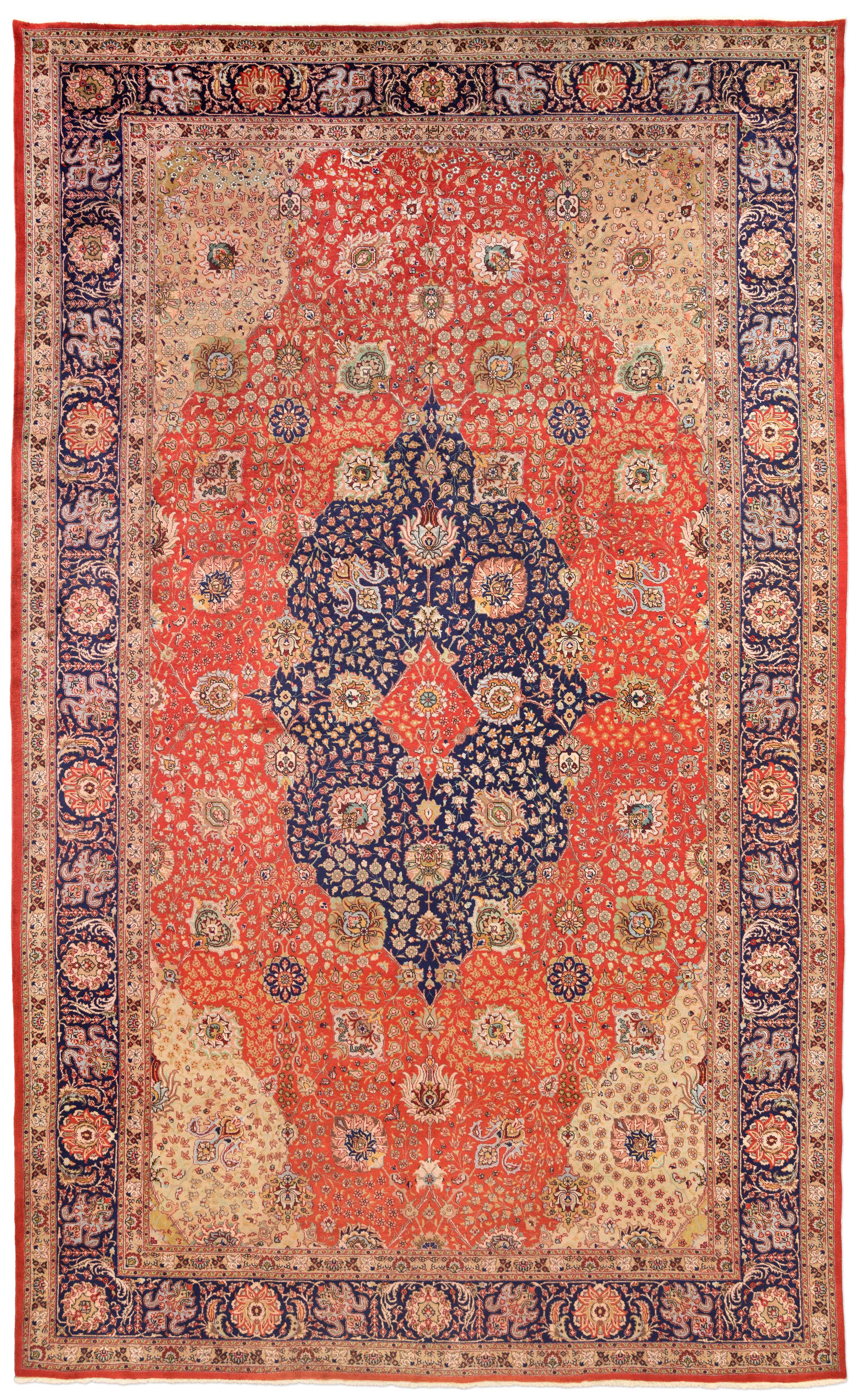 Dieser handgeknüpfte Teppich aus Täbriz zeigt sich in einer beeindruckenden Kombination aus kräftigem Rot als Hauptfarbe, ergänzt durch tiefes Blau und elegante Beigetöne. Sein florales Muster ist dicht und detailreich, typisch für die hochwertigen Täbriz-Teppiche. Mit einer beeindruckenden Knüpfdichte von ca. 240.000 Knoten pro Quadratmeter weist er eine feine Struktur auf, die für seine Langlebigkeit und Strapazierfähigkeit sorgt. Der Teppich, hergestellt um 1950, befindet sich in ...mehr Beschreibung