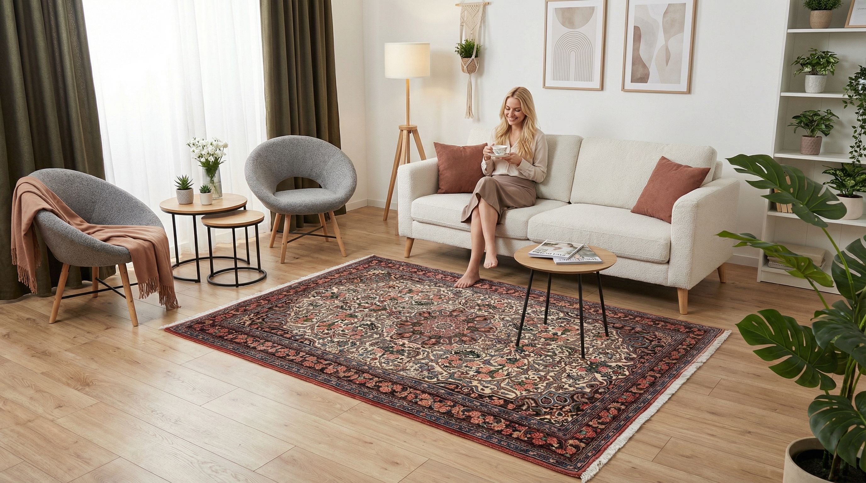 Die verspielten floralen Muster und die warme Farbpalette dieses Rosenbidjars harmonieren perfekt mit dem entspannten und unkonventionellen Mix des Boho-Styles. Da dieser Look von der Kombination aus Vintage-Fundstücken und textiler Vielfalt lebt, wirkt die detailreiche Handwerkskunst des Teppichs als authentischer Anker im Raum. Der cremefarbene Fond lässt die bunten Rosenmotive strahlen, ohne die typische eklektische Deko zu überladen. So fügt der Teppich genau jene Note von Gemütlichkeit und Geschichte hinzu, die den bohemischen Charakter ausmacht.