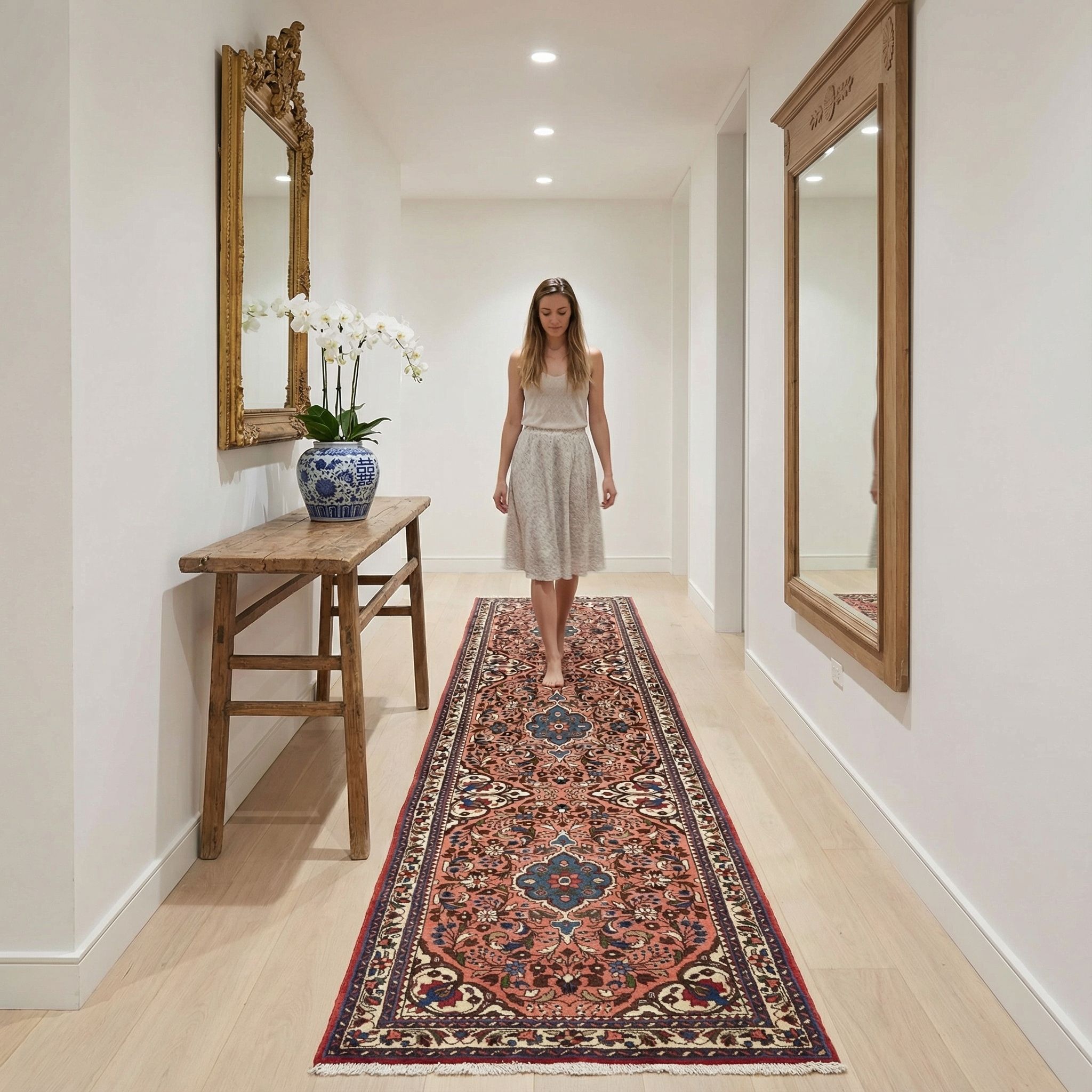 Da der Ethno-Style auf authentischem Handwerk und kulturellen Artefakten aus verschiedenen Regionen basiert, fügt sich dieser originale Hamedan-Läufer nahtlos in das Konzept ein. Die traditionellen persischen Motive und die nachweisbare Herkunft erzählen eine Geschichte, die den globalen Charakter der Einrichtung unterstreicht. Seine erdigen und warmen Farbtöne bilden eine perfekte Basis für dunkle Hölzer, Leder und dekorative Objekte aus fremden Kulturen. Der Teppich wirkt hier als echtes Sammlerstück, das die Wertschätzung für traditionelle Handwerkskunst zelebriert.