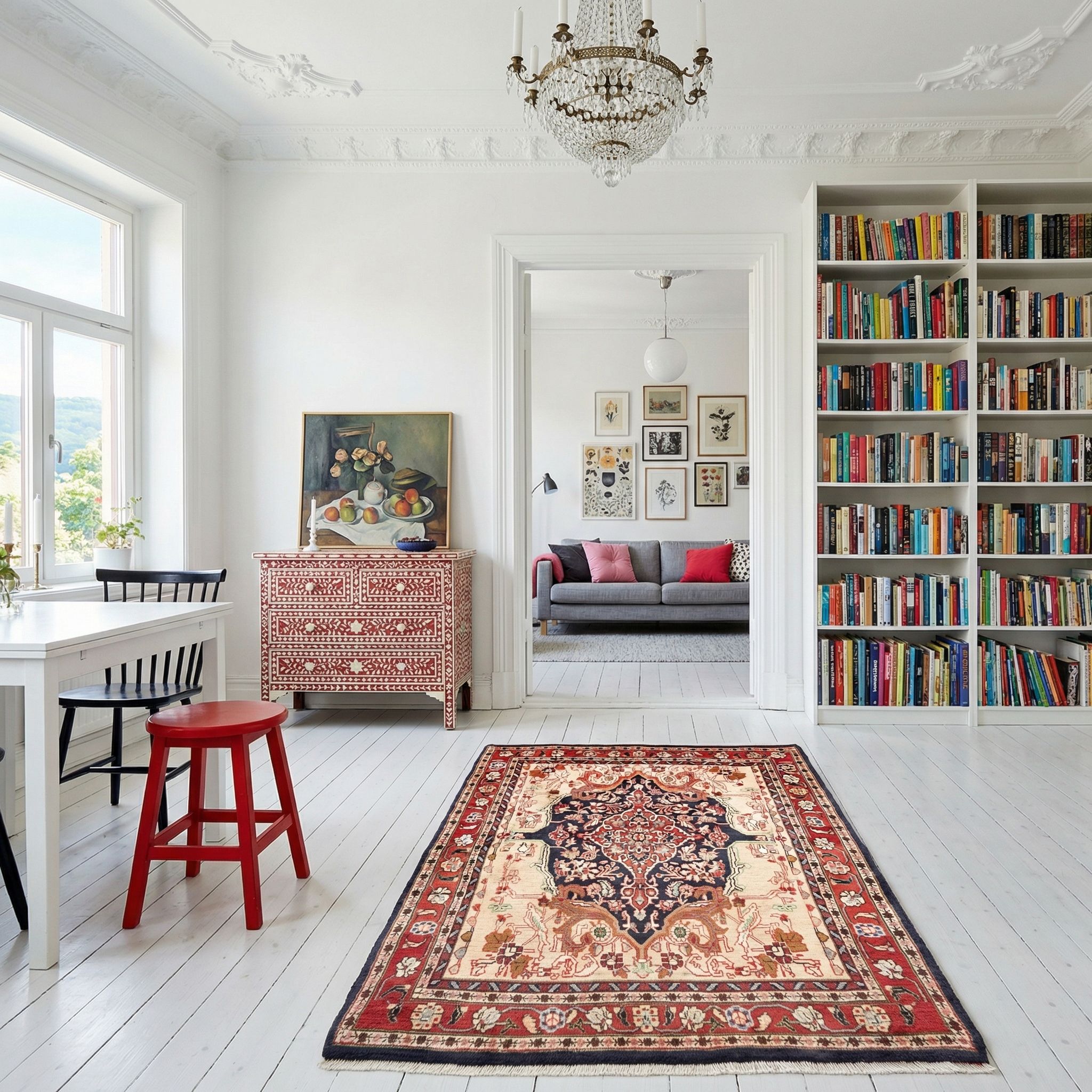In einem Industrial-Interieur, das oft von kühlem Beton, Metall und unverputzten Wänden dominiert wird, wirkt dieser Teppich als kraftvoller und wärmender Kontrast ("Stilbruch"). Das klassische Design und die satten Farben brechen die Strenge des Raumes auf und verleihen dem Loft-Charakter eine dringend benötigte wohnliche Note. Da der Industrial-Style oft Altes mit Neuem mischt, passt die Provenienz aus den 1960er Jahren perfekt zum Konzept der Beständigkeit und Geschichte. Als extrem strapazierfähiges Stück hält er zudem der oft raueren Nutzung in weitläufigen, offenen Wohnbereichen problemlos stand.