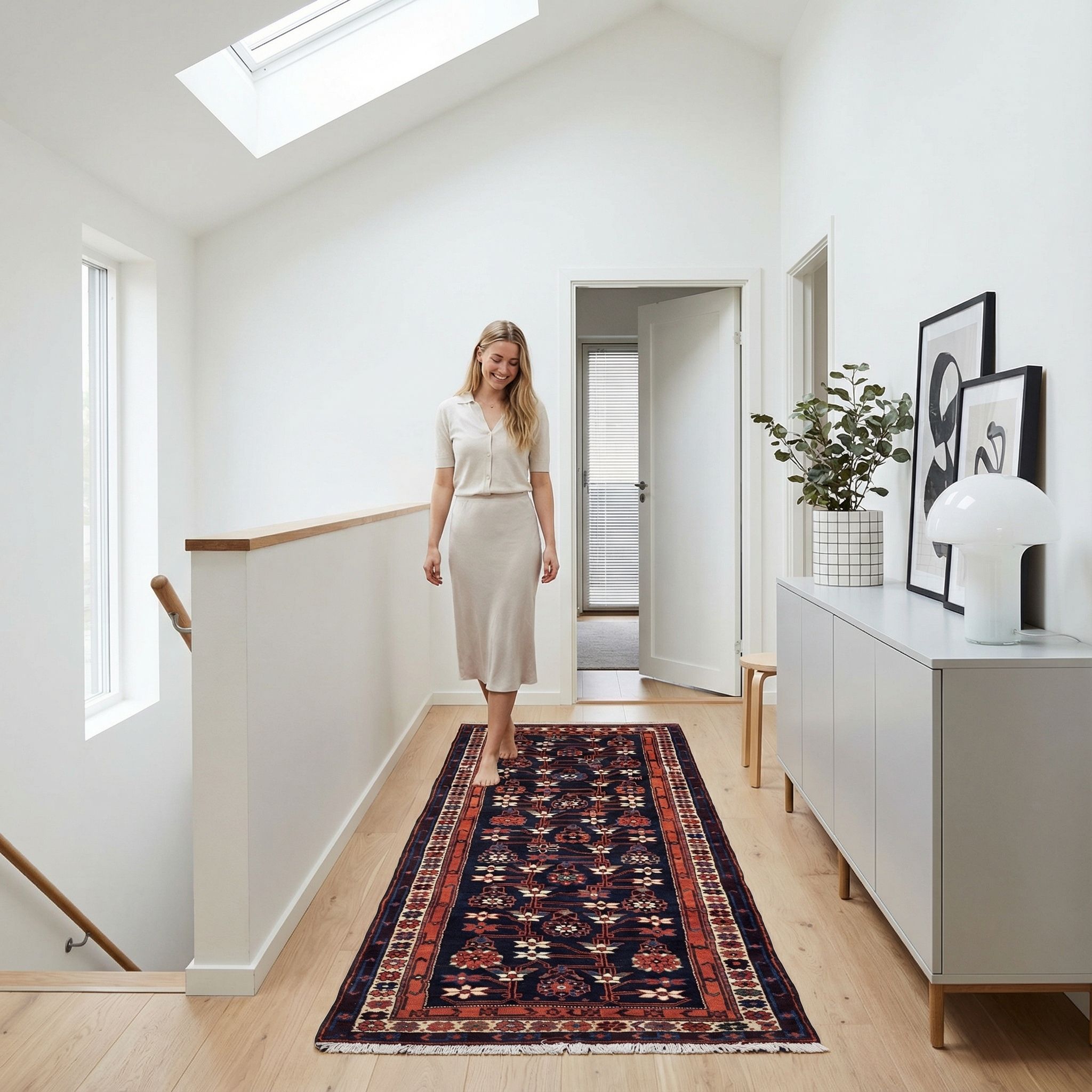 Dieser handgeknüpfte Lori-Teppich aus dem Iran vereint traditionelle Kunstfertigkeit und natürliche Materialien. Die Hauptfarbe ist ein tiefes Mitternachtsblau, das die Basis für das faszinierende Design bildet. Akzentuiert wird dieses Blau durch ein warmes Rostrot, das in den floralen Mustern und den Rändern auftaucht. Hinzu kommen ein elegantes Cremeweiß, das die floralen Elemente hervorhebt, sowie ein lebendiges Himmelblau, das subtile Akzente setzt.
