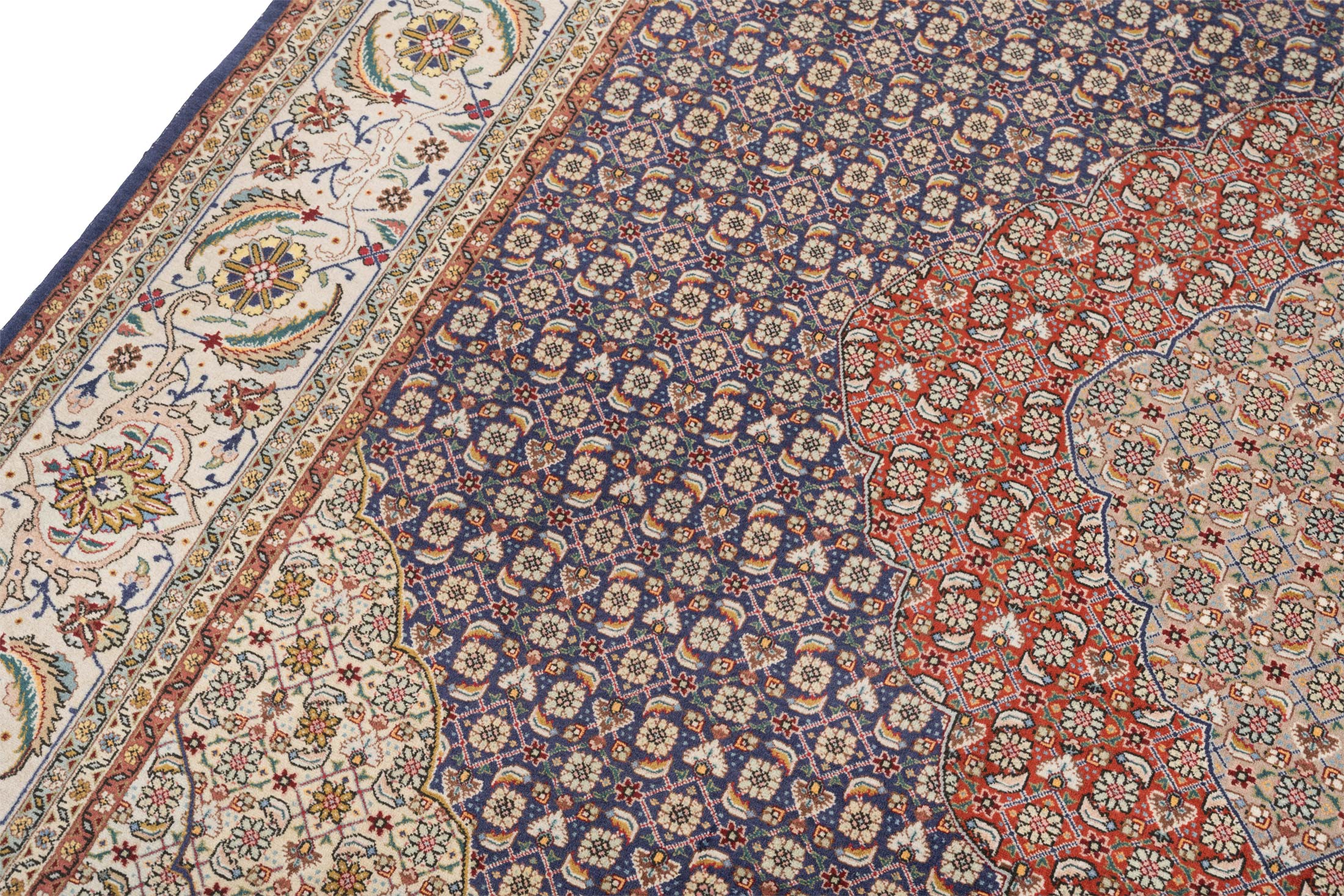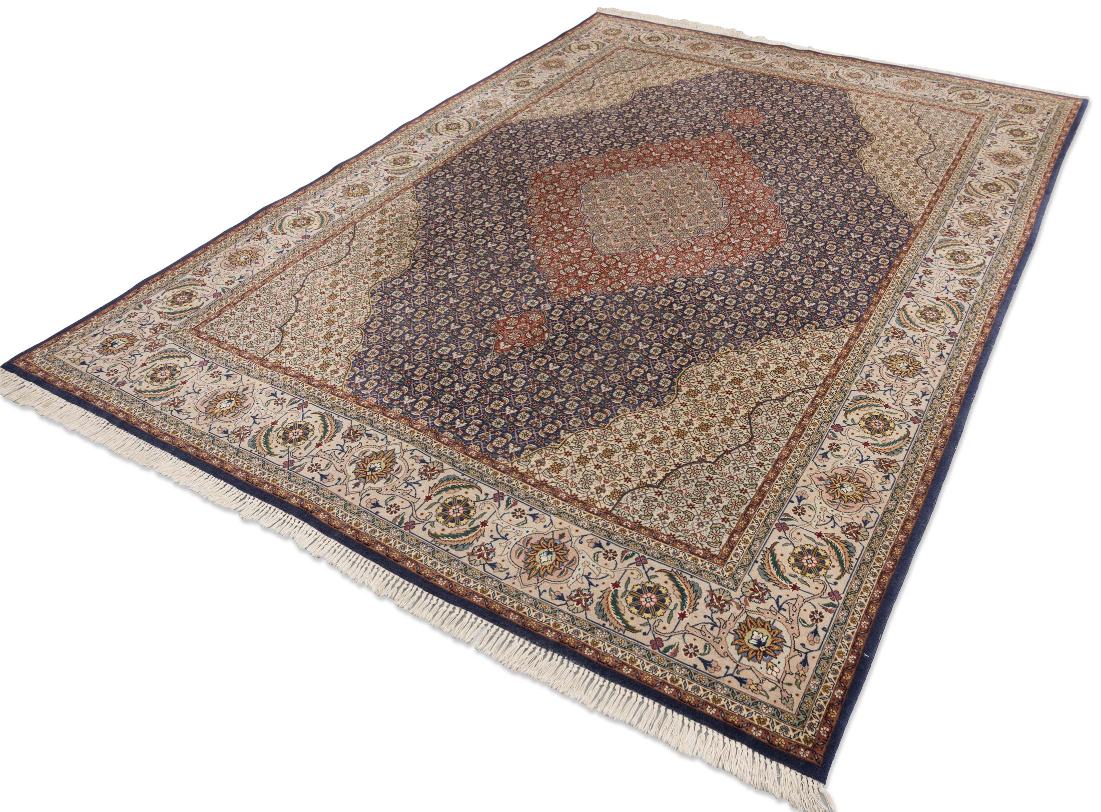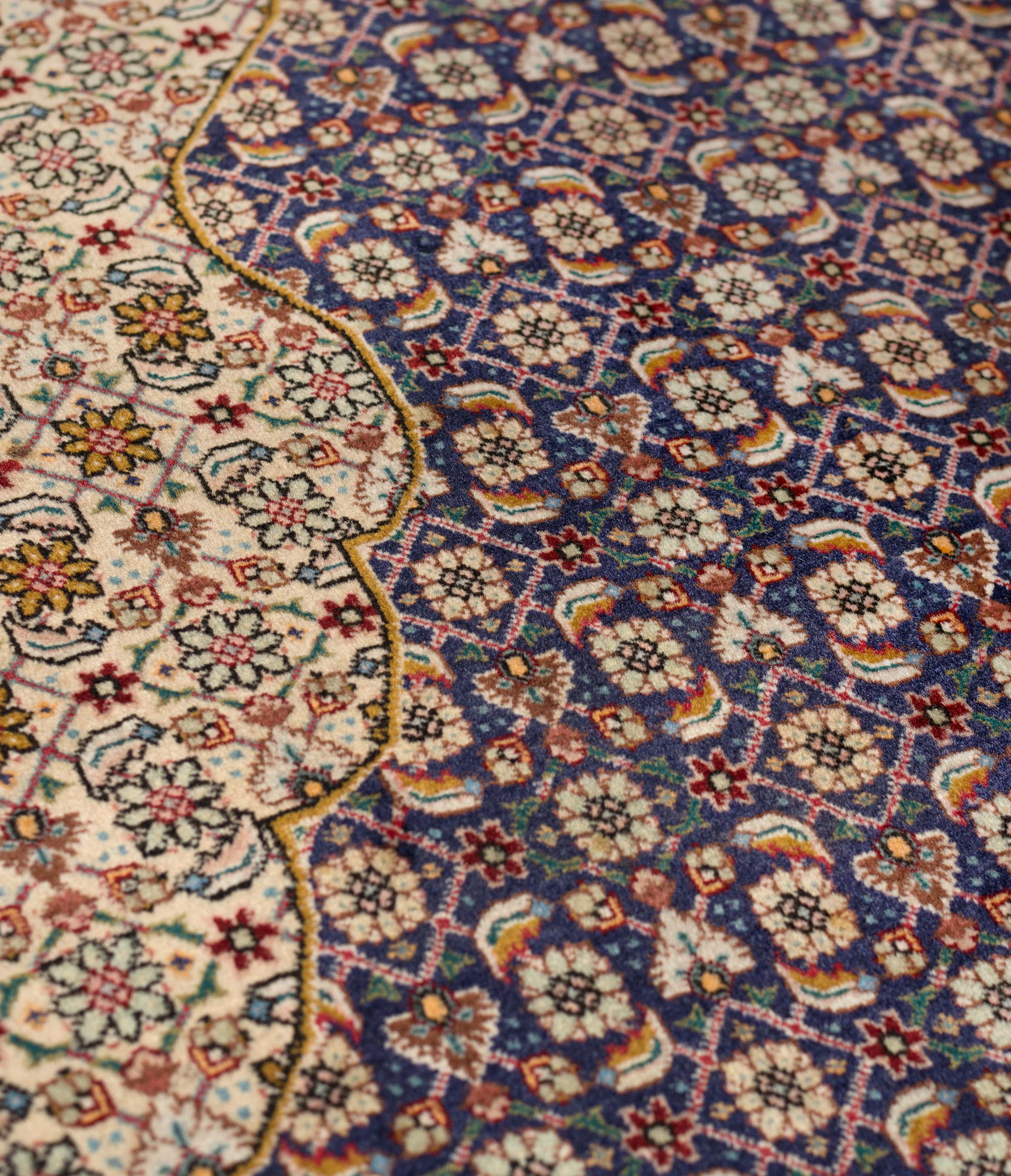 Dieser handgeknüpfte Täbriz-Teppich aus den 1950er Jahren besticht durch seine herausragende Qualität und feine Knüpfung mit etwa 490.000 Knoten pro qm. Die Hauptfarbe des Teppichs ist ein tiefes Blau, das elegant mit warmen Rosttönen und sanftem Creme harmoniert. Die Musterung zeigt dichte, florale Motive, die typisch für Täbriz-Teppiche sind, und verleiht dem Stück eine zeitlose Eleganz. Die natürliche Materialwahl, darunter feine Baumwolle und kostbare Wolle, unterstreicht die ...mehr Beschreibung