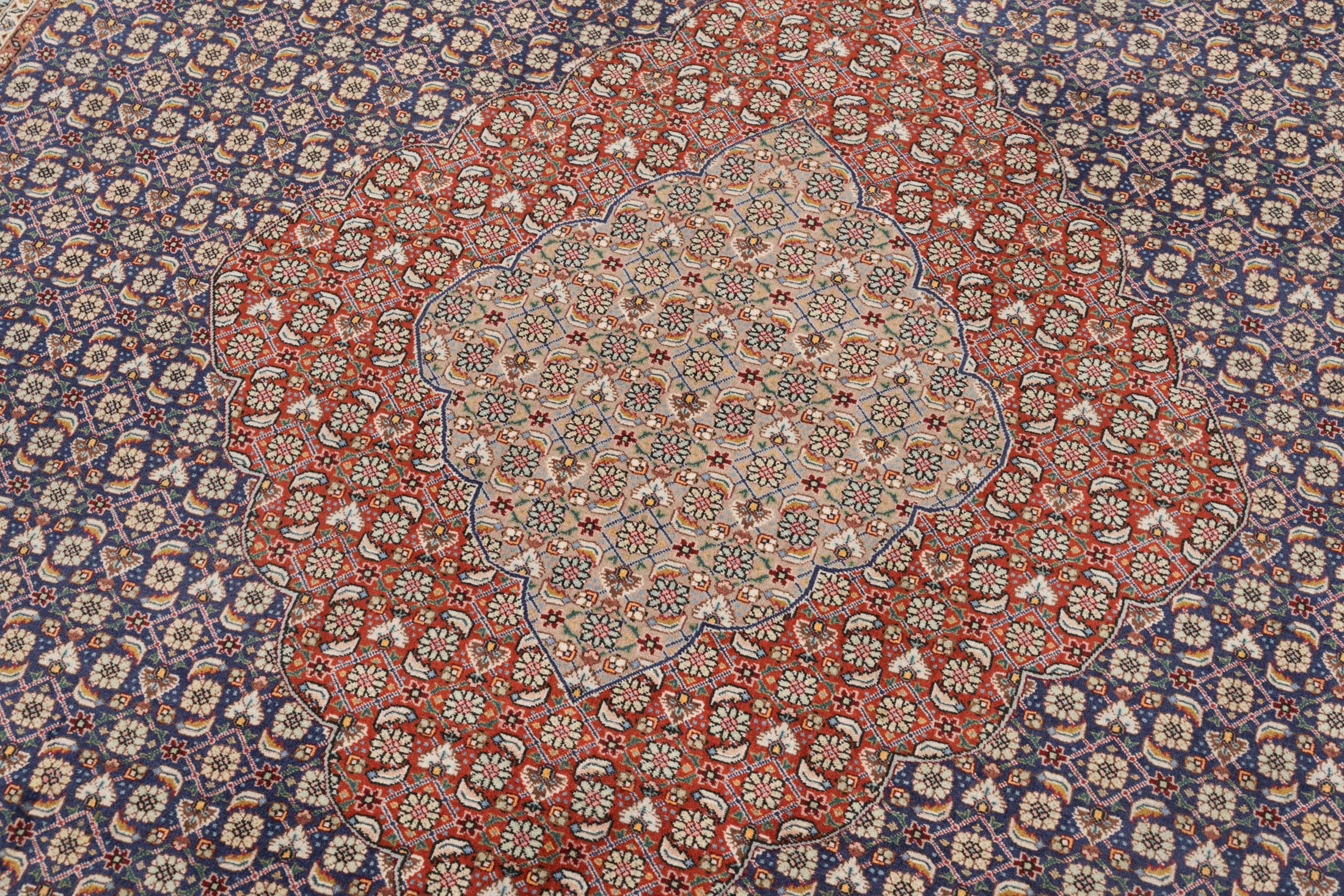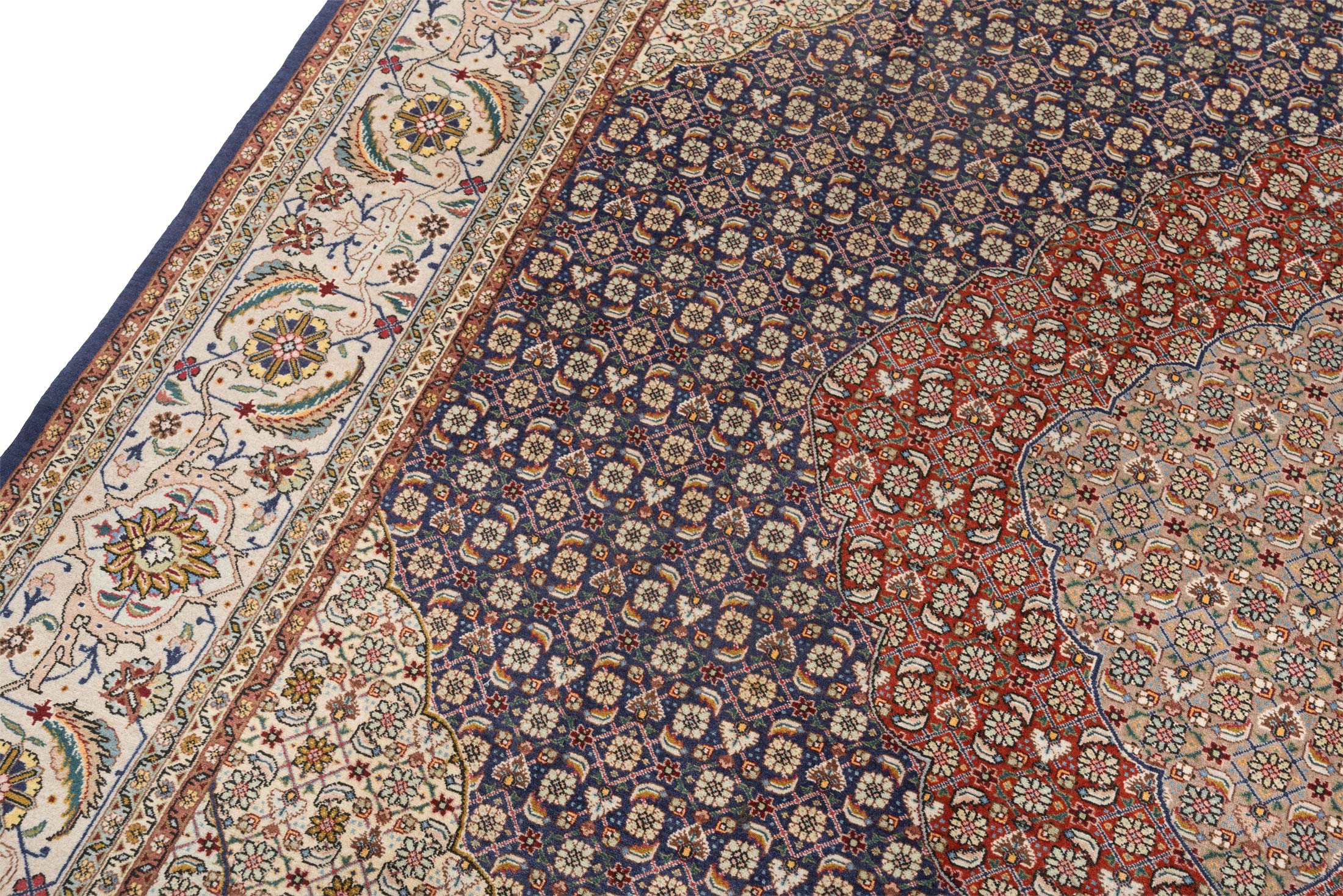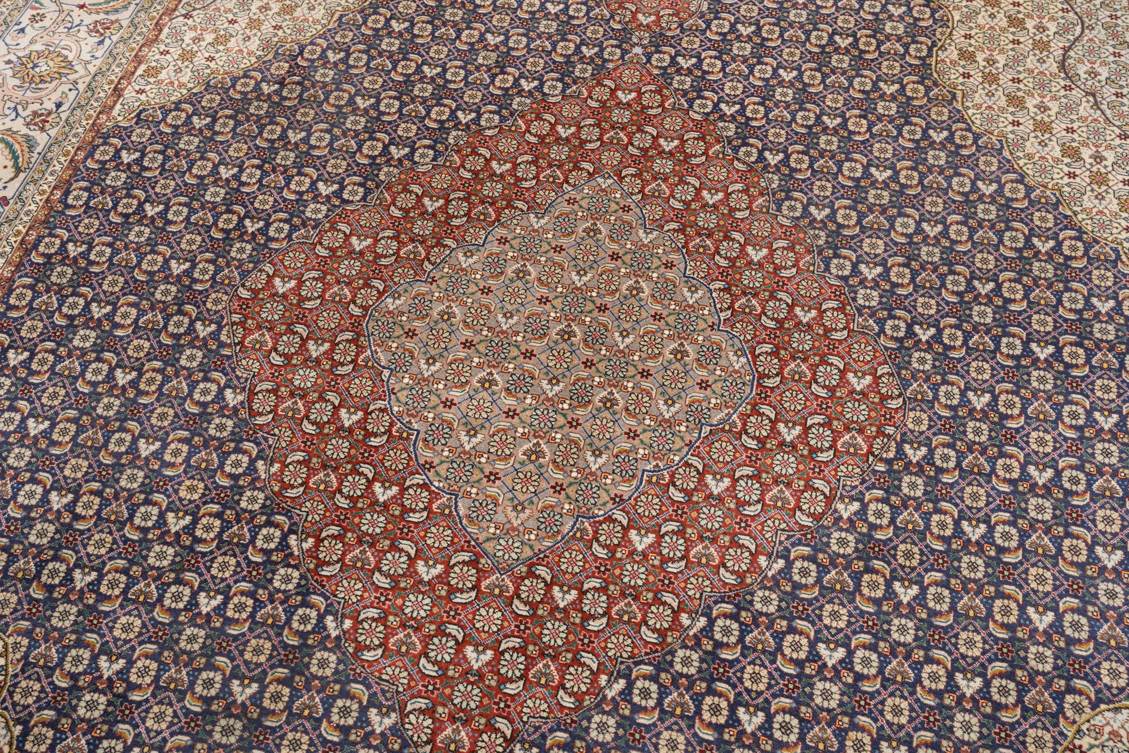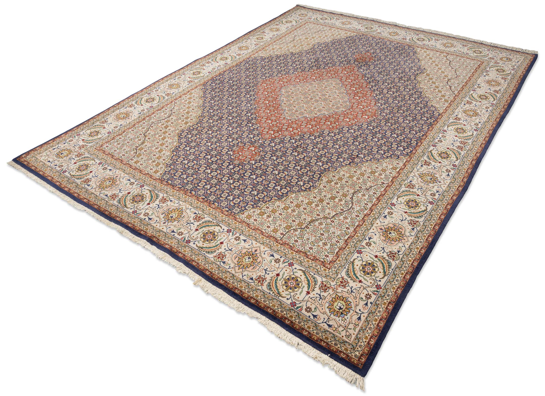 Dieser handgeknüpfte Täbriz-Teppich aus den 1950er Jahren besticht durch seine herausragende Qualität und feine Knüpfung mit etwa 490.000 Knoten pro qm. Die Hauptfarbe des Teppichs ist ein tiefes Blau, das elegant mit warmen Rosttönen und sanftem Creme harmoniert. Die Musterung zeigt dichte, florale Motive, die typisch für Täbriz-Teppiche sind, und verleiht dem Stück eine zeitlose Eleganz. Die natürliche Materialwahl, darunter feine Baumwolle und kostbare Wolle, unterstreicht die ...mehr Beschreibung