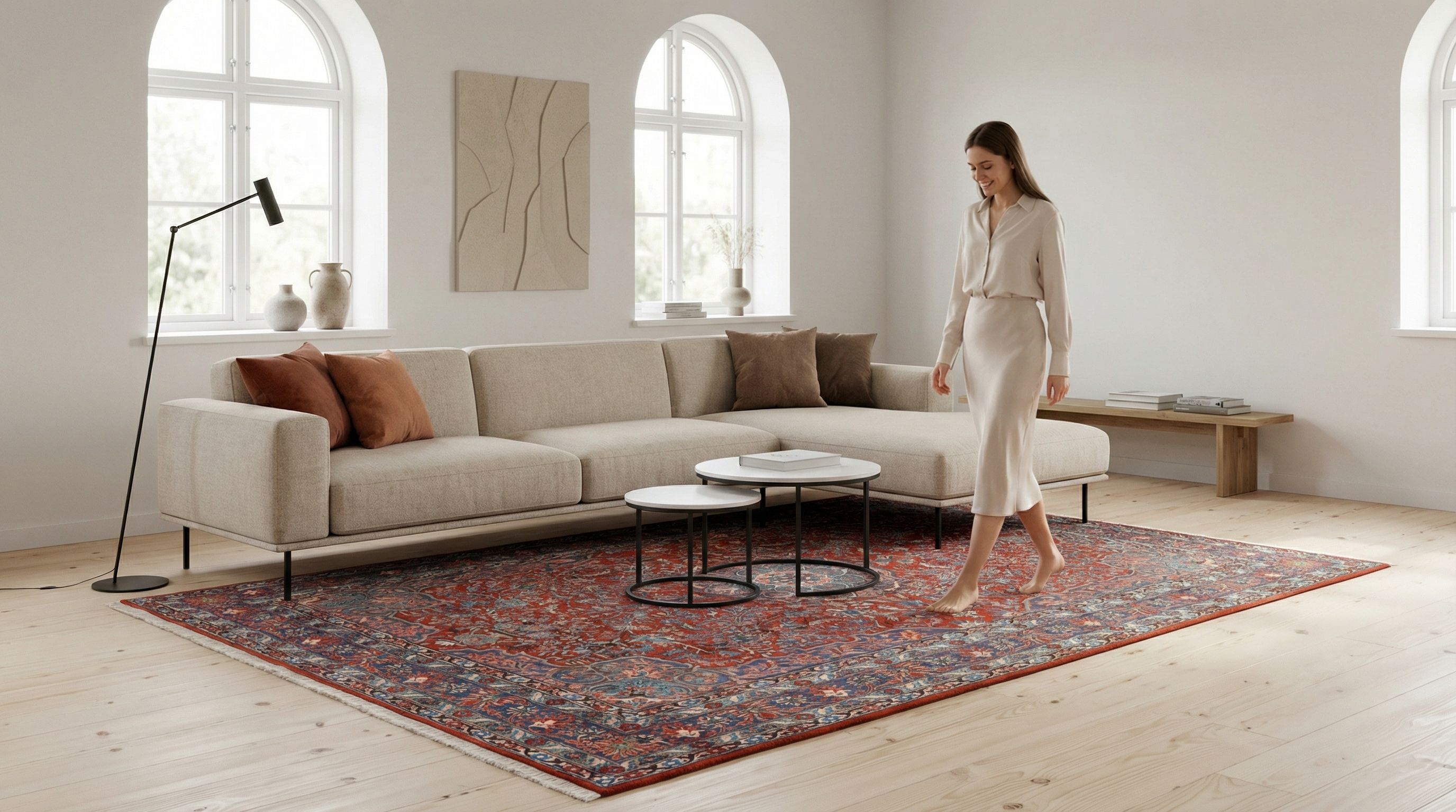 In einem zeitgenössischen, oft minimalistisch gehaltenen Interieur wirkt dieser feine Perserteppich als exklusives Statement-Piece und bricht bewusst mit den sonst klaren, geraden Linien. Die hohe Knotendichte von ca. 360.000 Knoten und die klassische Ästhetik verleihen einem modernen Raum sofortige Wertigkeit und verhindern eine zu sterile oder kühle Ausstrahlung. Das Zusammenspiel aus dem tiefen Rot des Teppichs und schlichten, modernen Designermöbeln erzeugt eine spannungsgeladene Dynamik zwischen Alt und Neu. Er fungiert hier als Kunstwerk auf dem Boden, das den Raum erdet und ihm eine individuelle, kuratierte Note verleiht.
